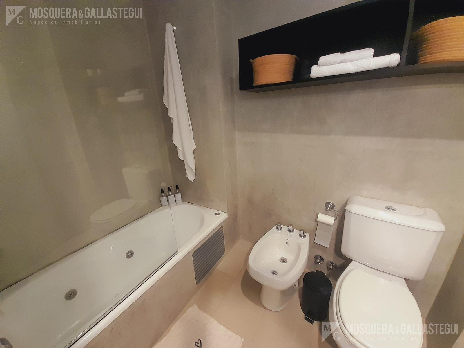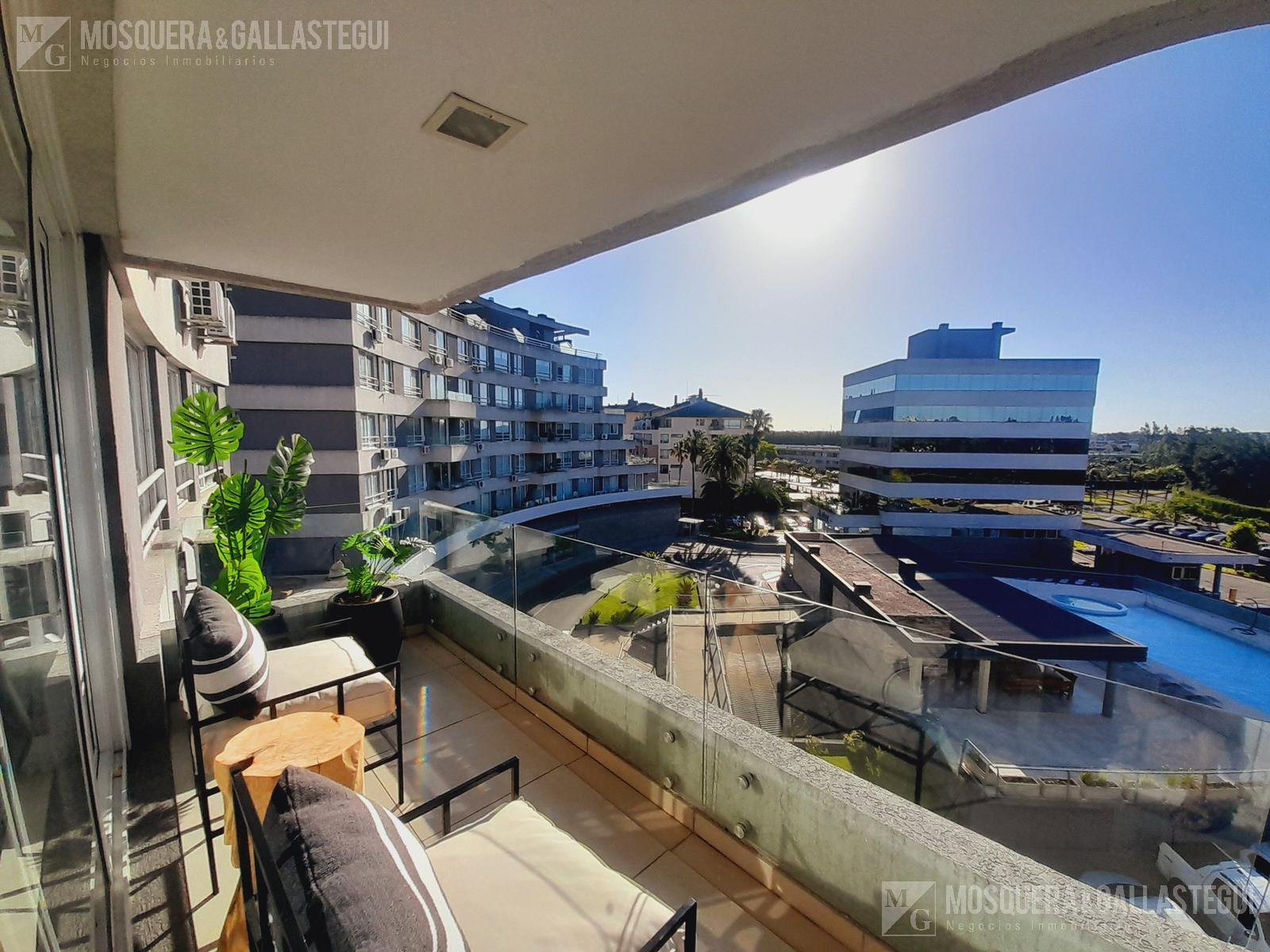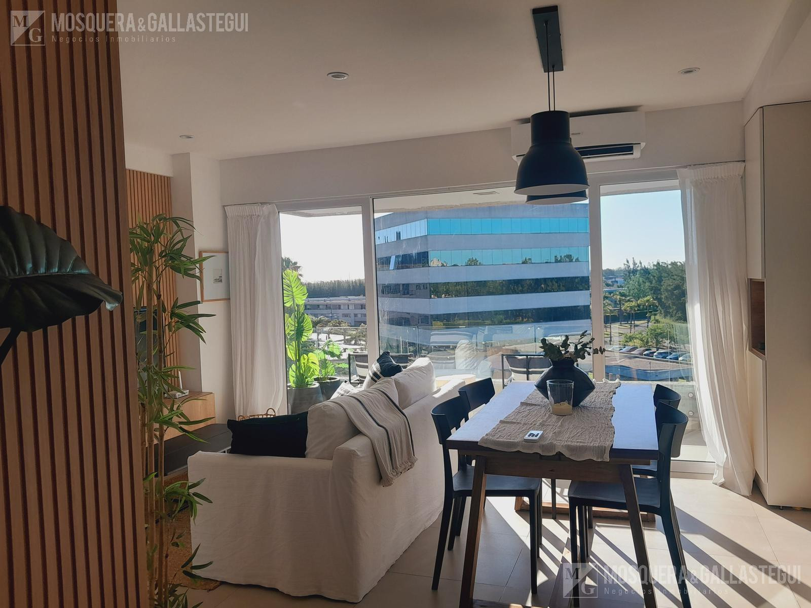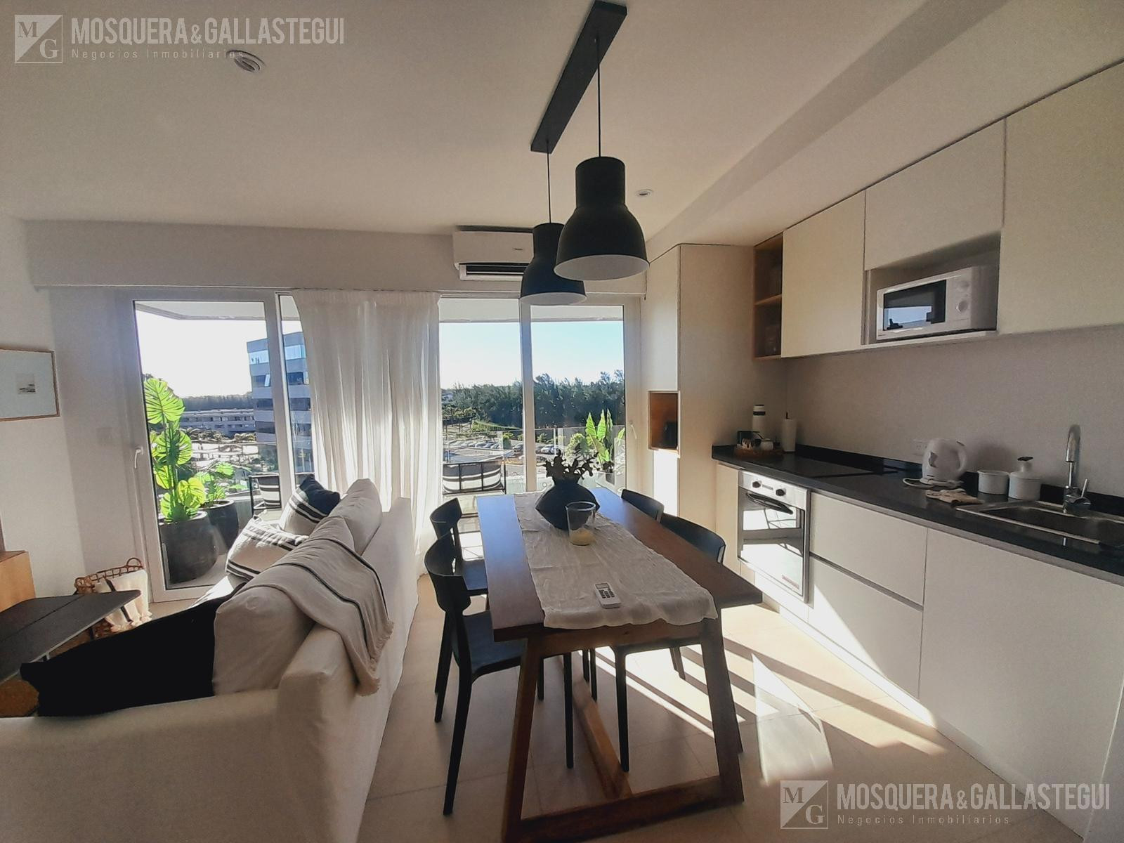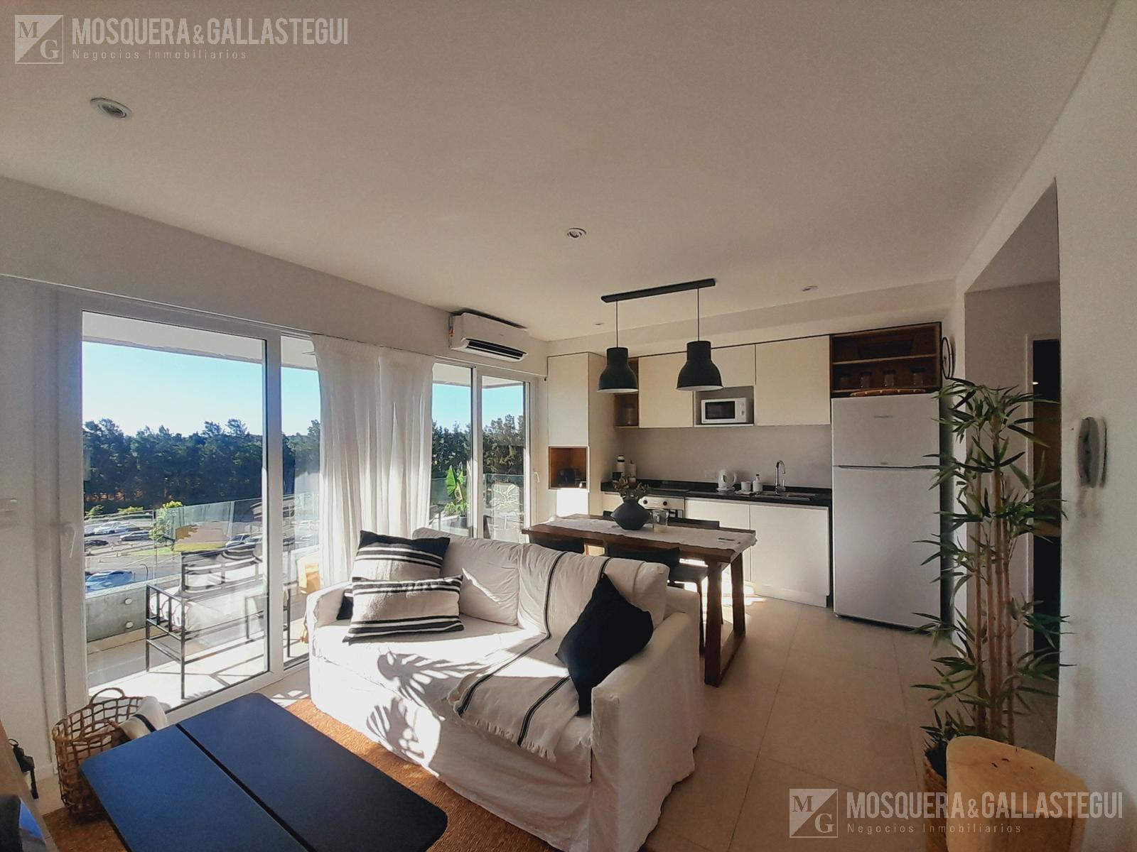 Two-room apartment in Vista Bahía with a hall and open-plan living-dining area with integrated kitchen opening onto a long balcony with open views over the pool area. Includes a guest toilet and an en-suite bedroom with views of the river and the bay, fitted wardrobes with sliding doors, and a bathroom with hydromassage. The apartment has a covered (assigned) parking space. The complex has two pools (one covered and one outdoor), a gym, a quincho with grills, and a laundry area, and offers direc