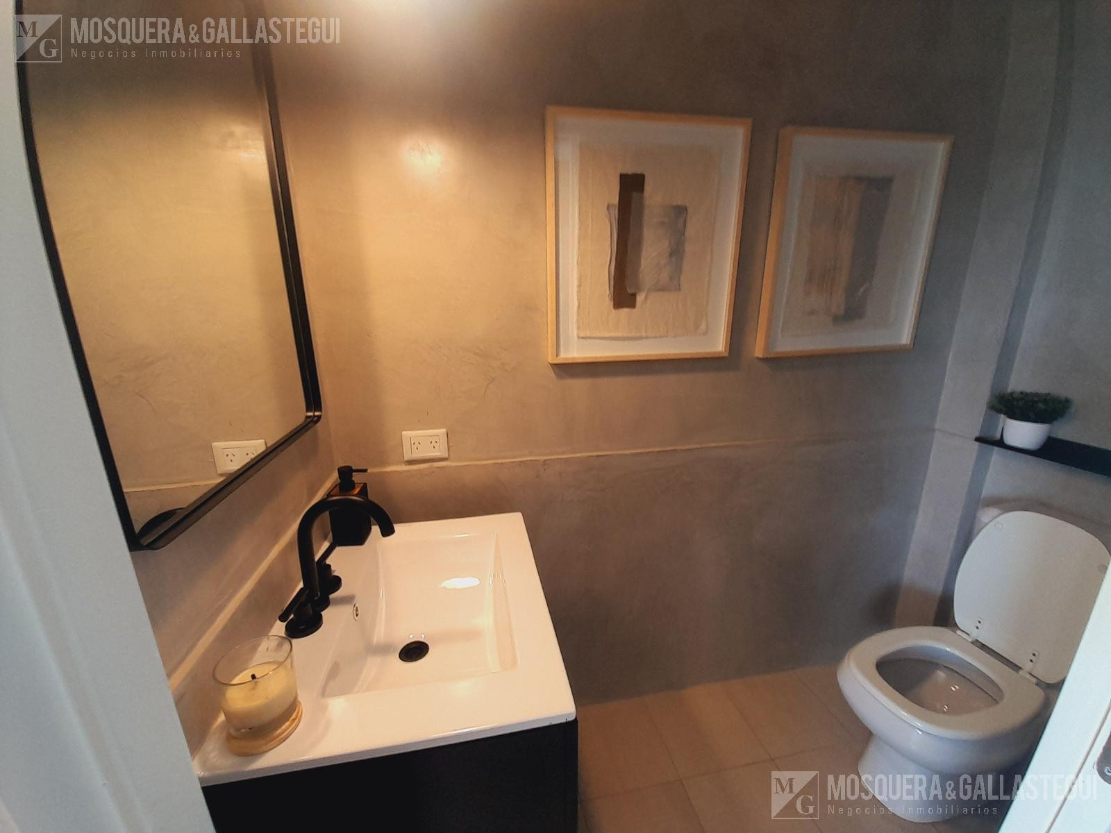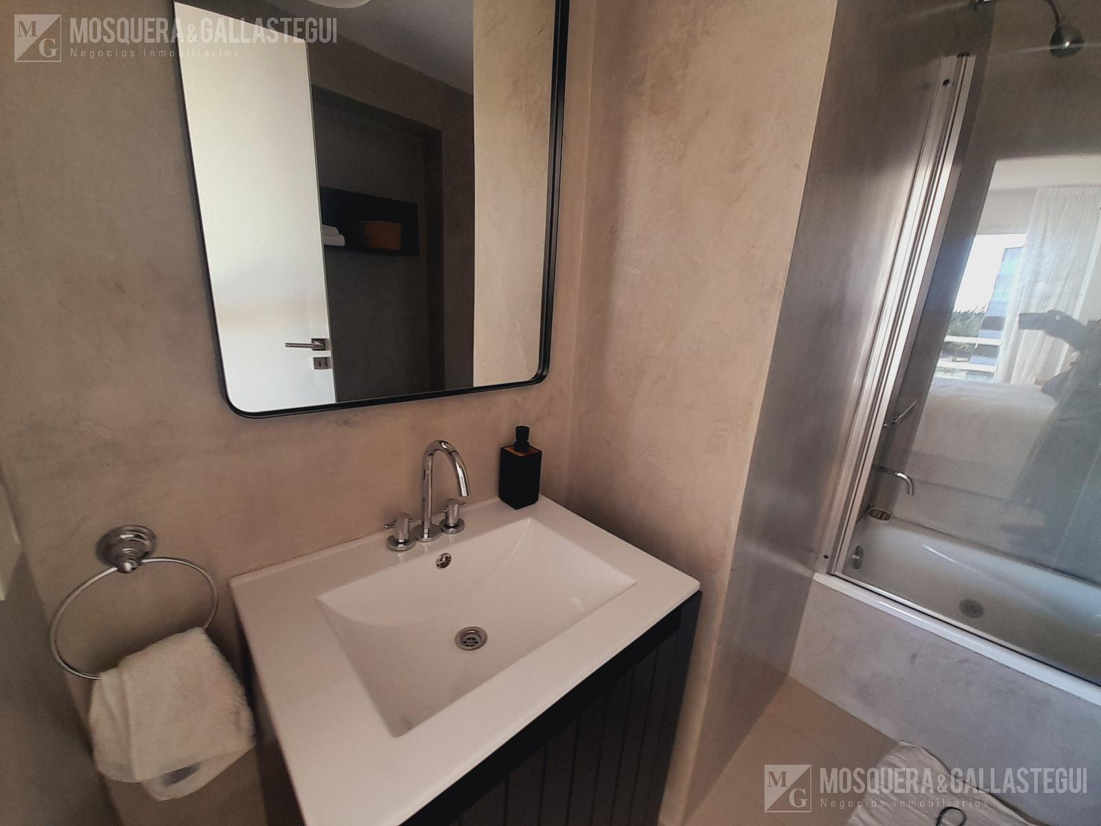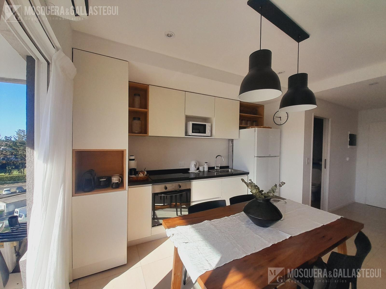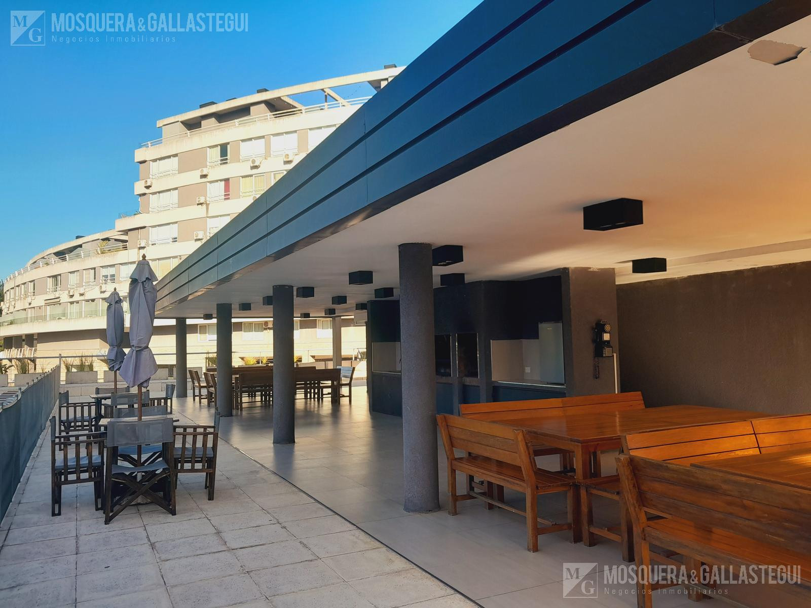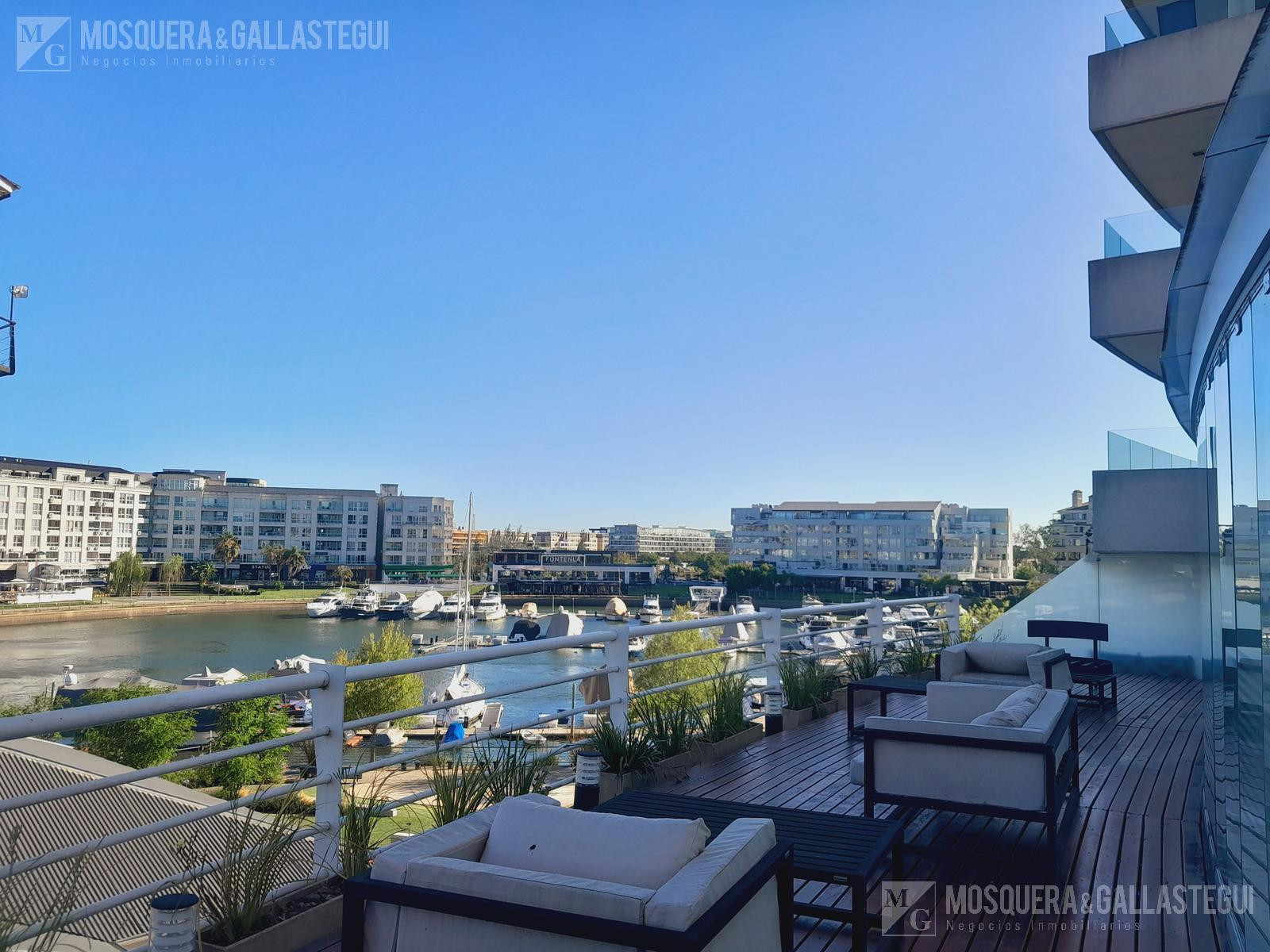 Two-room apartment in Vista Bahía with a hall and open-plan living-dining area with integrated kitchen opening onto a long balcony with open views over the pool area. Includes a guest toilet and an en-suite bedroom with views of the river and the bay, fitted wardrobes with sliding doors, and a bathroom with hydromassage. The apartment has a covered (assigned) parking space. The complex has two pools (one covered and one outdoor), a gym, a quincho with grills, and a laundry area, and offers direc