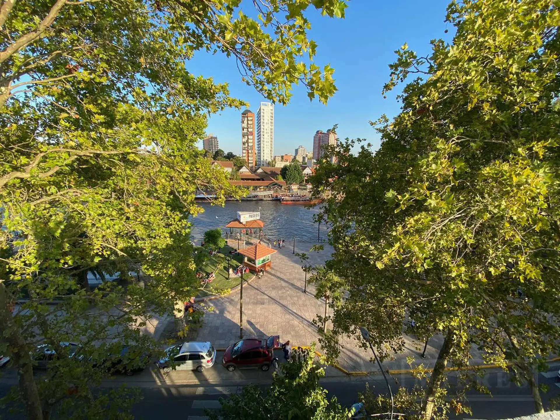 Two-room apartment for rent in Tigre Centro, fronting the river. Hall, living-dining room with access to a balcony with a grill, and an integrated kitchen with breakfast bar, oven and electric hot plate. A guest toilet and a bedroom en suite with a built-in wardrobe; assigned parking is available for ARS 70,000 per month with quarterly adjustment based on IPC. Building features include a rooftop terrace with a pool with direct views of the Rio Tigre channel, a residents' lounge (SUM) with glass