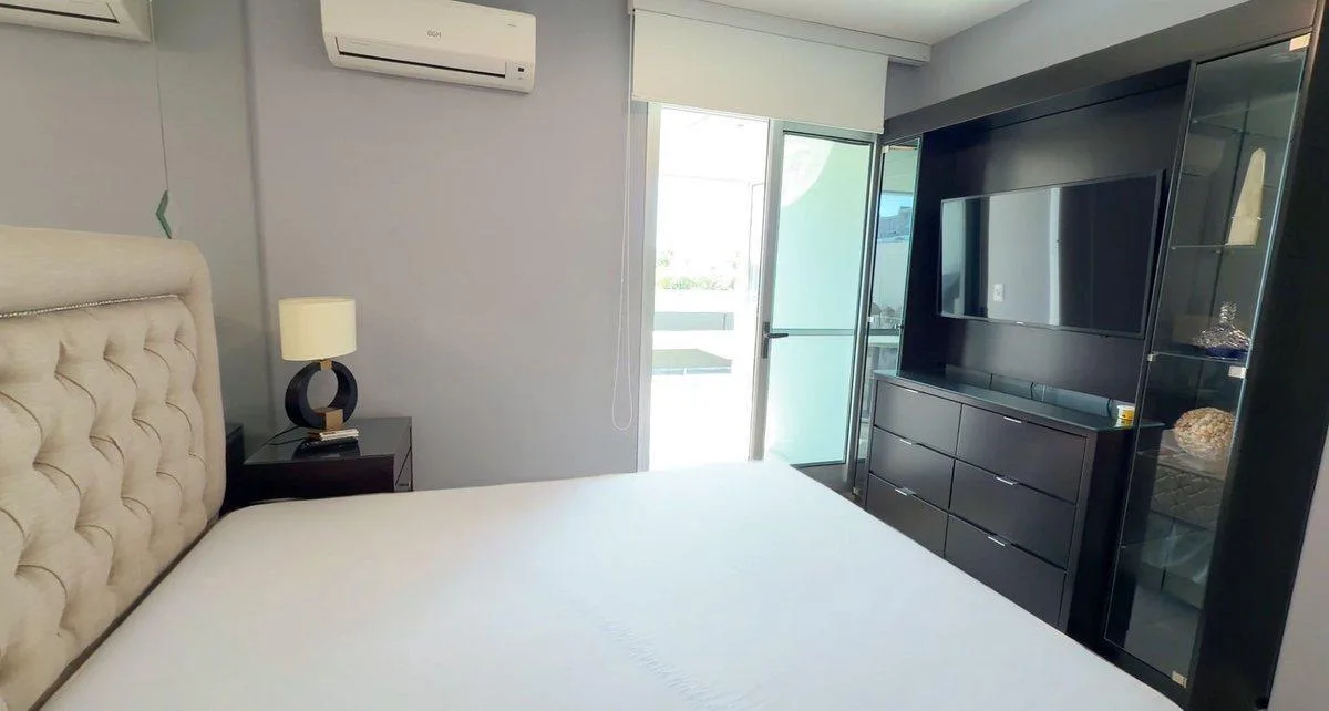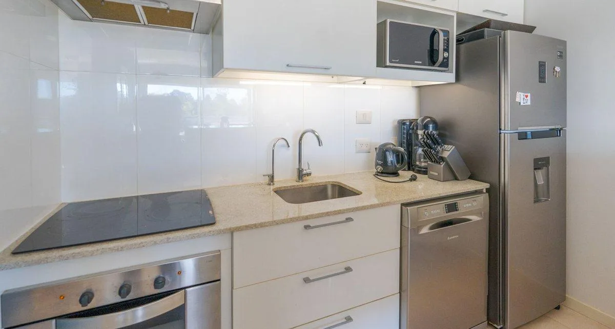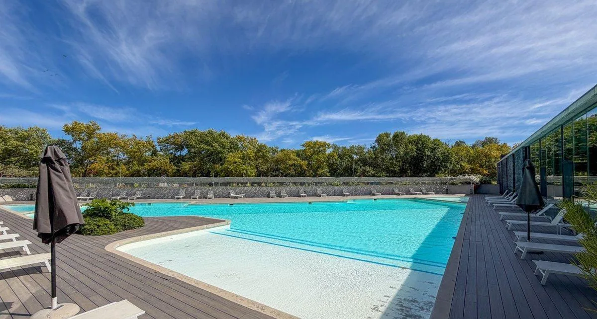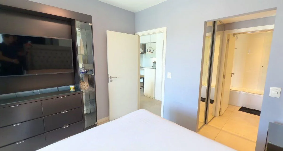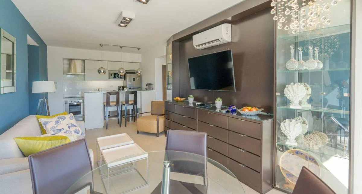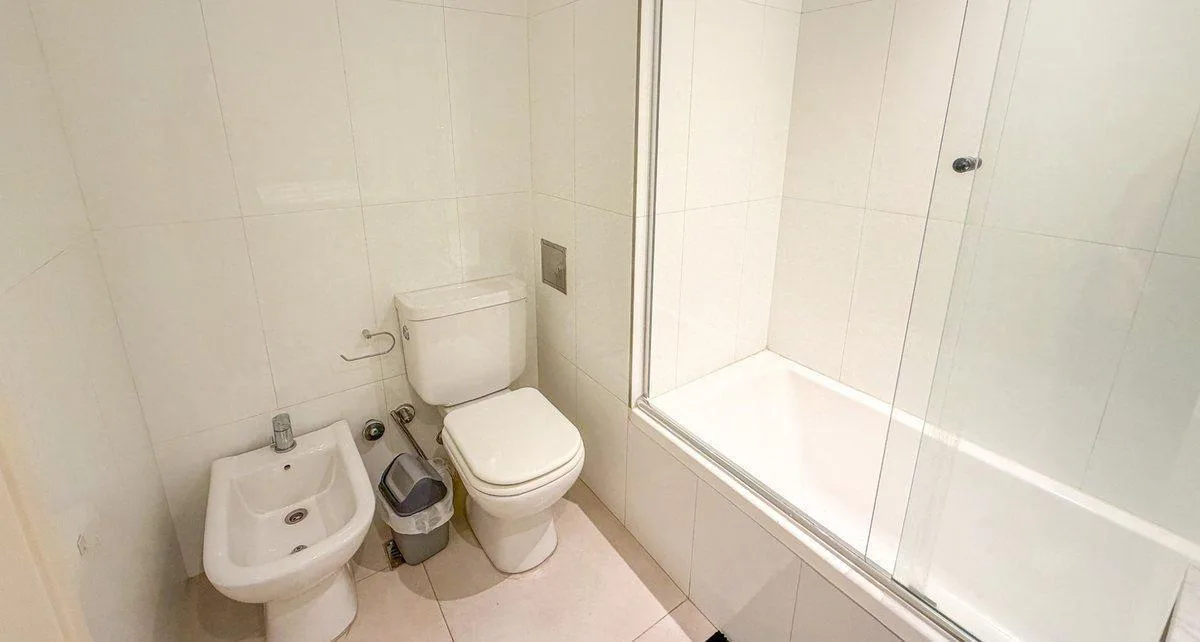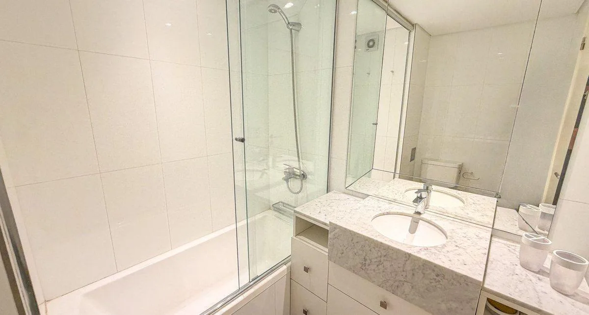 Two-room apartment in the Venice complex, first floor street-facing. Fully furnished and equipped, with a living-dining area with direct access to a 14 m² terrace balcony via sliding door. Integrated electric kitchen with dishwasher, fridge, microwave, coffee maker and tableware set; separate reception toilet and a distribution area to the private section. Bedroom with access to the terrace balcony, walk-in dressing area with built-in wardrobes, and a full en-suite bathroom with shower and batht
