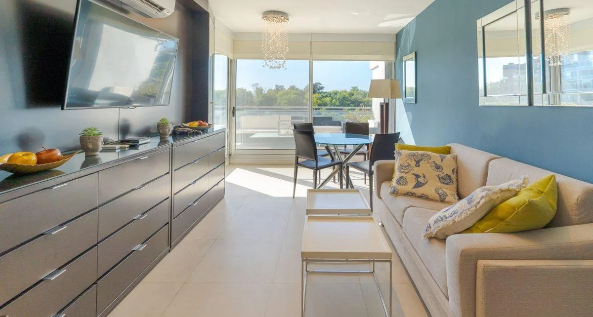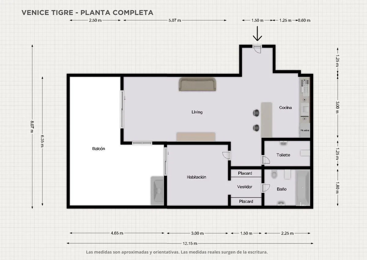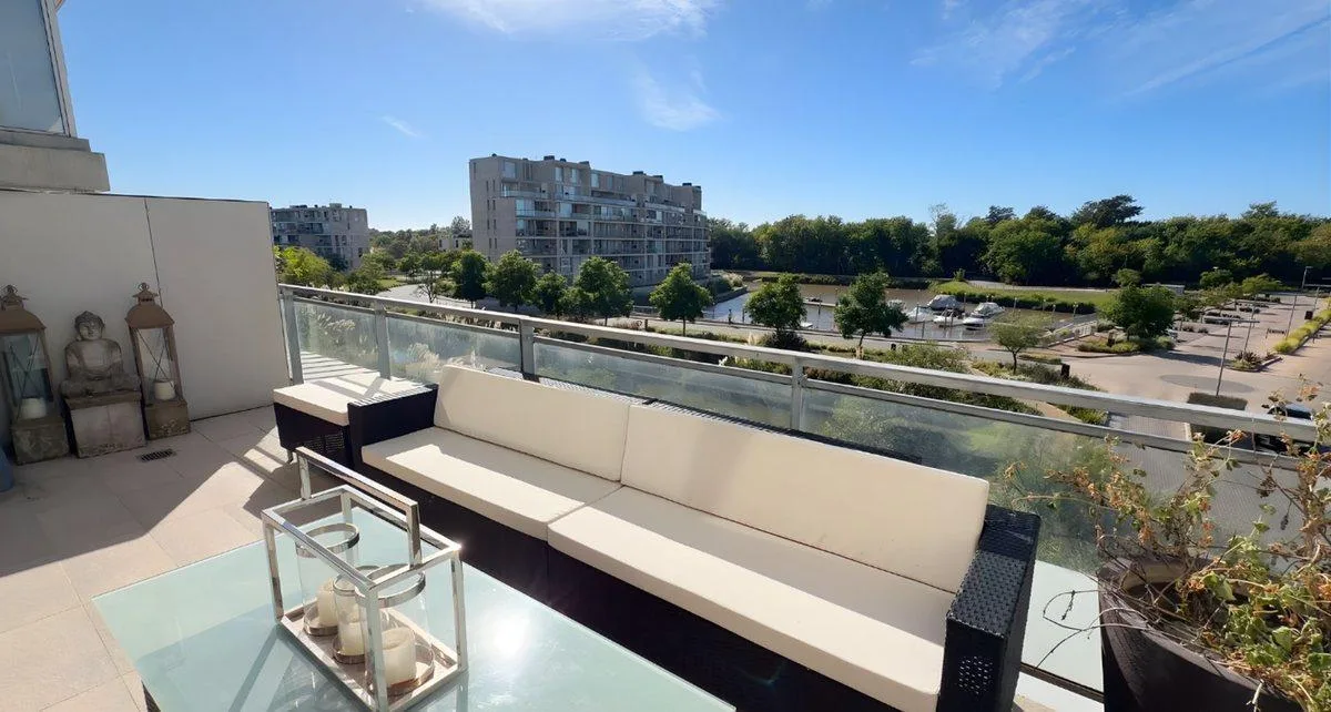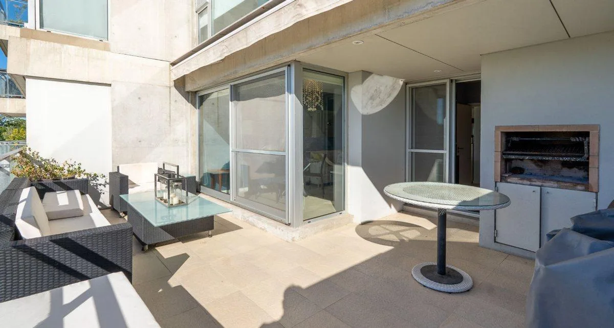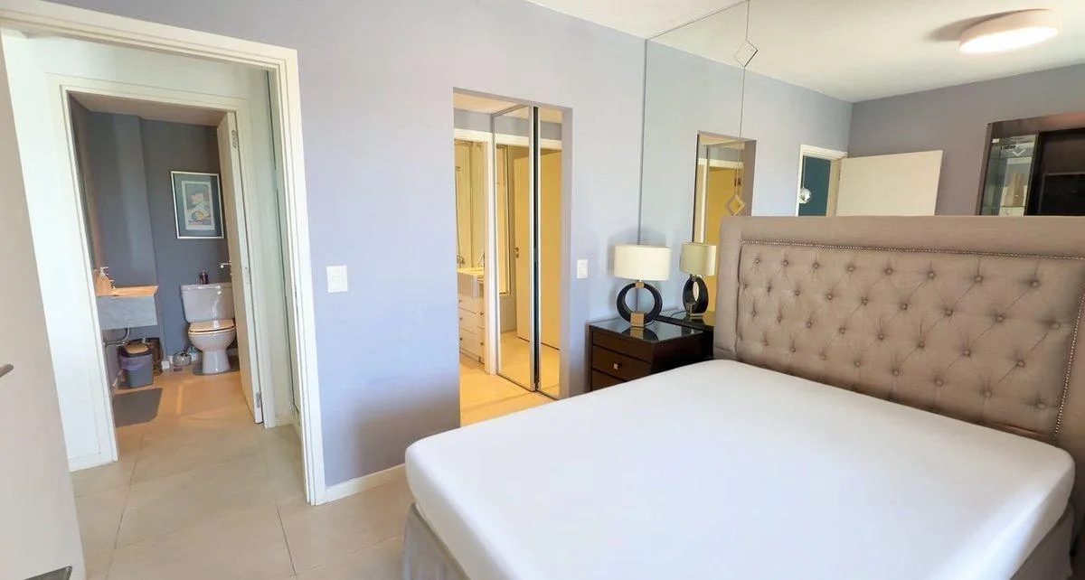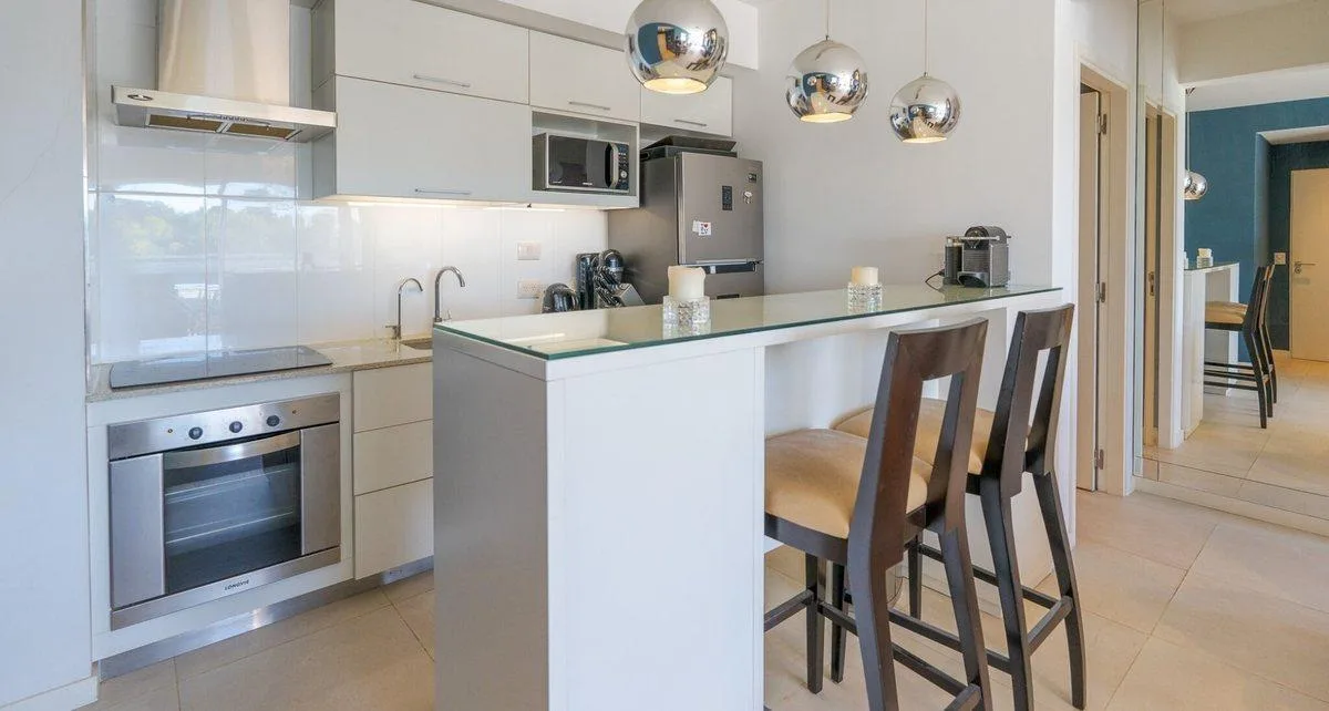 Two-room apartment in the Venice complex, first floor street-facing. Fully furnished and equipped, with a living-dining area with direct access to a 14 m² terrace balcony via sliding door. Integrated electric kitchen with dishwasher, fridge, microwave, coffee maker and tableware set; separate reception toilet and a distribution area to the private section. Bedroom with access to the terrace balcony, walk-in dressing area with built-in wardrobes, and a full en-suite bathroom with shower and batht