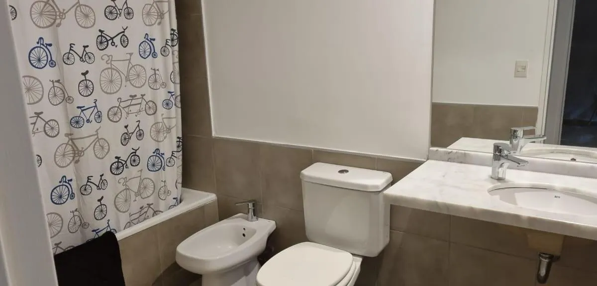 Two-room furnished apartment with 1 bedroom in Tigre, available from 1 May 2026. Located in Condominio Palmas Plaza, with covered (assigned) parking and views of the green areas and the Rio channel. The unit includes a living-dining room with access to a balcony-terrace with a grill, separate kitchen and laundry area, a full bathroom, and a bedroom with a built-in wardrobe. Fully equipped for 2 people (WiFi, microwave, fridge, TV with Chromecast, washing machine, tableware, cookware and cutlery)