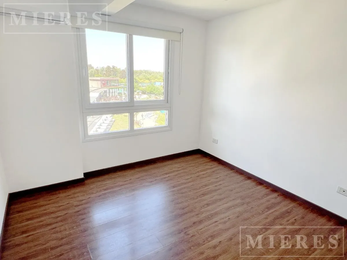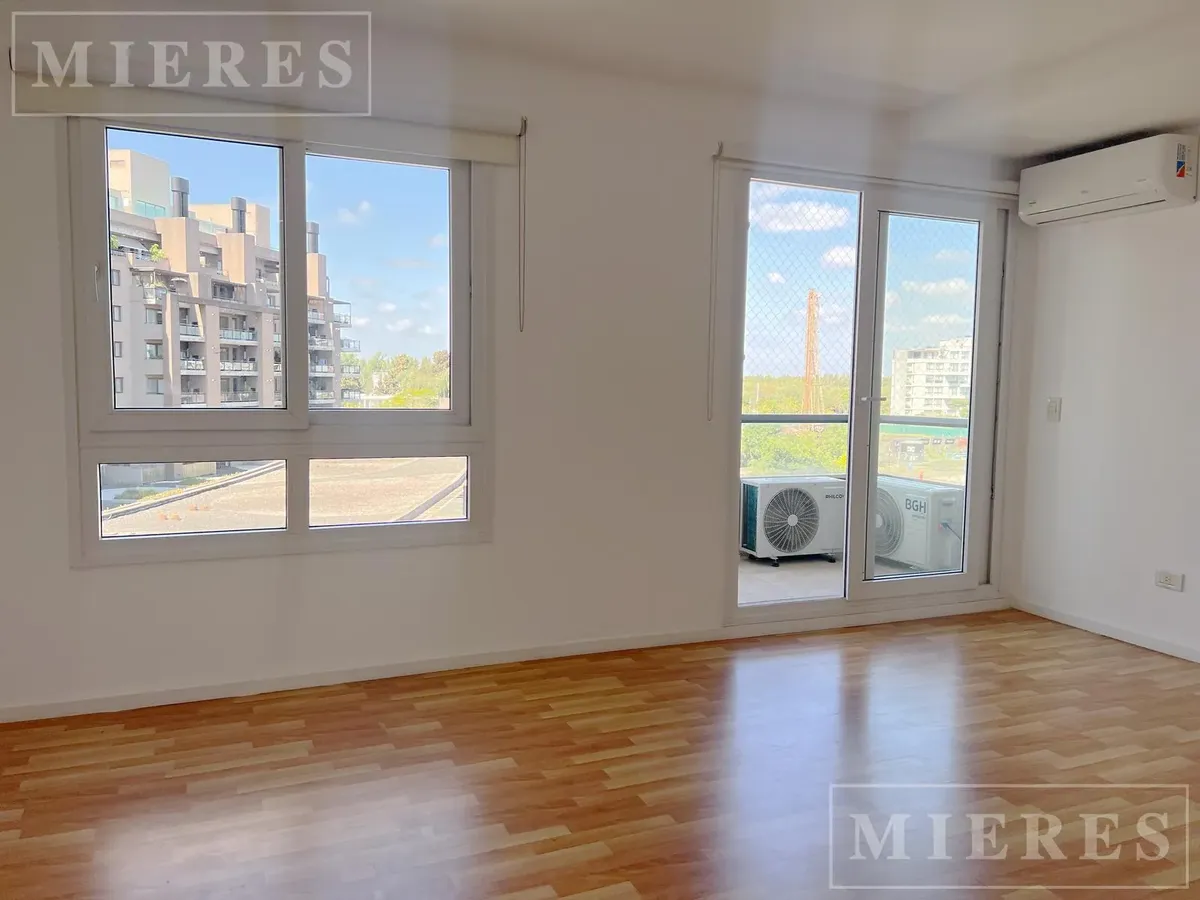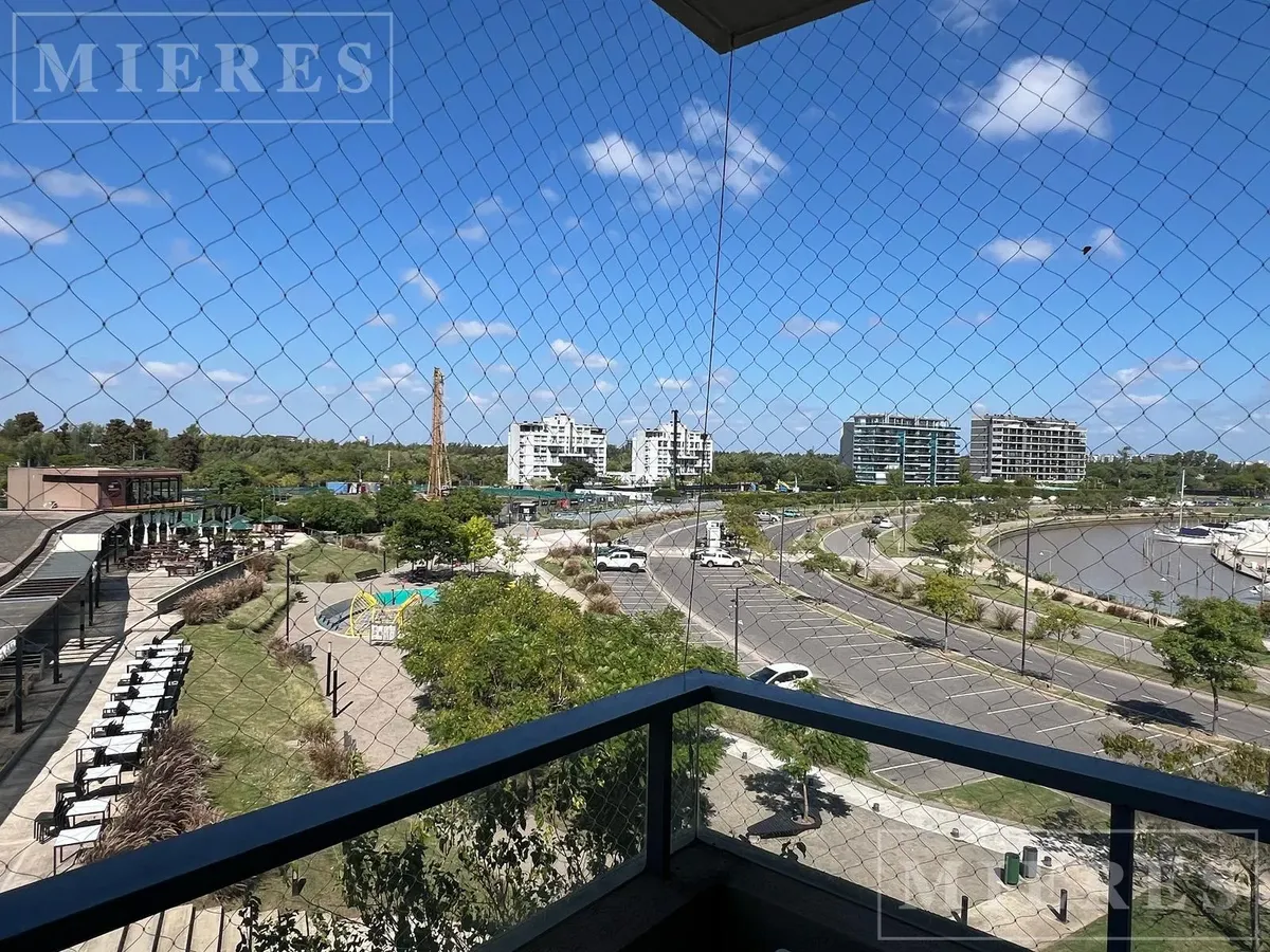 Two-room apartment in Espigón 12, Puerto Escondido, Nordelta, with a lateral river view. Unfurnished, available for annual rental for 24 months. The unit has two inverter hot/cold air conditioners, double-glazed PVC windows, a dual boiler, a living-dining room with balcony access, and an open-plan kitchen with space for a washing machine and dishwasher. The en-suite bedroom includes a walk-in wardrobe and a full bathroom with shower and glass enclosure. The complex features a pool, solarium, gym