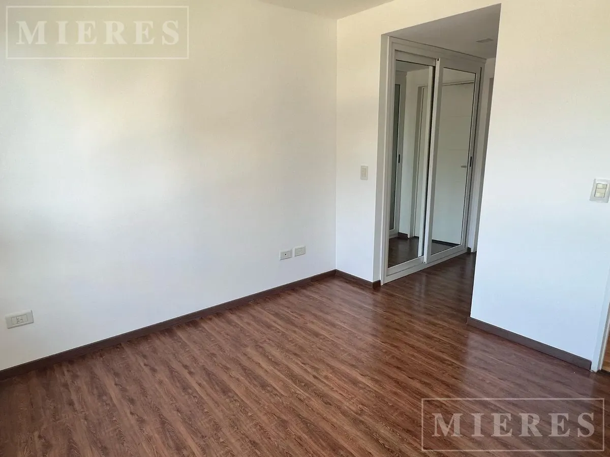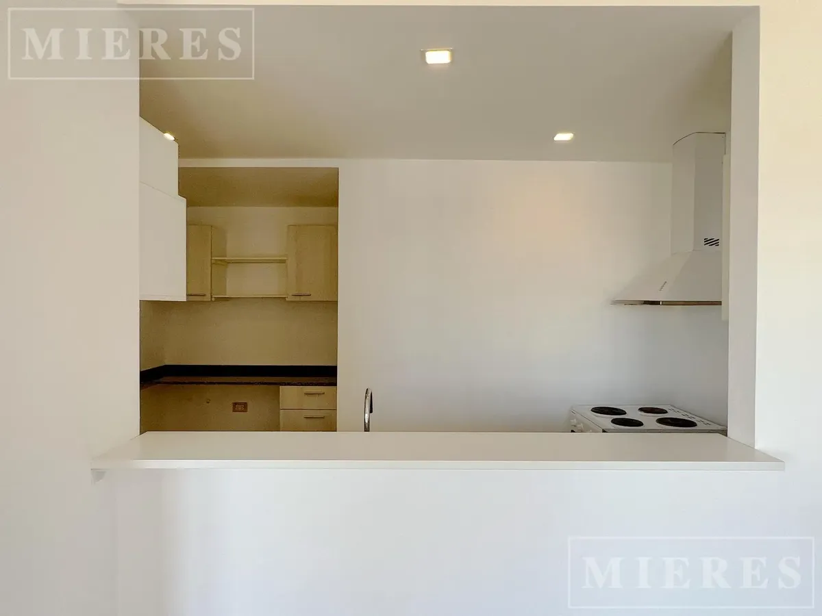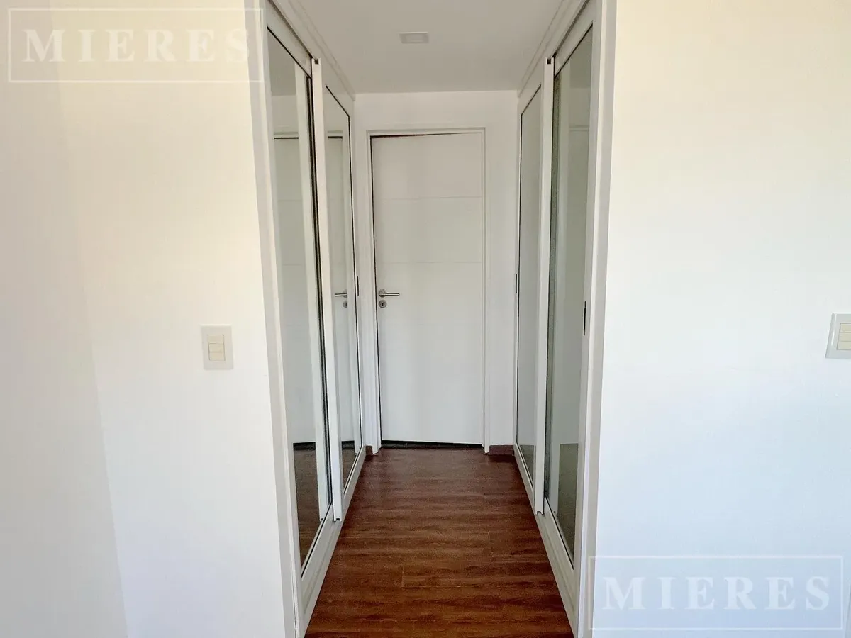 Two-room apartment in Espigón 12, Puerto Escondido, Nordelta, with a lateral river view. Unfurnished, available for annual rental for 24 months. The unit has two inverter hot/cold air conditioners, double-glazed PVC windows, a dual boiler, a living-dining room with balcony access, and an open-plan kitchen with space for a washing machine and dishwasher. The en-suite bedroom includes a walk-in wardrobe and a full bathroom with shower and glass enclosure. The complex features a pool, solarium, gym