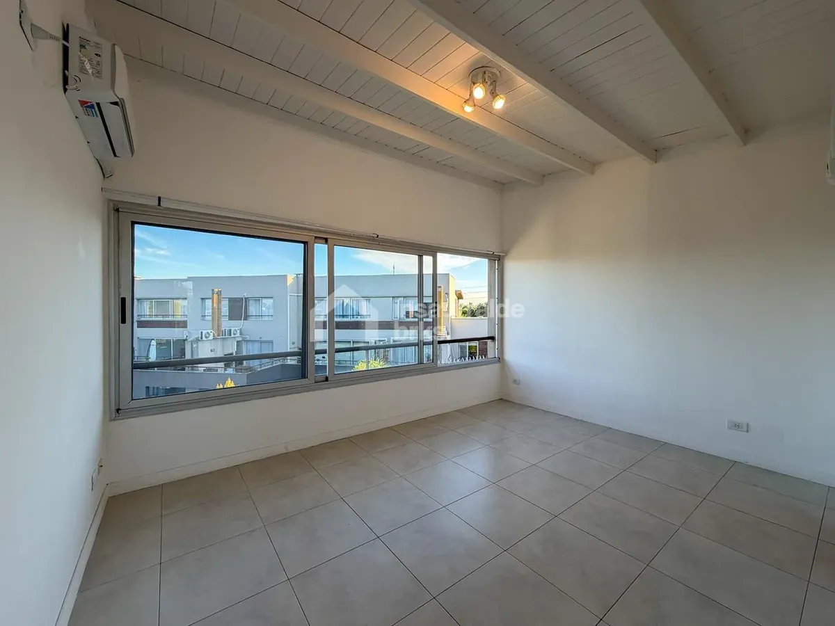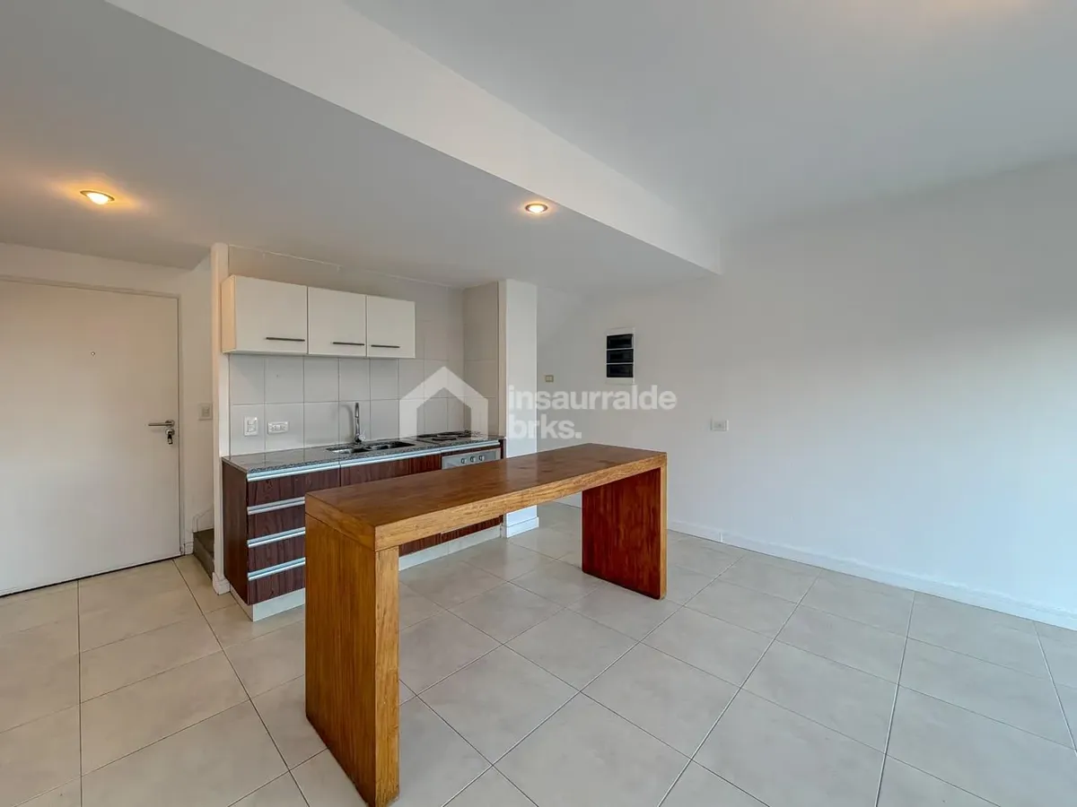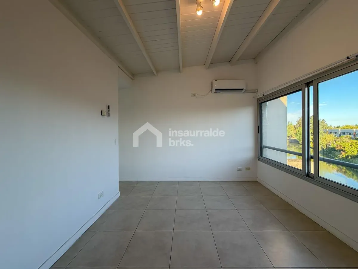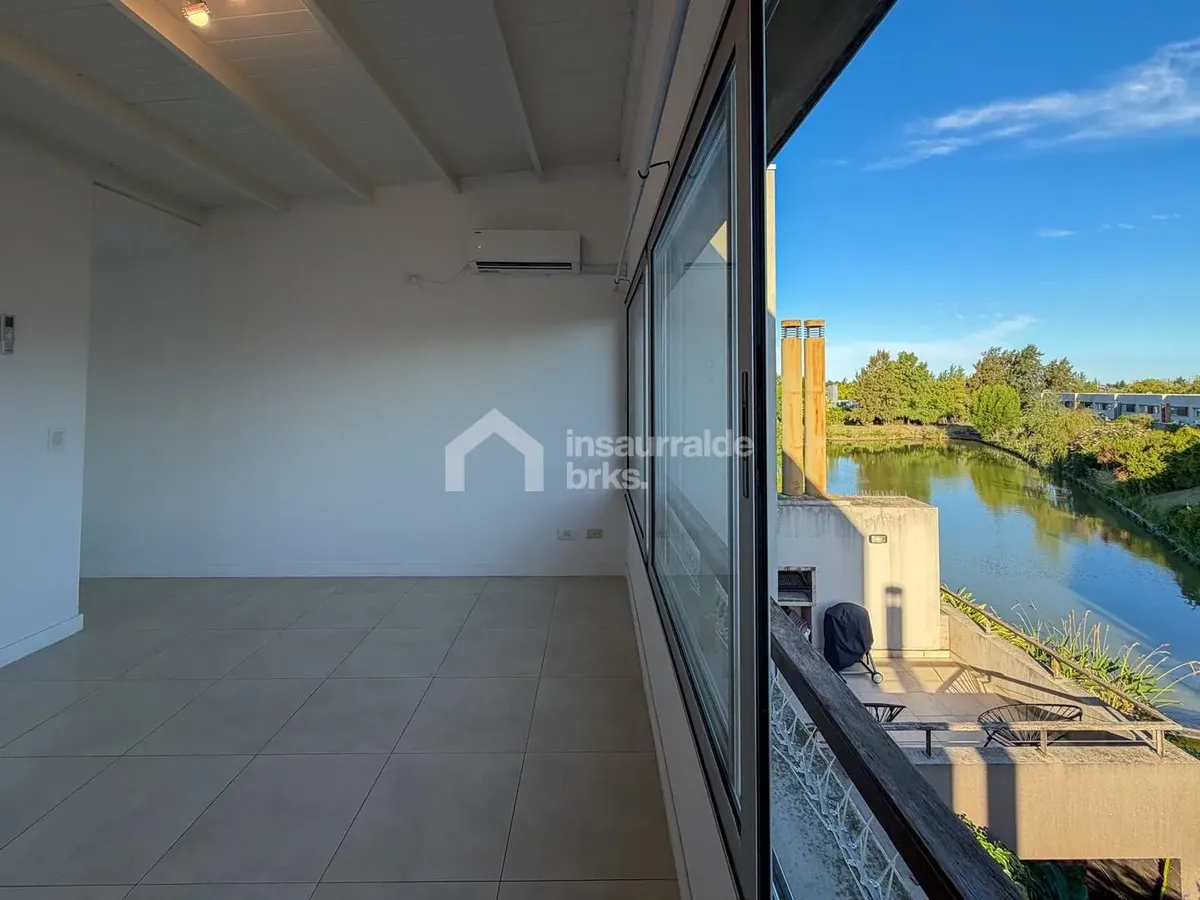 Two-room duplex apartment for rent in Lago Escondido, Nordelta, Tigre. It is set over two floors, with a first-floor walk-up entry. The ground floor has a living-dining area with an integrated kitchen, a wide window opening to a terrace balcony with open views of the lake, plus a grill area and space for a washing machine. The upper floor has a suite with a walk-in wardrobe-style closet and a full bathroom, equipped with air conditioning and a large window with lake views. Electric underfloor he
