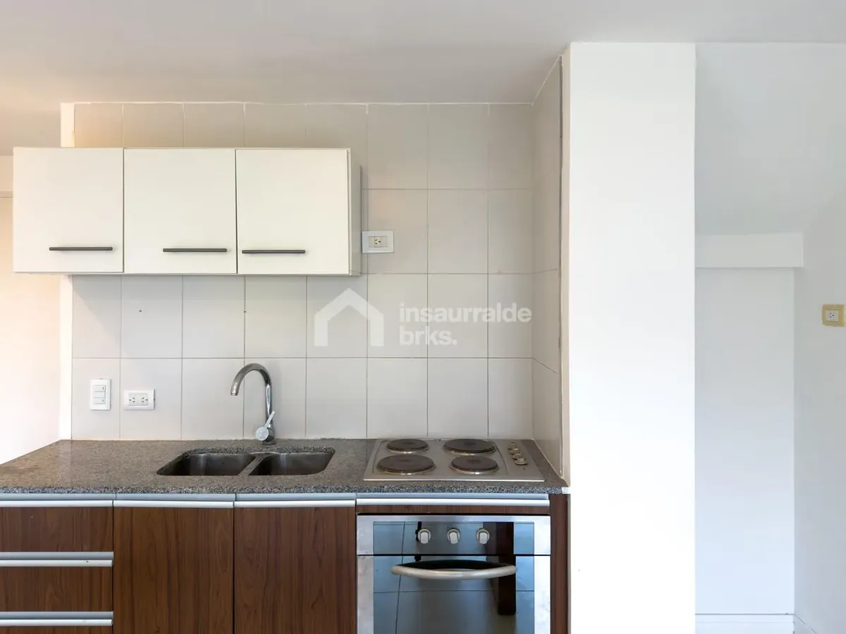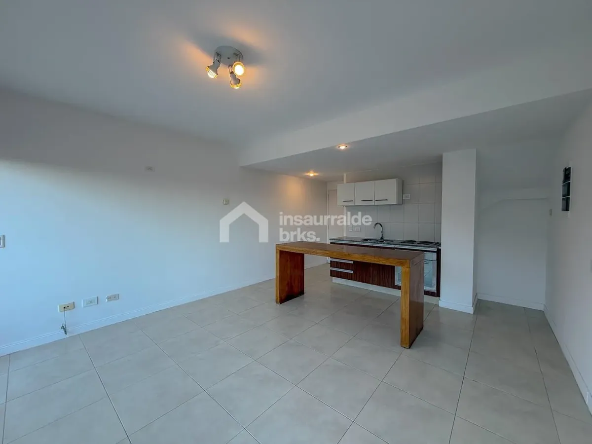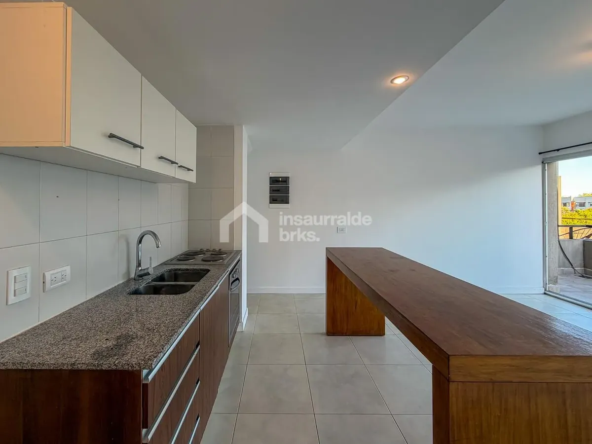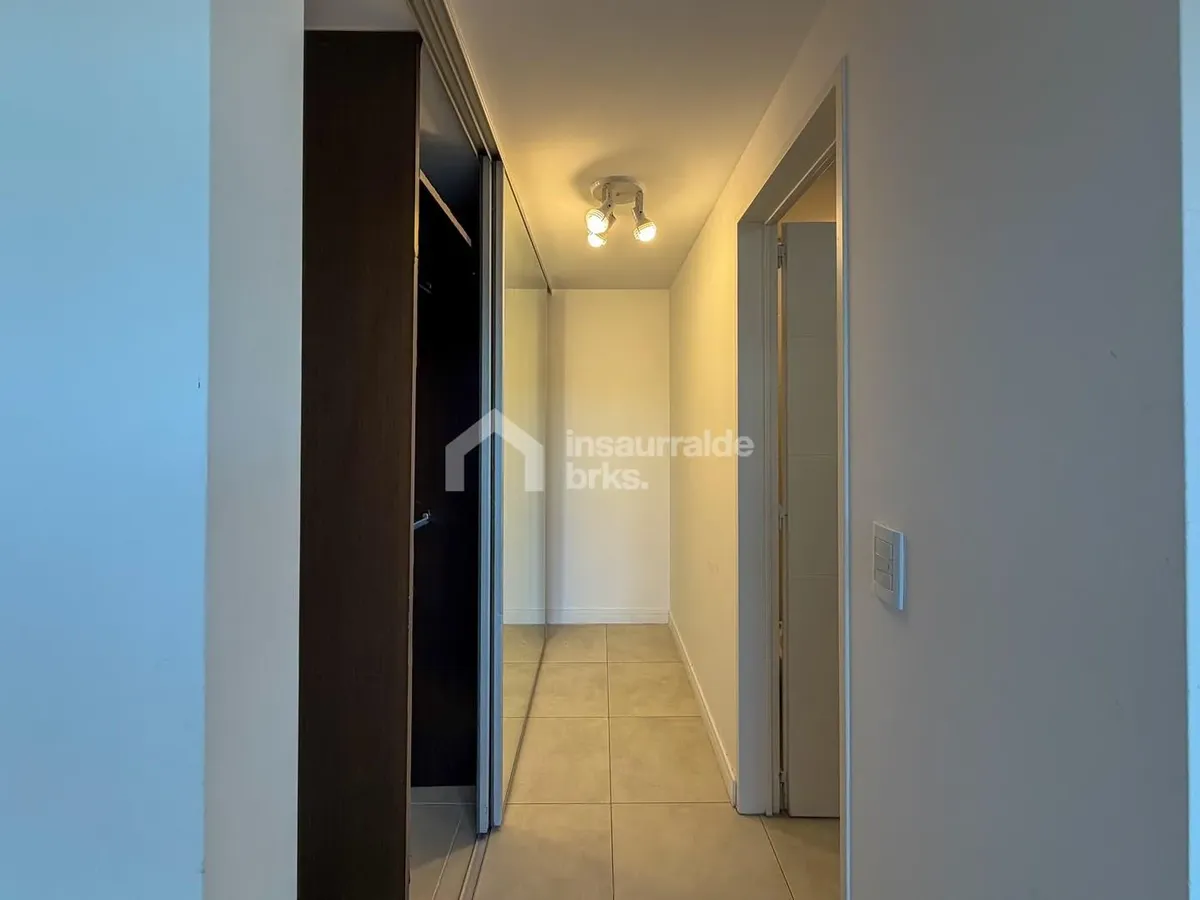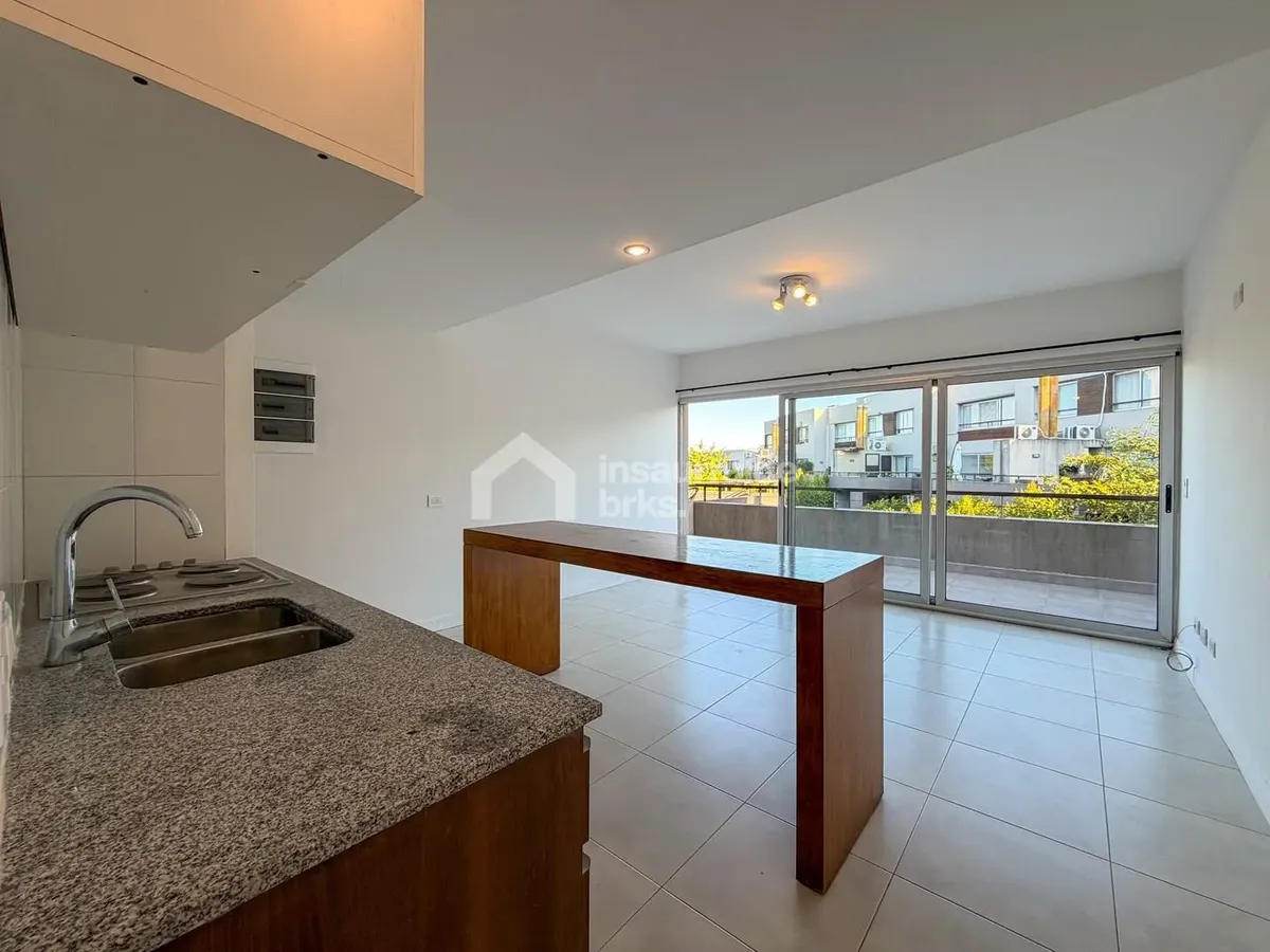 Two-room duplex apartment for rent in Lago Escondido, Nordelta, Tigre. It is set over two floors, with a first-floor walk-up entry. The ground floor has a living-dining area with an integrated kitchen, a wide window opening to a terrace balcony with open views of the lake, plus a grill area and space for a washing machine. The upper floor has a suite with a walk-in wardrobe-style closet and a full bathroom, equipped with air conditioning and a large window with lake views. Electric underfloor he