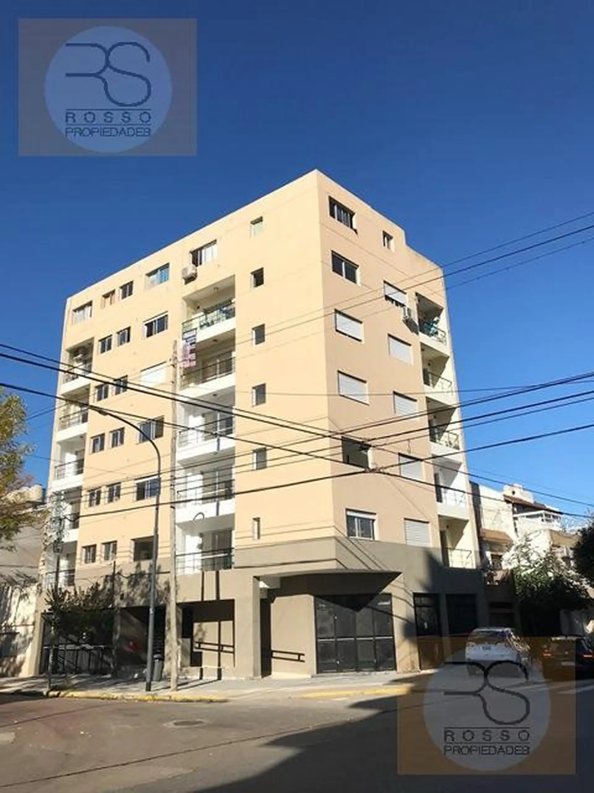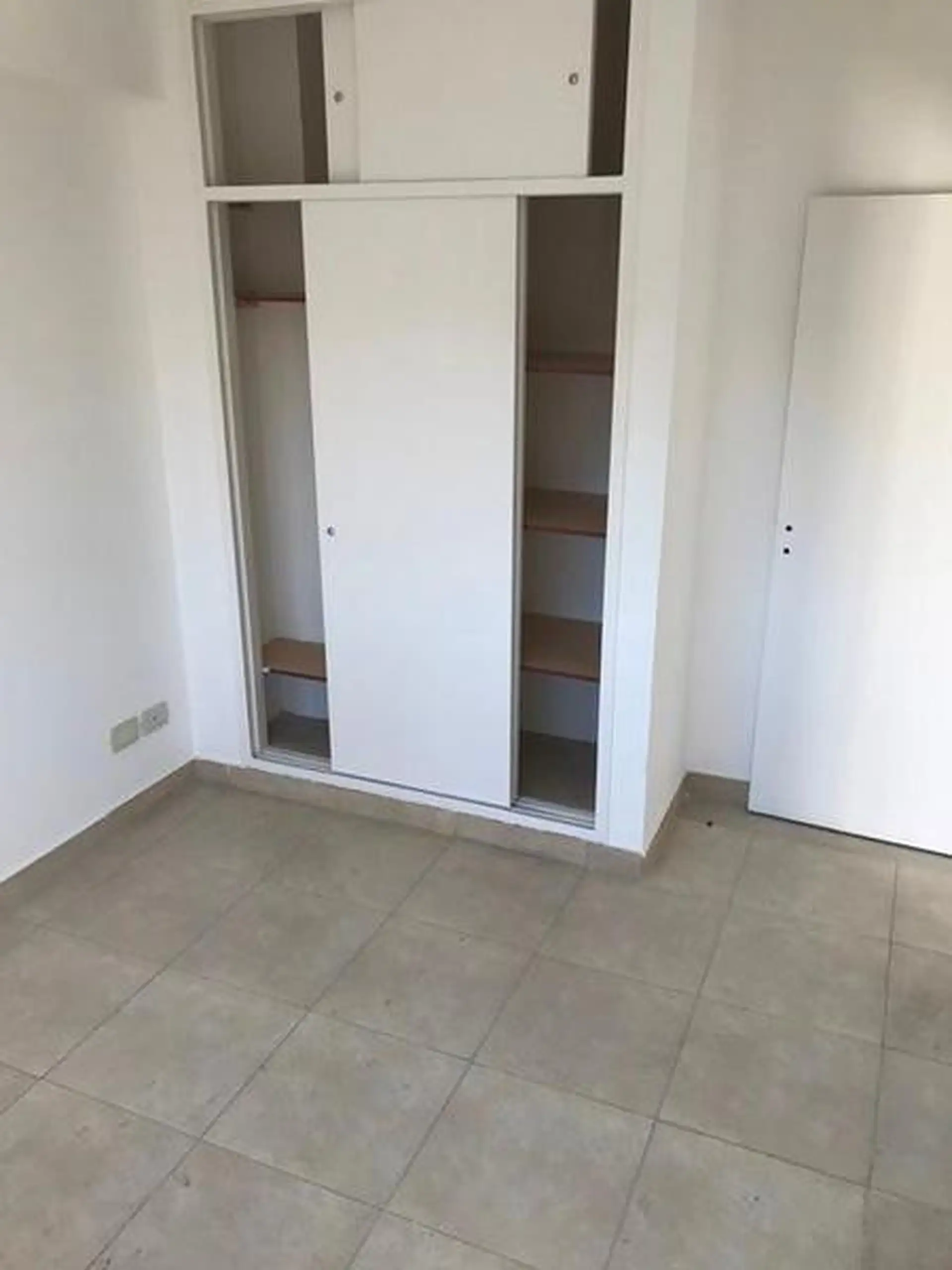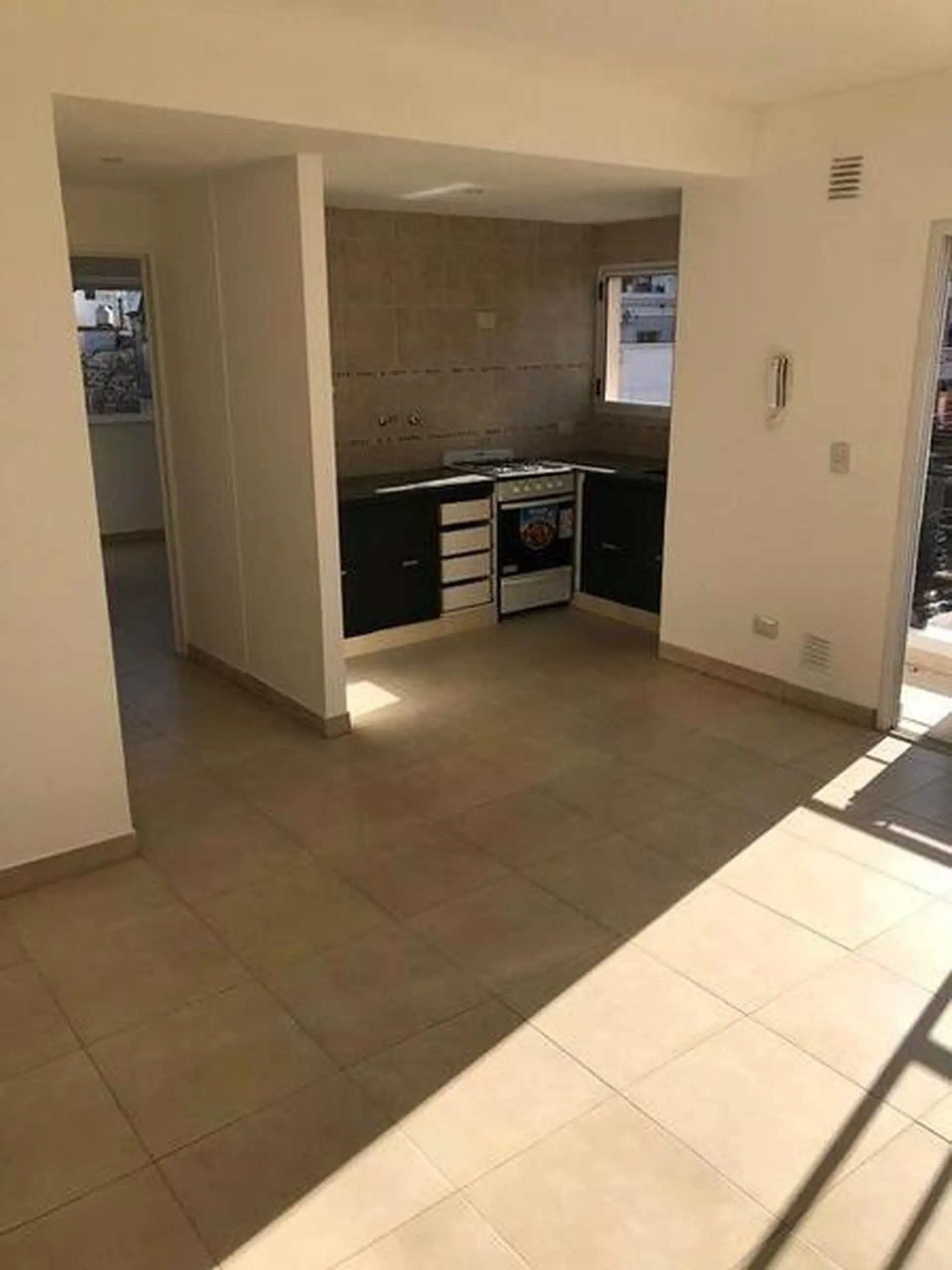 Two-room apartment with street-facing layout in Villa Luro, with a balcony and assigned covered parking space. The unit has a living-dining area with direct access to the balcony and a semi-integrated kitchen with built-in upper and lower cabinetry. Natural gas is connected, including a gas cooktop and gas water heater; there is a built-in wardrobe in the bedroom and a full bathroom. The balcony area includes a connection provided for a washing machine.