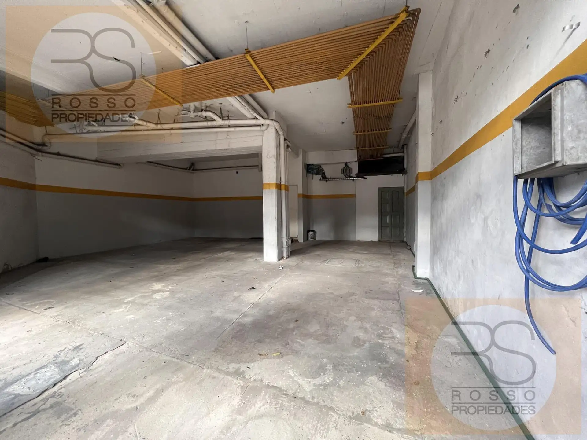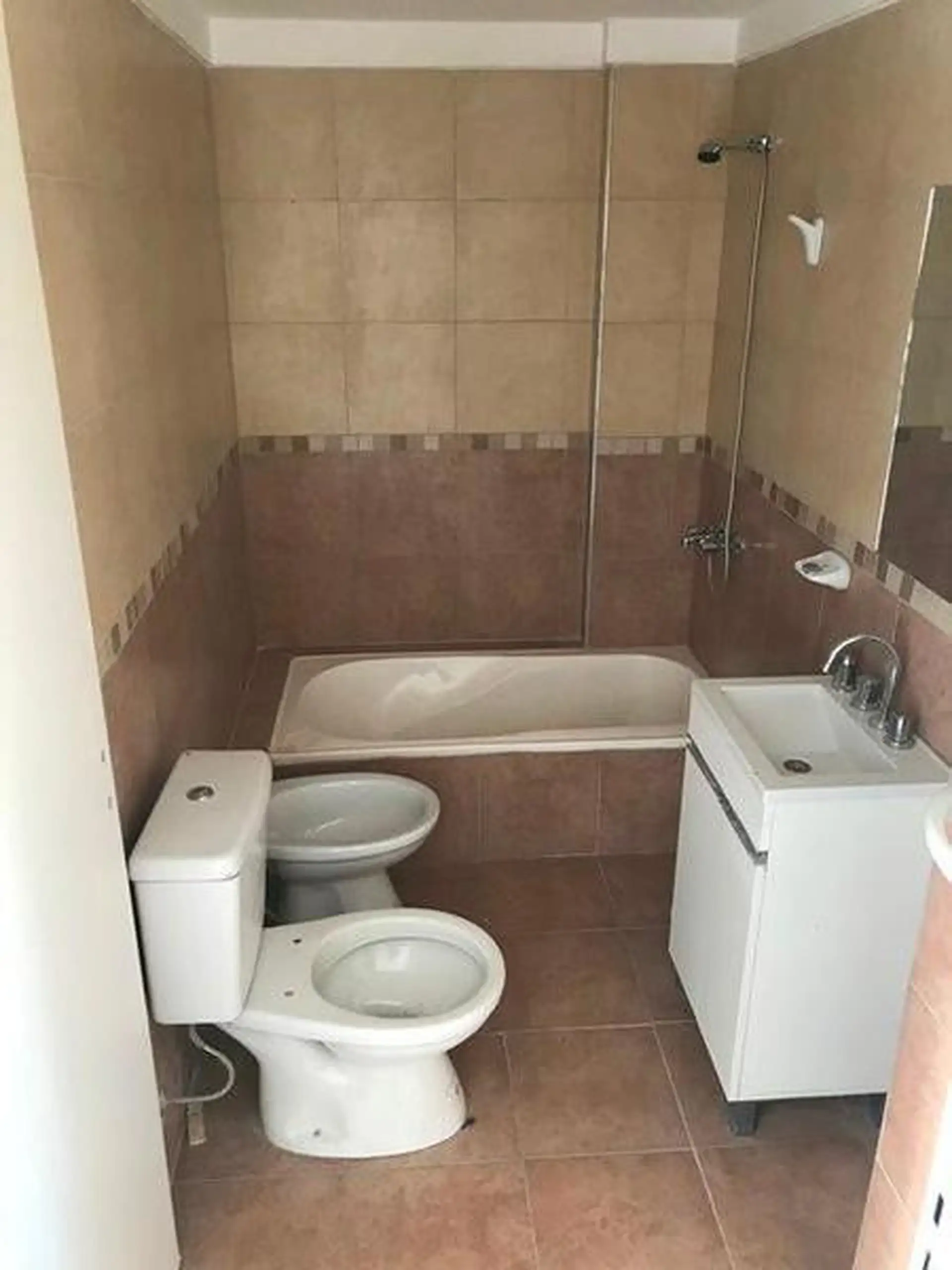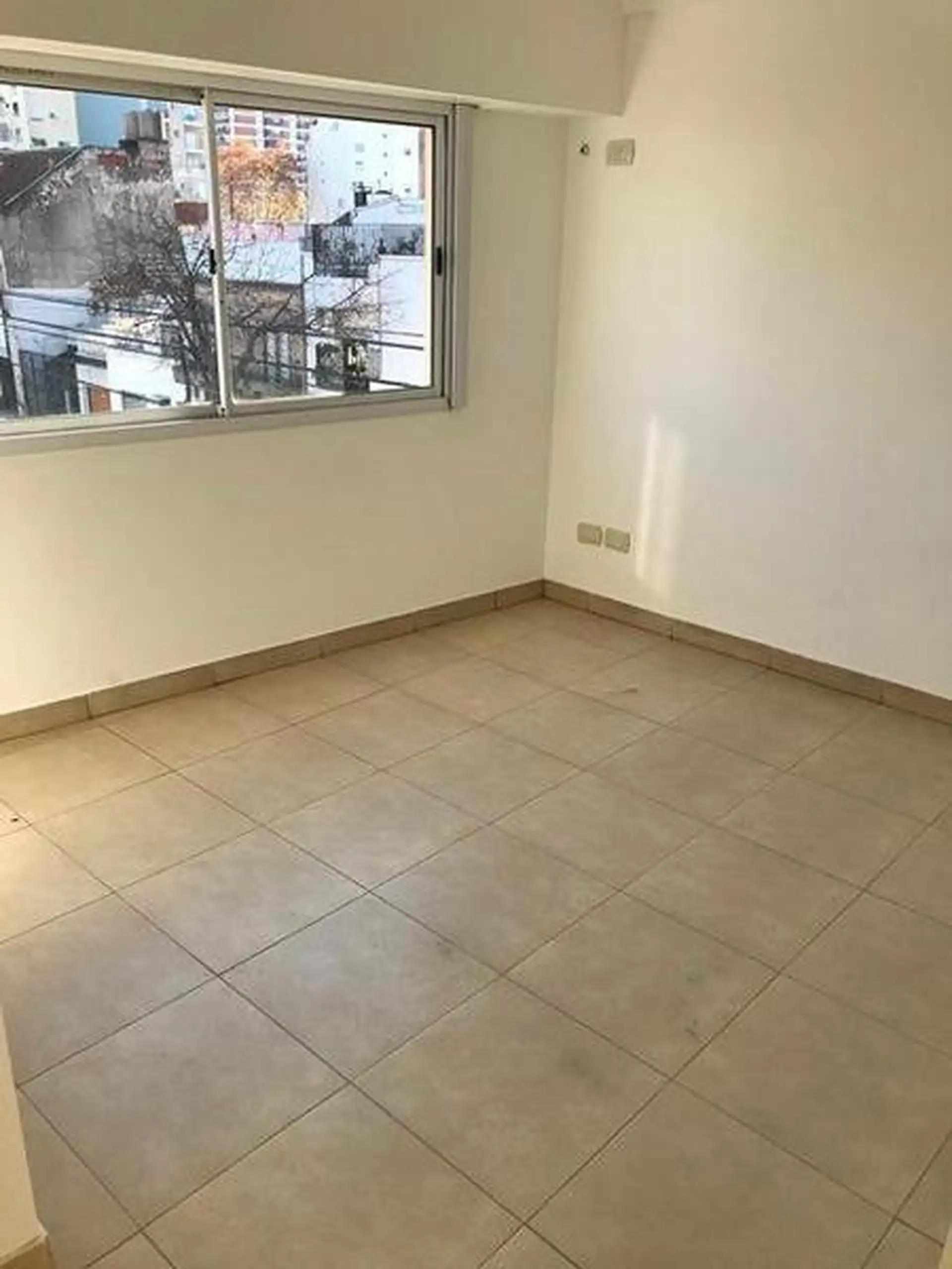 Two-room apartment with street-facing layout in Villa Luro, with a balcony and assigned covered parking space. The unit has a living-dining area with direct access to the balcony and a semi-integrated kitchen with built-in upper and lower cabinetry. Natural gas is connected, including a gas cooktop and gas water heater; there is a built-in wardrobe in the bedroom and a full bathroom. The balcony area includes a connection provided for a washing machine.