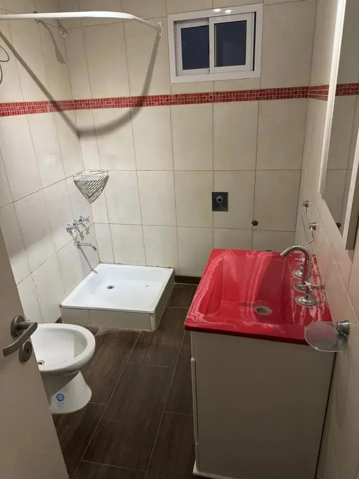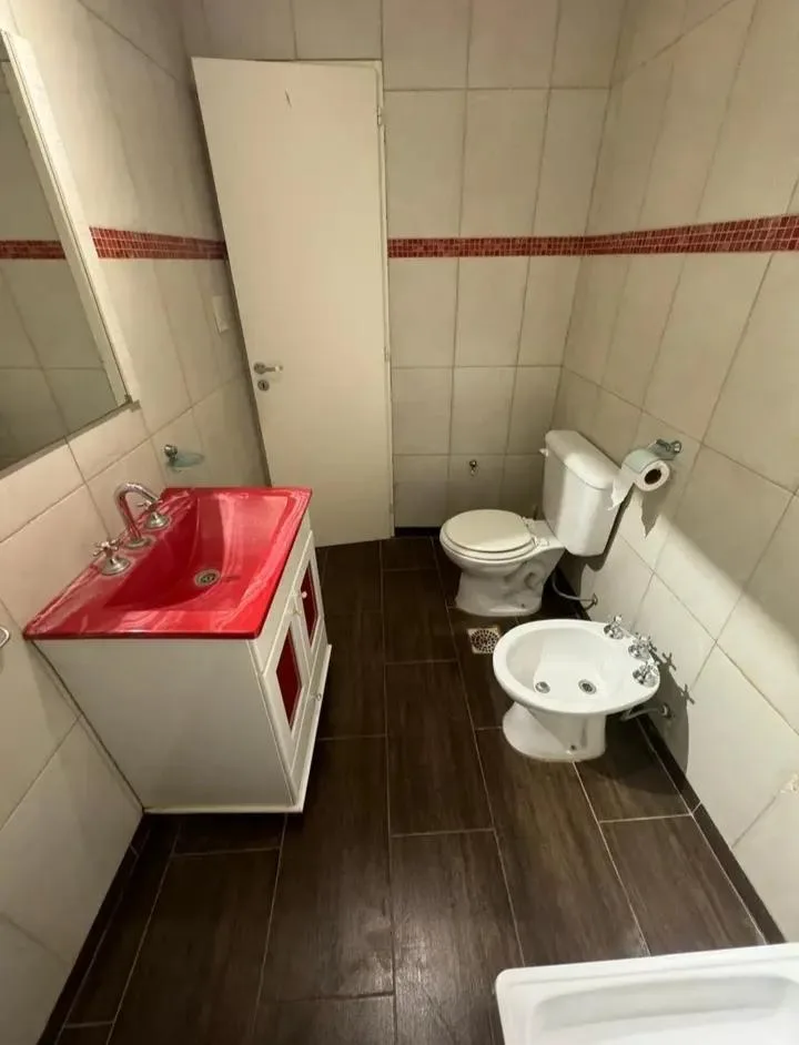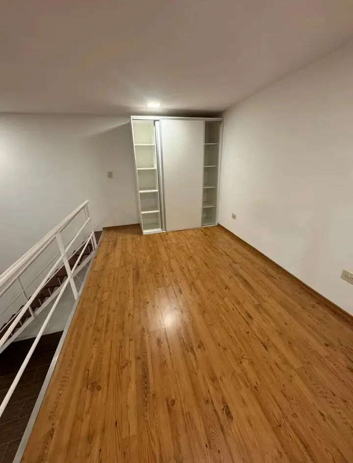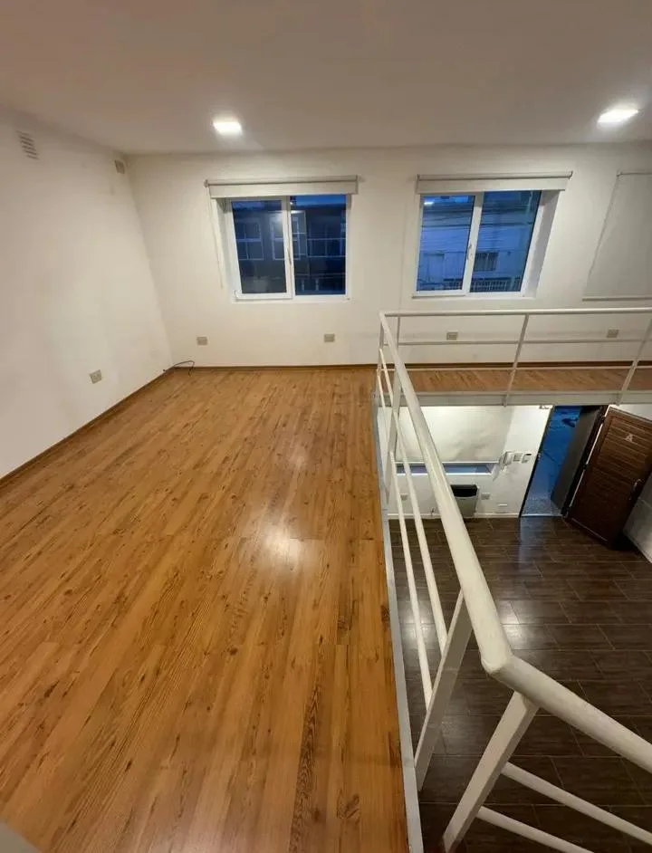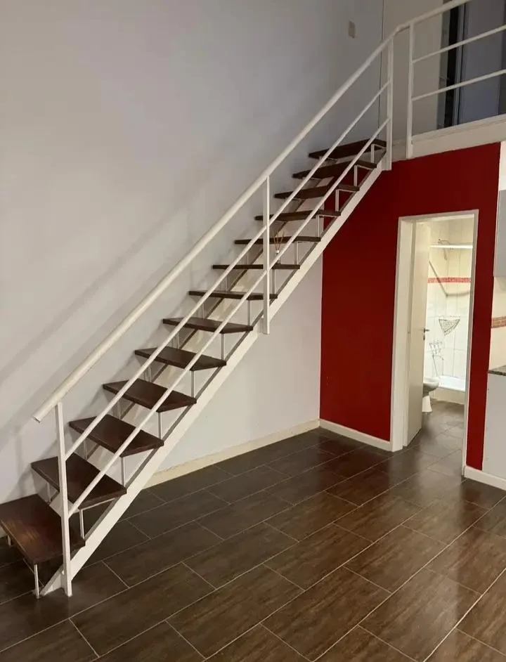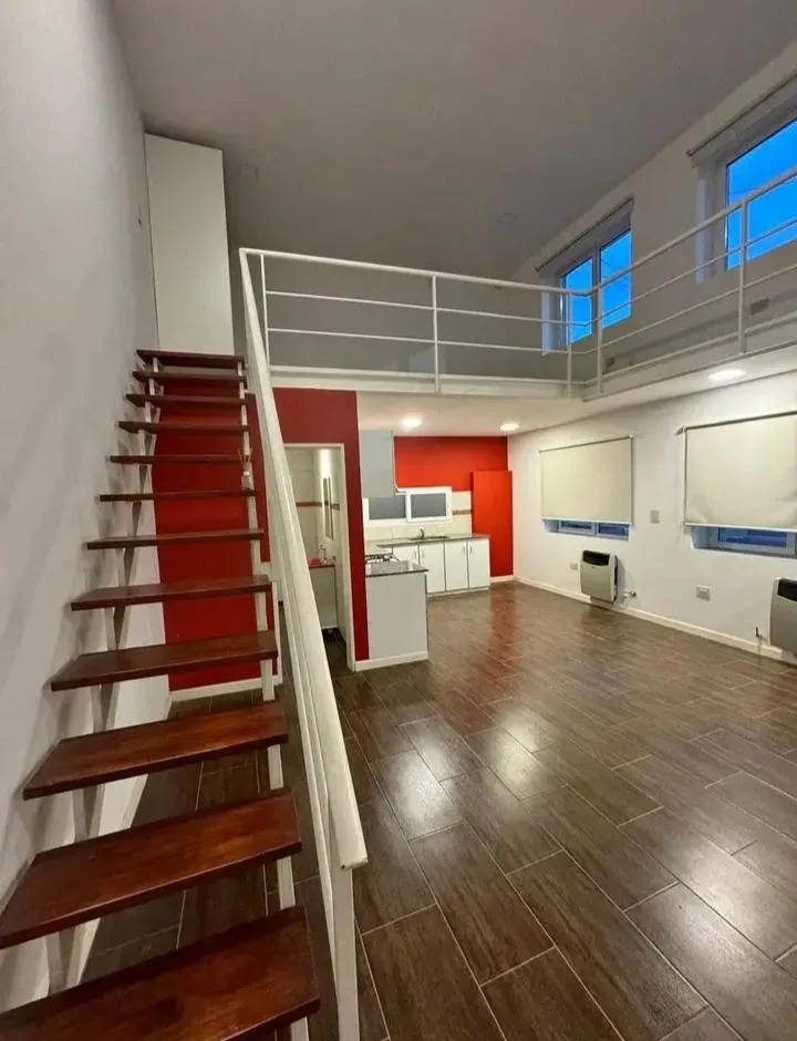Loft apartment with a dining area and equipped kitchen, plus a full bathroom. The bedroom is on a mezzanine accessed via stairs. Small pets are accepted. There are no building fees; charges are based on individual consumption through a separate meter.