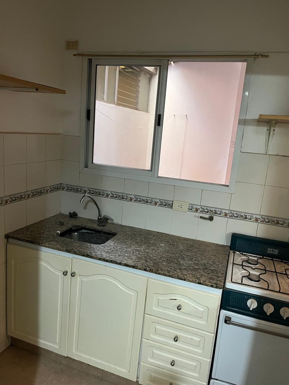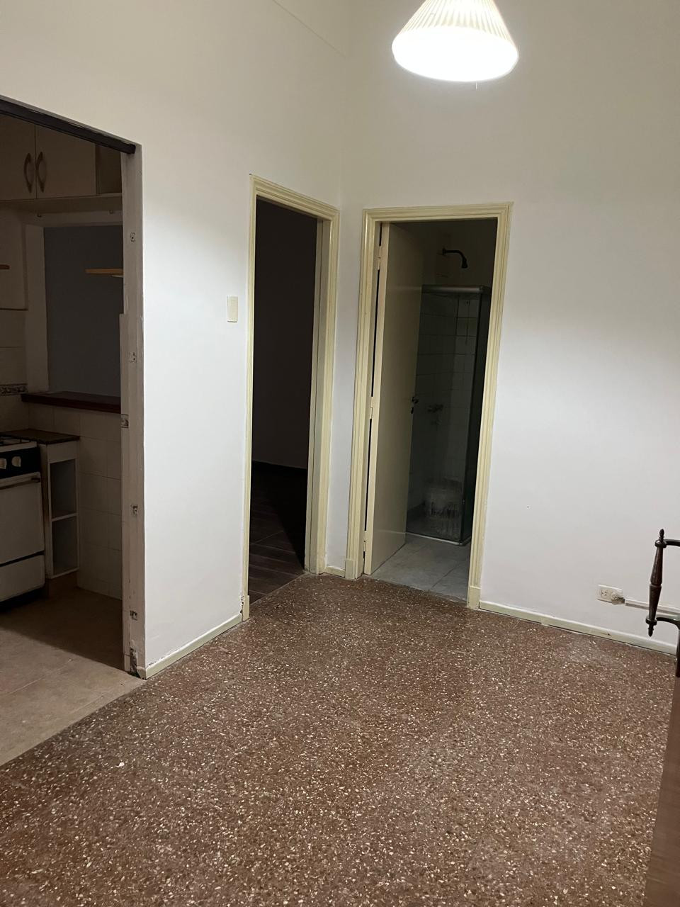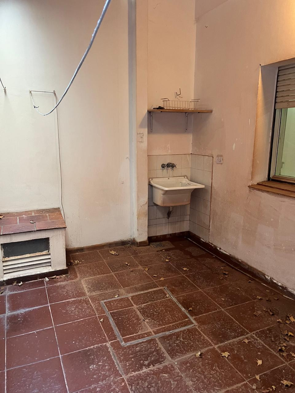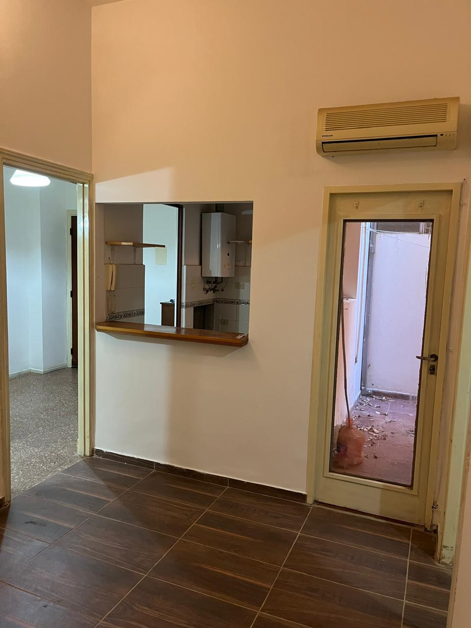 One-bedroom apartment in Olivos, Vicente López, ground-floor with private access via a dining room. Gas kitchen with hot water via a gas water heater and a full bathroom with a shower screen. The bedroom includes a two-door built-in wardrobe spanning the full wall, with air and light from an exclusive-use courtyard that also has a laundry wash basin for placing a washing machine, plus a communal laundry-pit pool for washing.