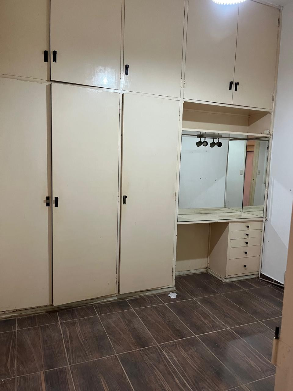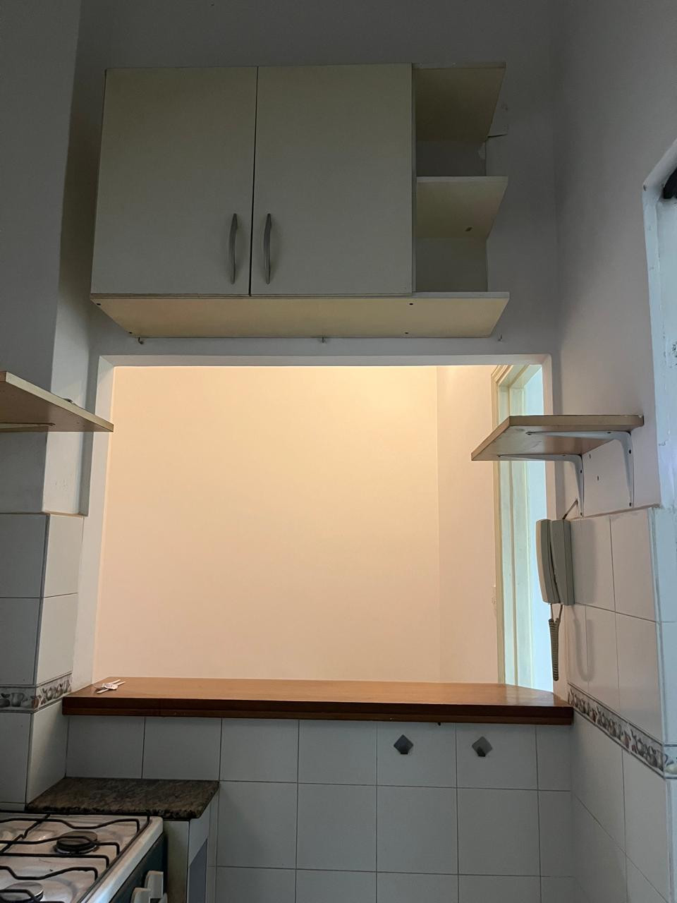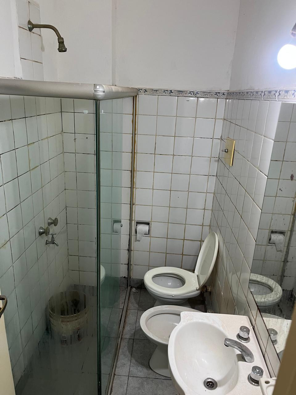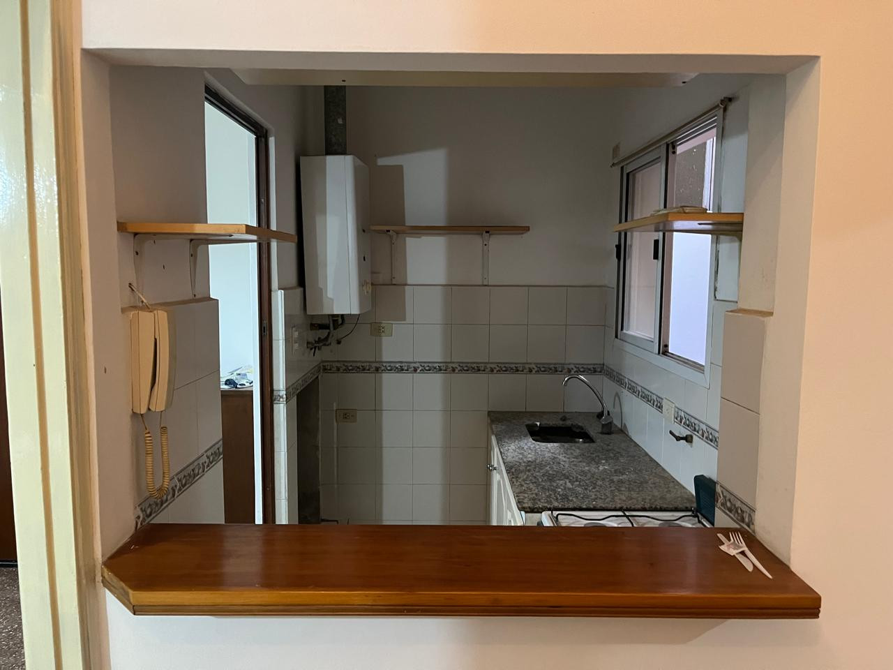 One-bedroom apartment in Olivos, Vicente López, ground-floor with private access via a dining room. Gas kitchen with hot water via a gas water heater and a full bathroom with a shower screen. The bedroom includes a two-door built-in wardrobe spanning the full wall, with air and light from an exclusive-use courtyard that also has a laundry wash basin for placing a washing machine, plus a communal laundry-pit pool for washing.