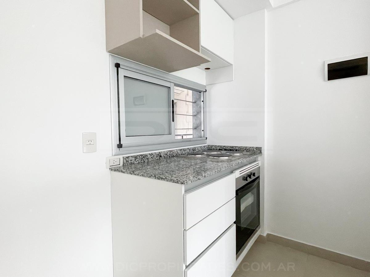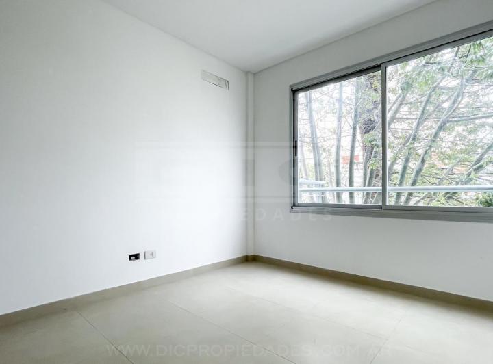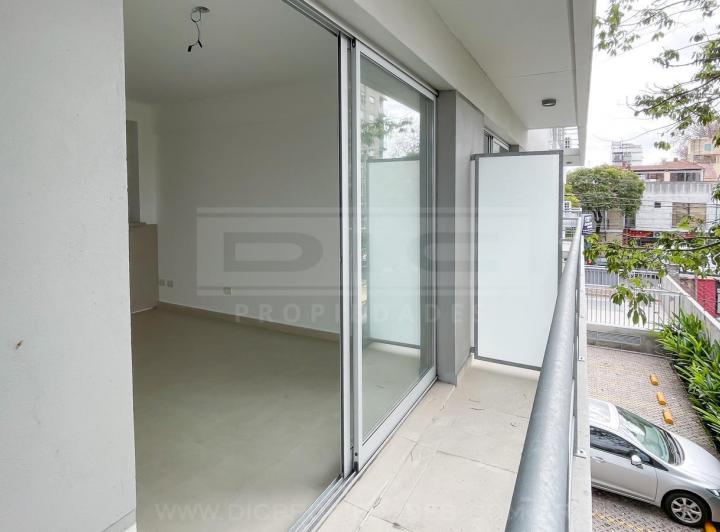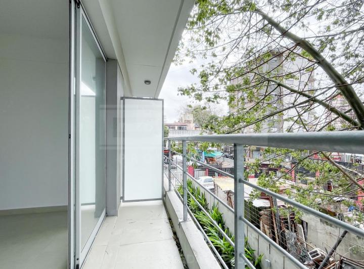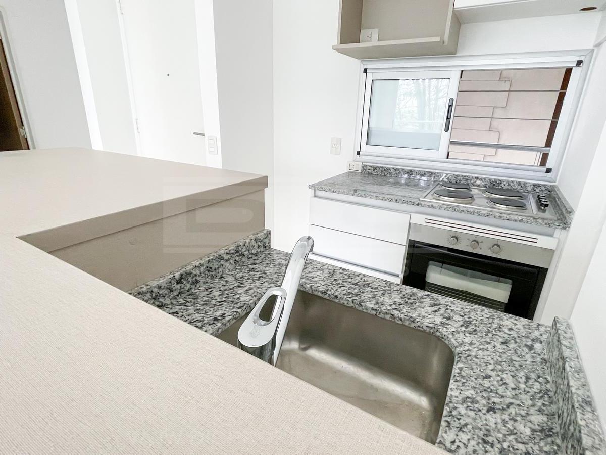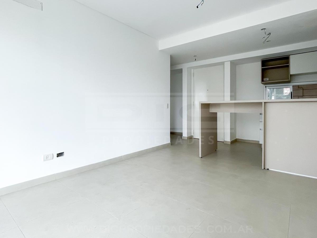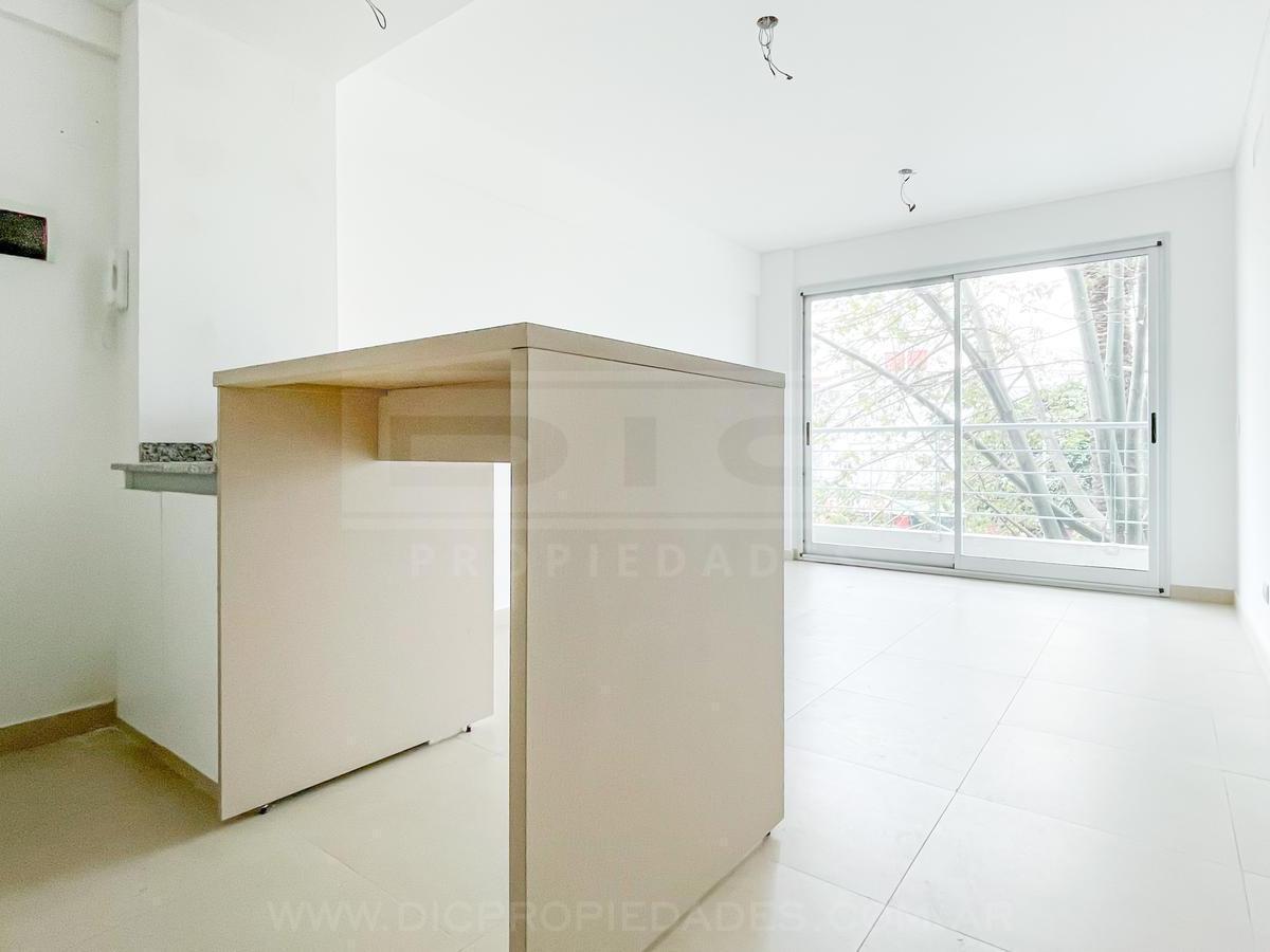 Two-room apartment with a total area of 40.60 m² in Vicente López, north-facing with views of a green space. The unit has a living-dining room with exposed concrete ceiling and access to a balcony, an integrated kitchen with granite countertop, an electric oven, stainless-steel sink with single-lever tap, a bedroom with built-in wardrobe, and a full bathroom. Double-glazed windows, porcelain tile flooring throughout, split-type air-conditioning preinstallation, and central hot and cold water sys
