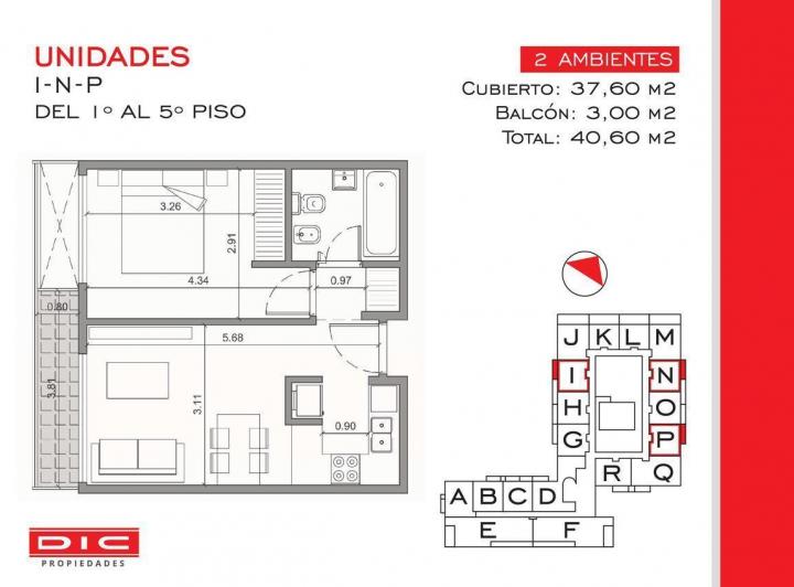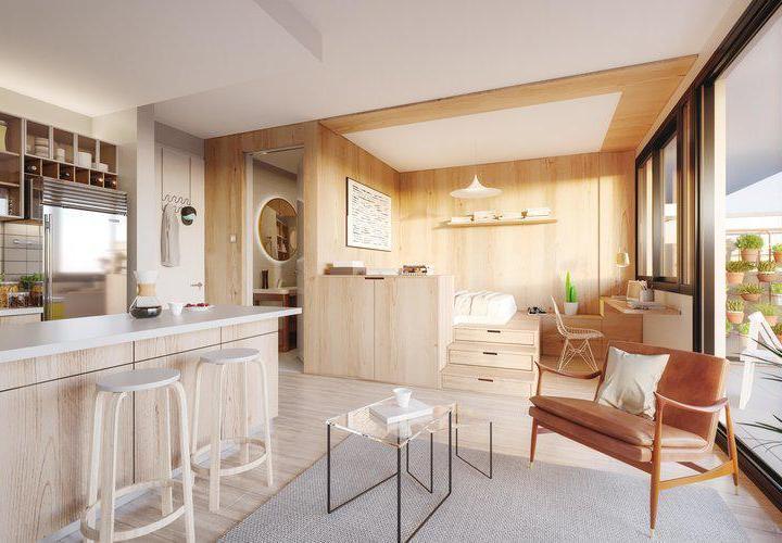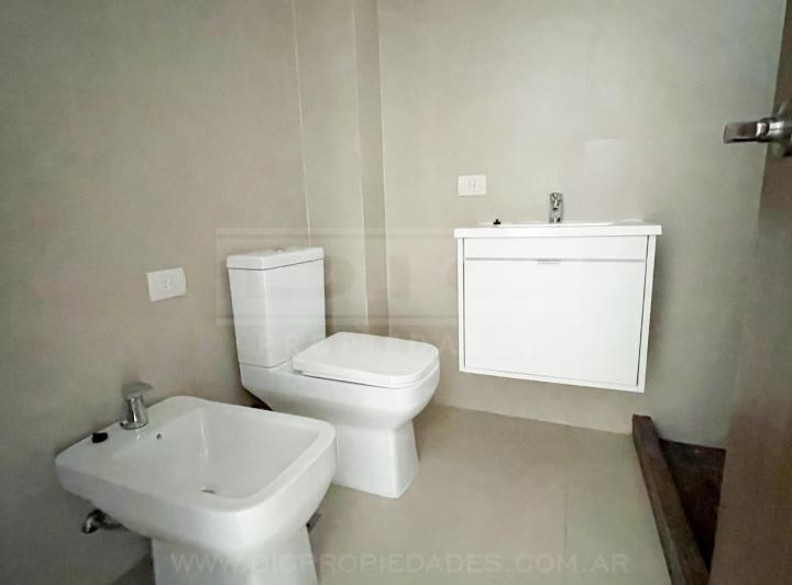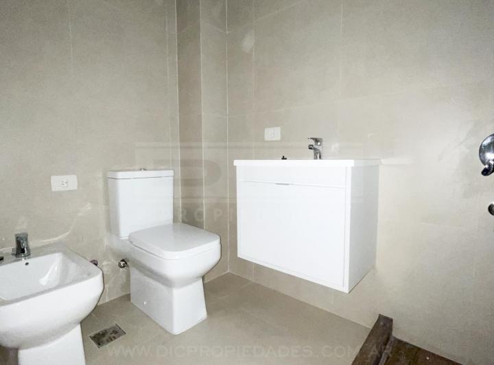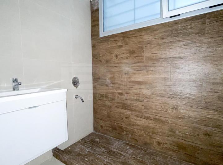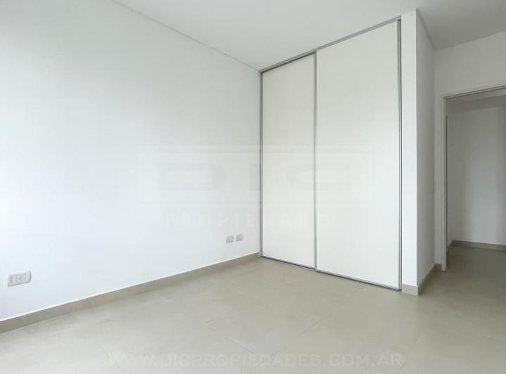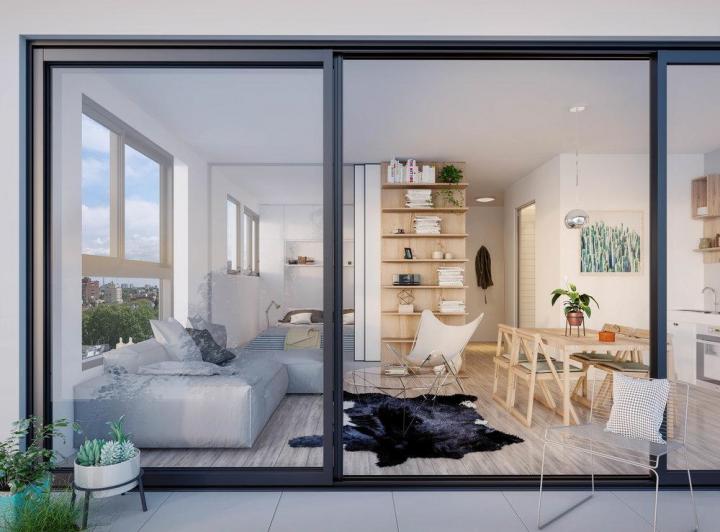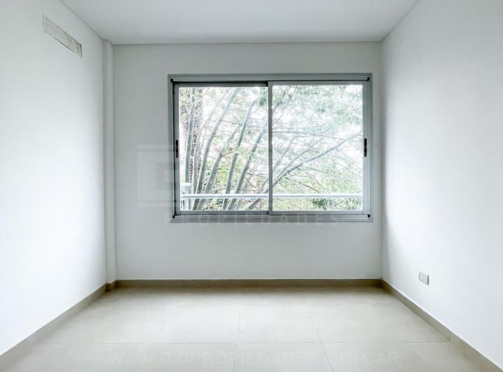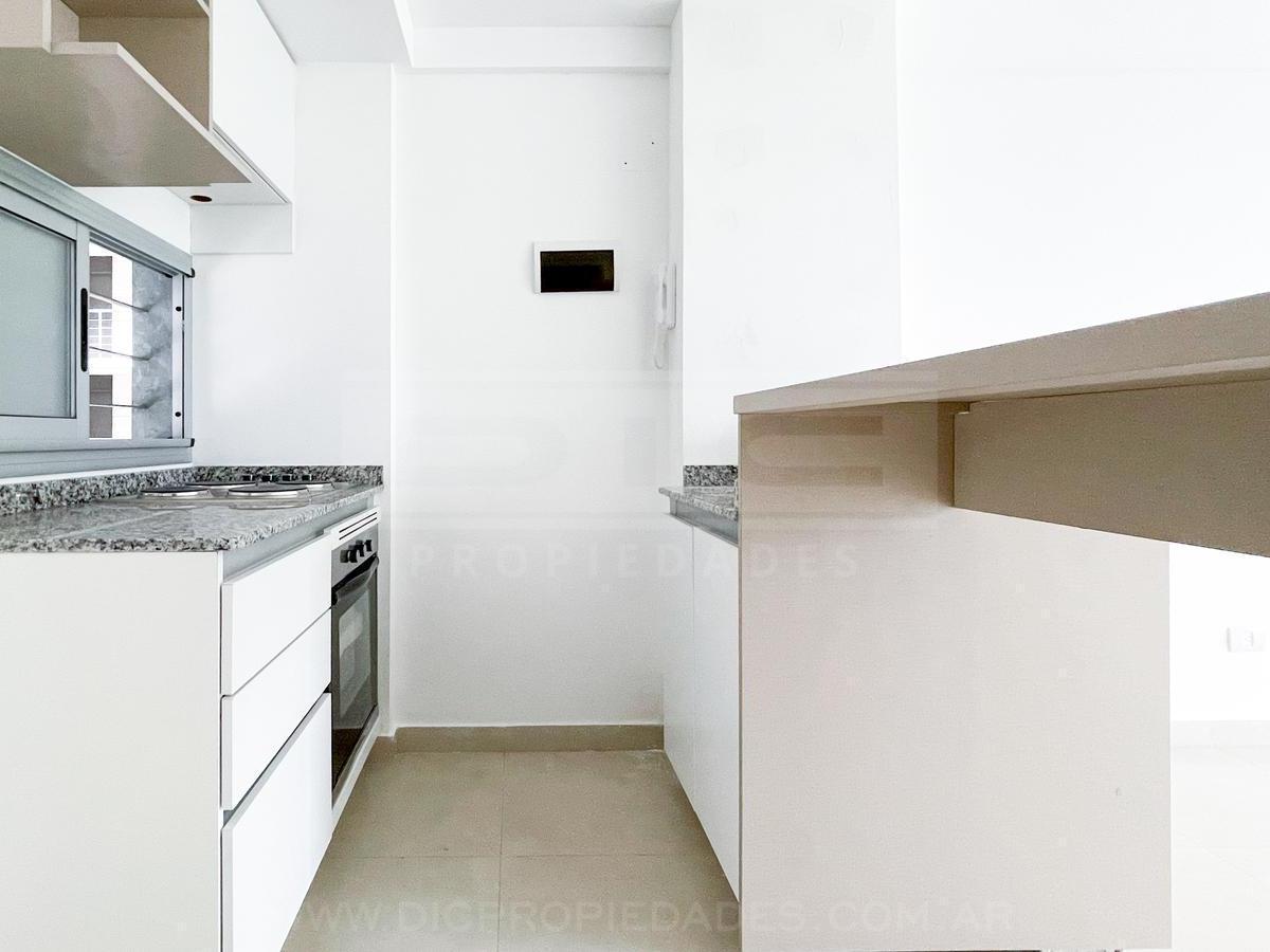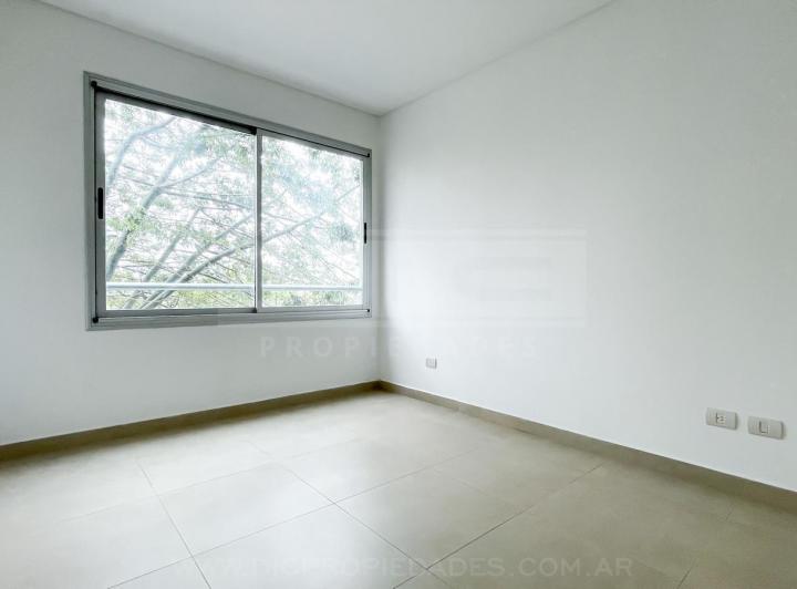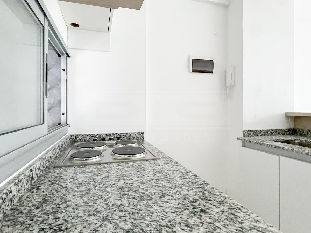 Two-room apartment with a total area of 40.60 m² in Vicente López, north-facing with views of a green space. The unit has a living-dining room with exposed concrete ceiling and access to a balcony, an integrated kitchen with granite countertop, an electric oven, stainless-steel sink with single-lever tap, a bedroom with built-in wardrobe, and a full bathroom. Double-glazed windows, porcelain tile flooring throughout, split-type air-conditioning preinstallation, and central hot and cold water sys