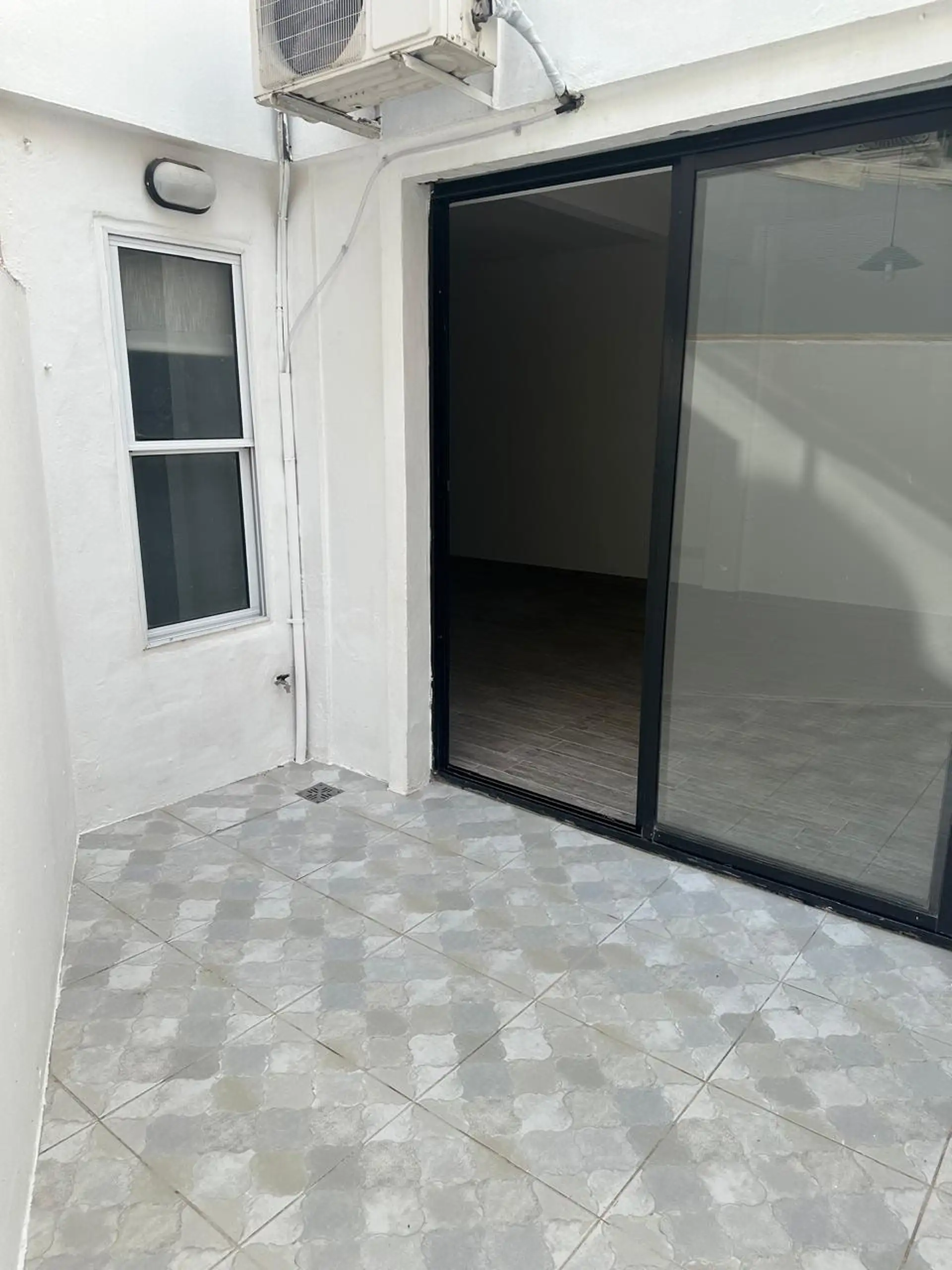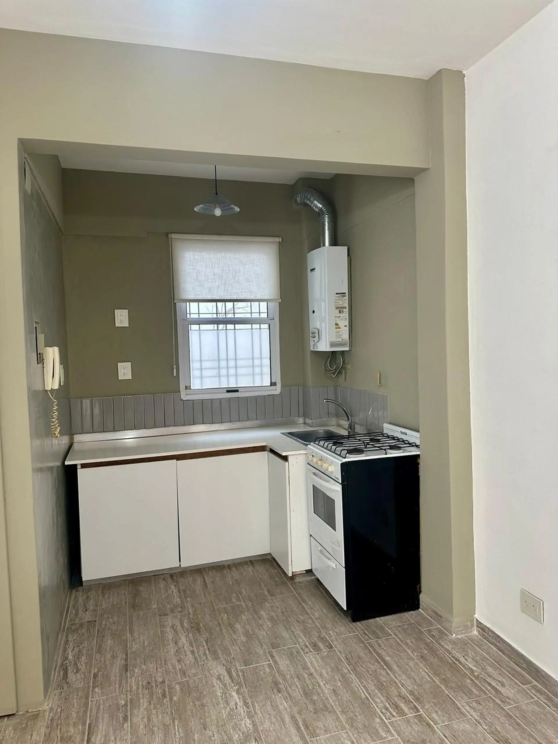Studio apartment in La Lucila, on the ground floor, with direct access to a patio. The main room has polished cement flooring and a double-leaf window with an open-air outlet, and there is split air conditioning (hot/cold). Integrated kitchen with base cabinets and a new water heater (calefón) with an external flue for carbon monoxide; bathroom with bathtub, shower, and screen, plus an exterior window with blackout blinds. Building fees are $4,000 ARS and ABL is $2,000 ARS.