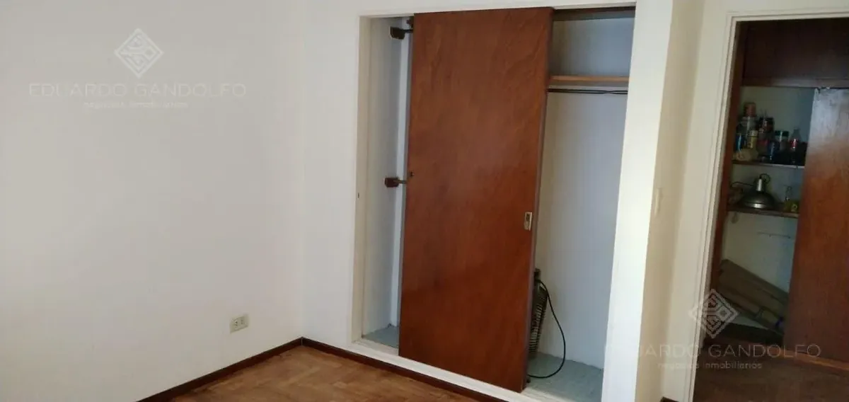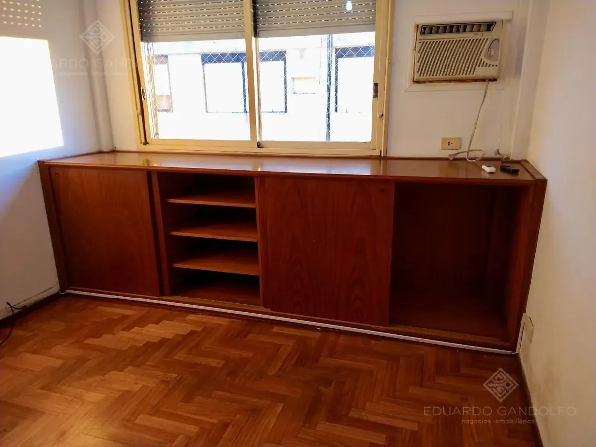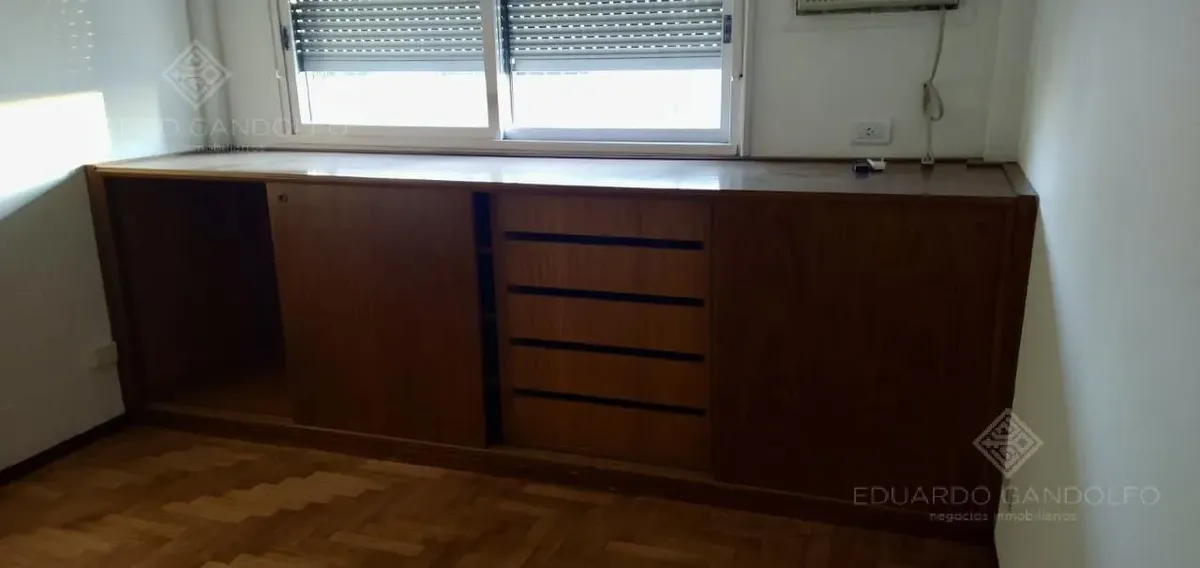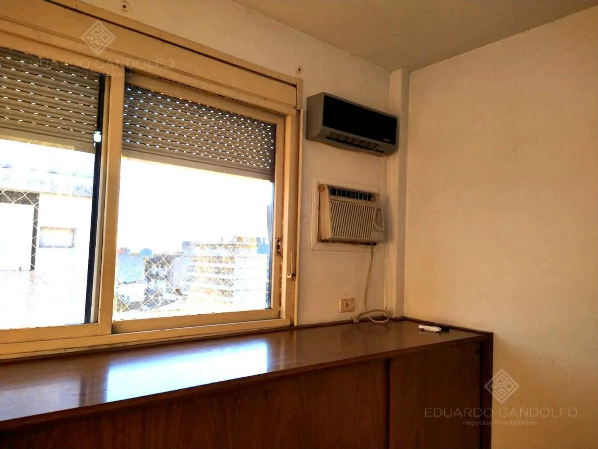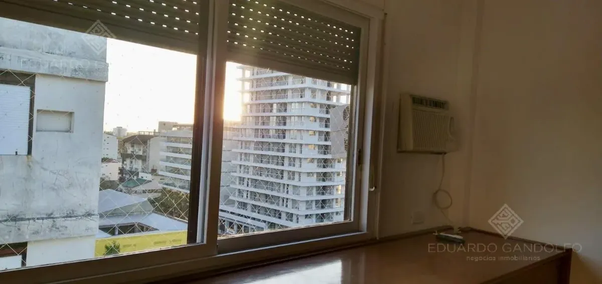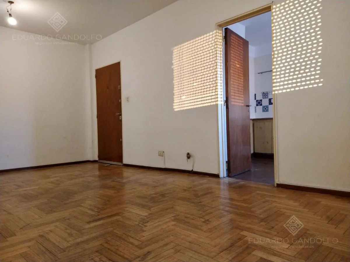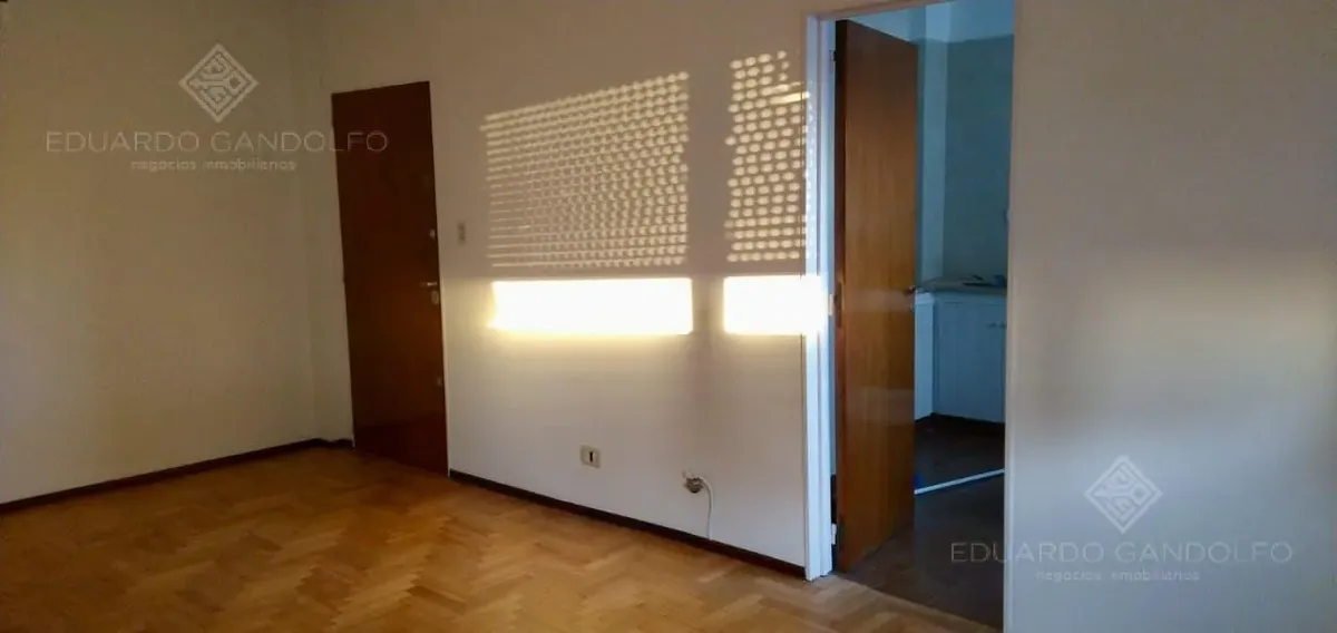 Two-room apartment with 1 bedroom in Vicente López, located on Avenida Maipú near Av. San Martín. Situated on the 8th and top floor of the second building section, with open west-facing views and access via stairs to the terrace; the building has 2 units per floor per section and a total of 4 covered parking spaces, with this unit assigned 1 space. Living-dining area, distribution hall to a bedroom with a built-in wardrobe, full bathroom, and an eat-in kitchen with a built-in laundry area; wood