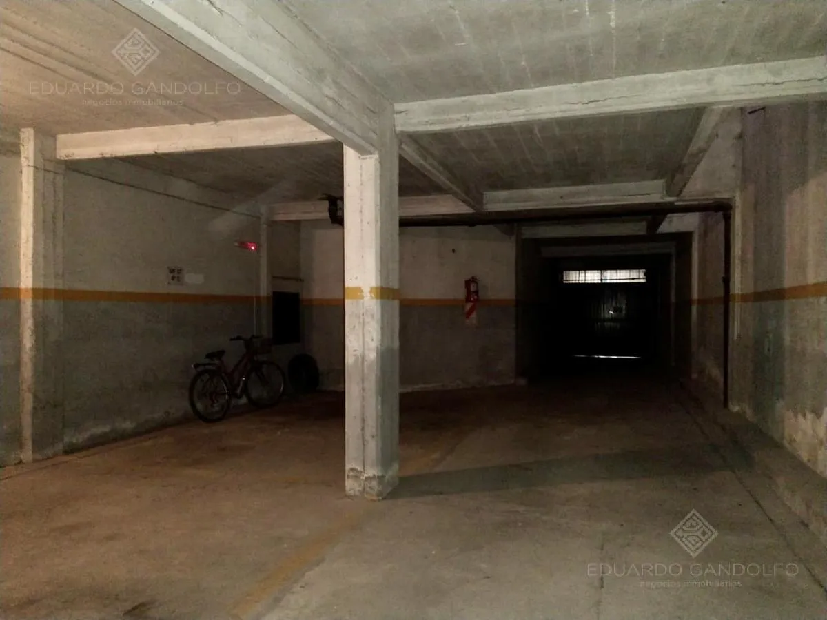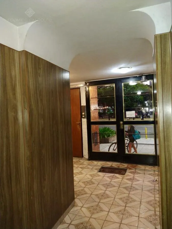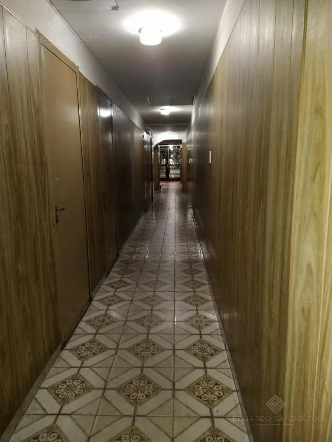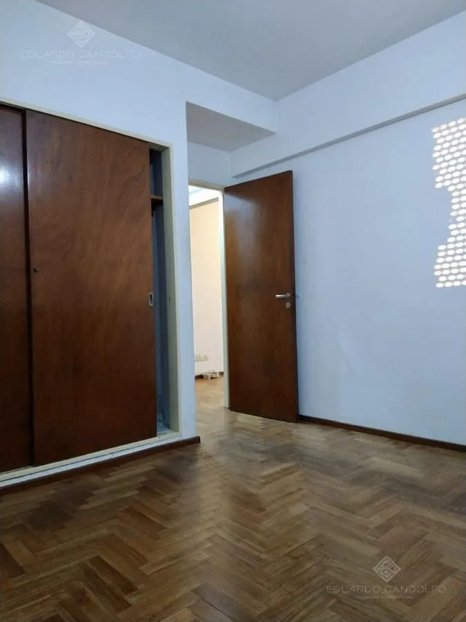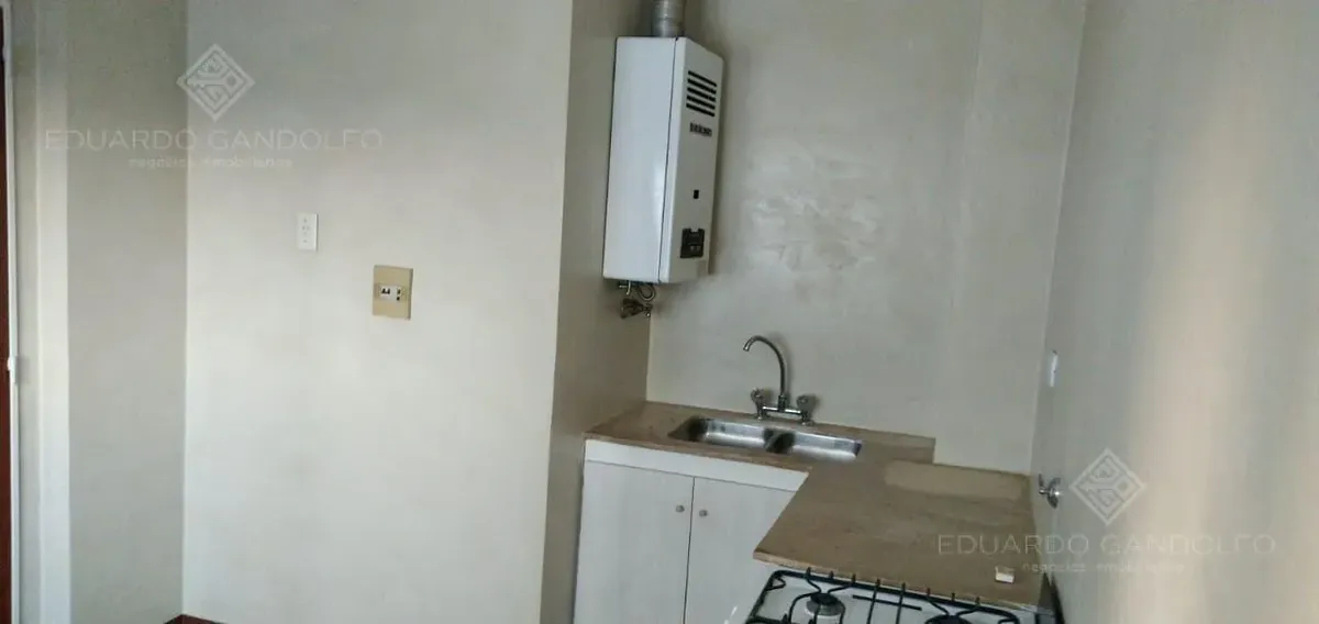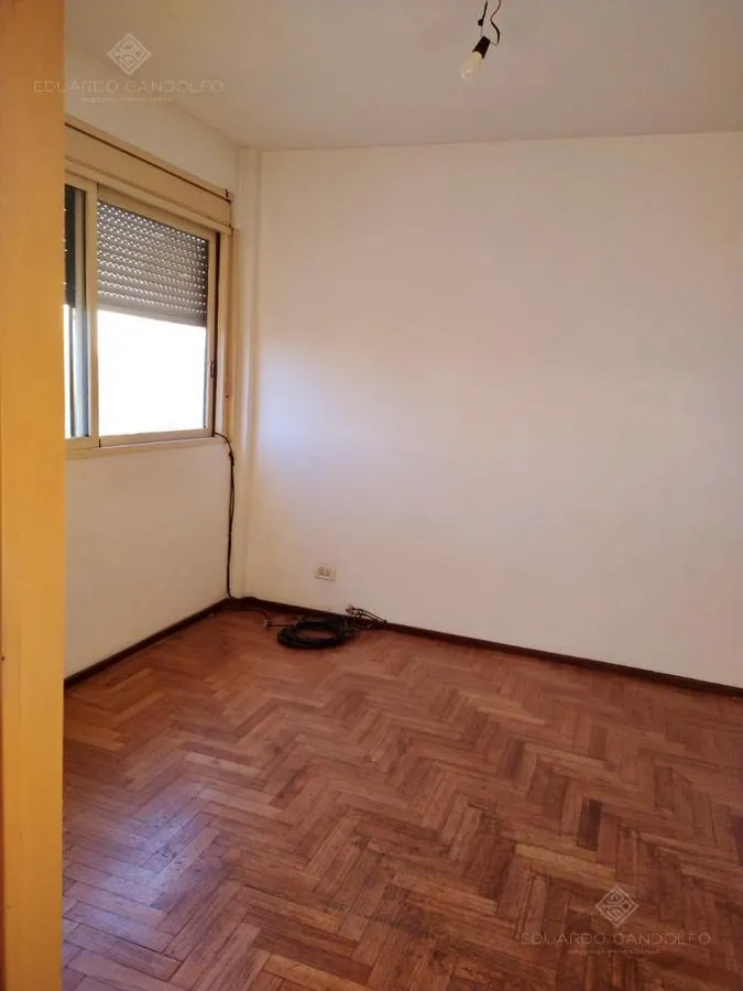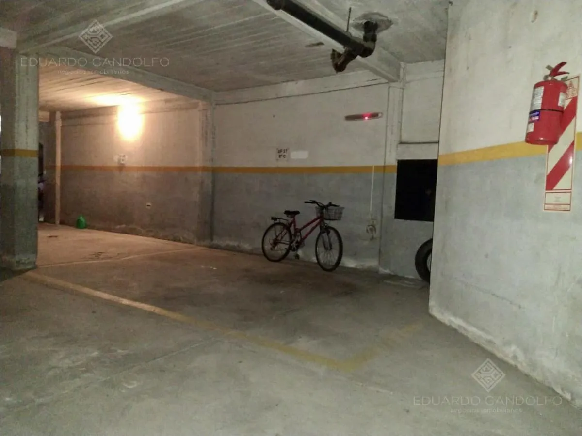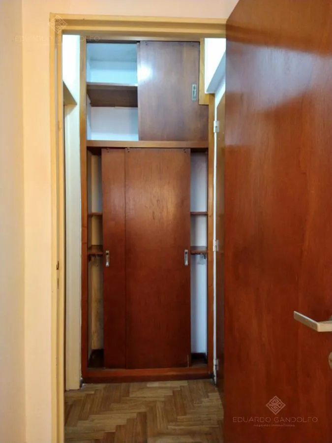 Two-room apartment with 1 bedroom in Vicente López, located on Avenida Maipú near Av. San Martín. Situated on the 8th and top floor of the second building section, with open west-facing views and access via stairs to the terrace; the building has 2 units per floor per section and a total of 4 covered parking spaces, with this unit assigned 1 space. Living-dining area, distribution hall to a bedroom with a built-in wardrobe, full bathroom, and an eat-in kitchen with a built-in laundry area; wood