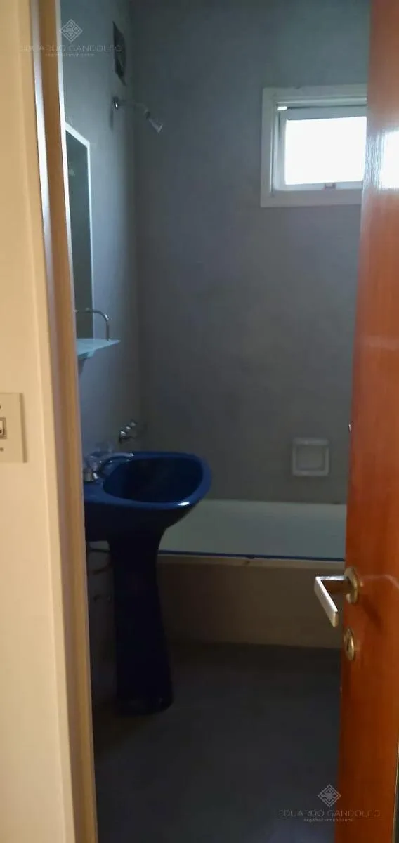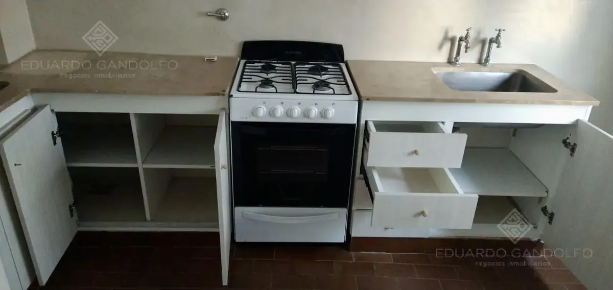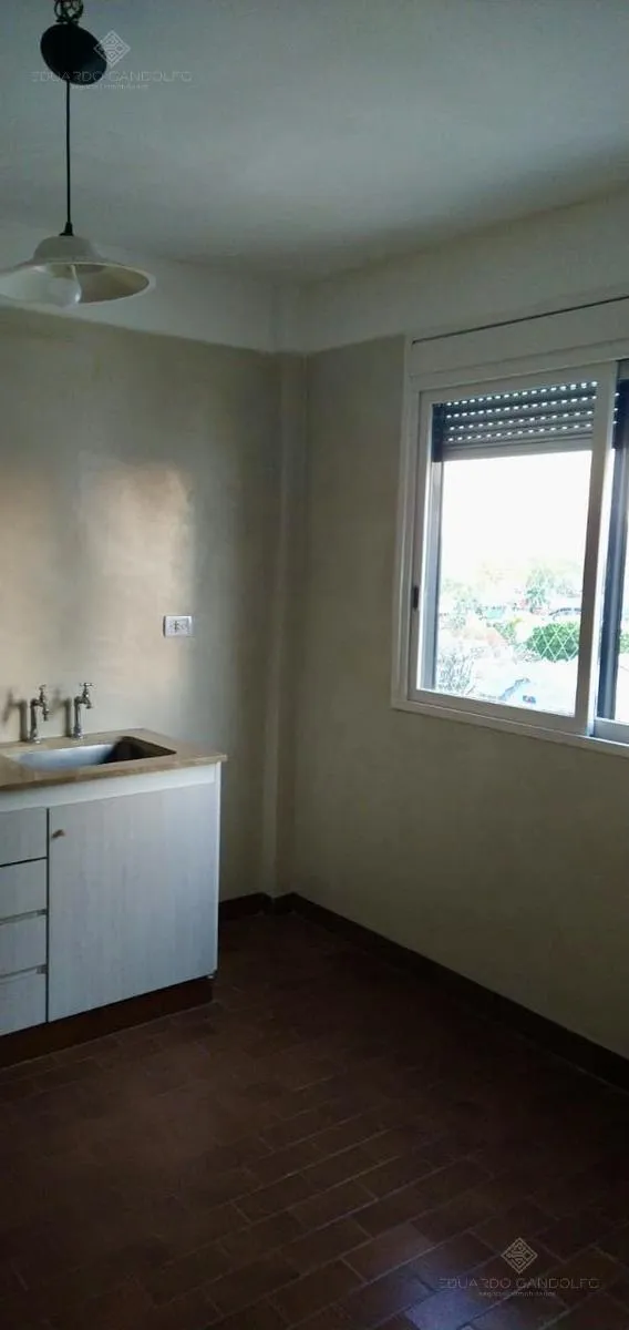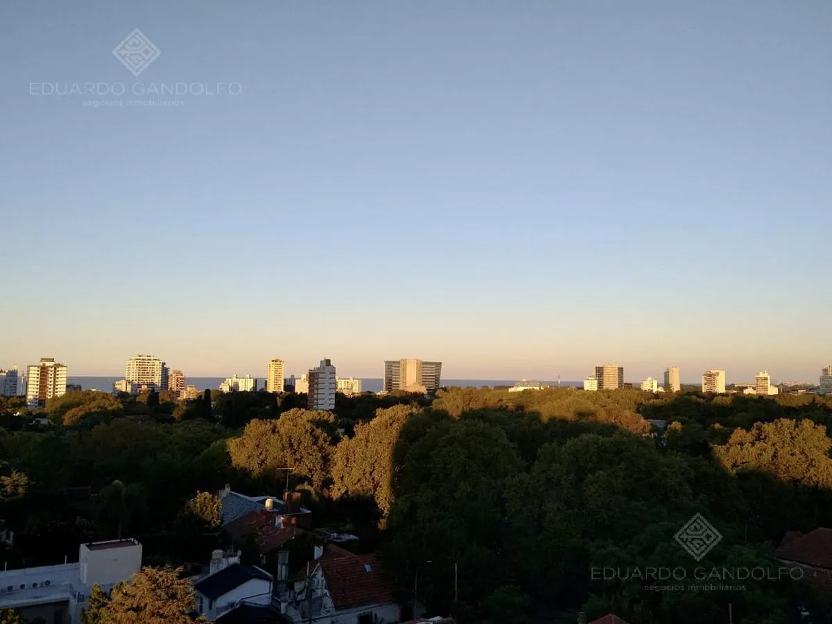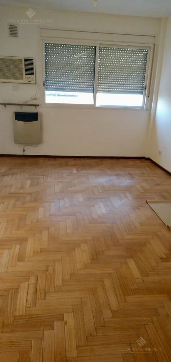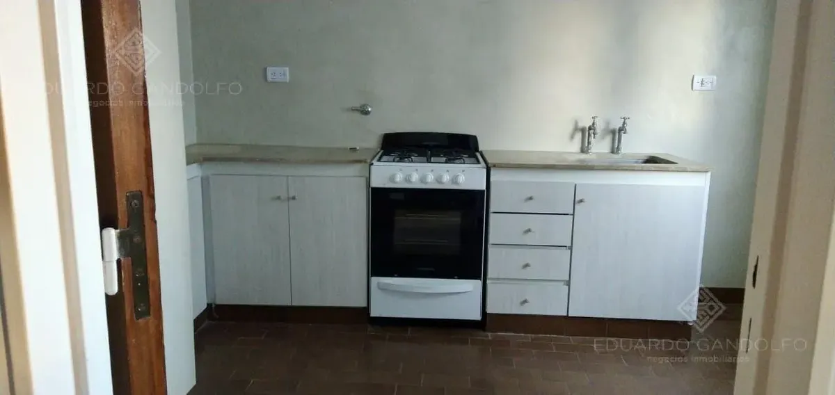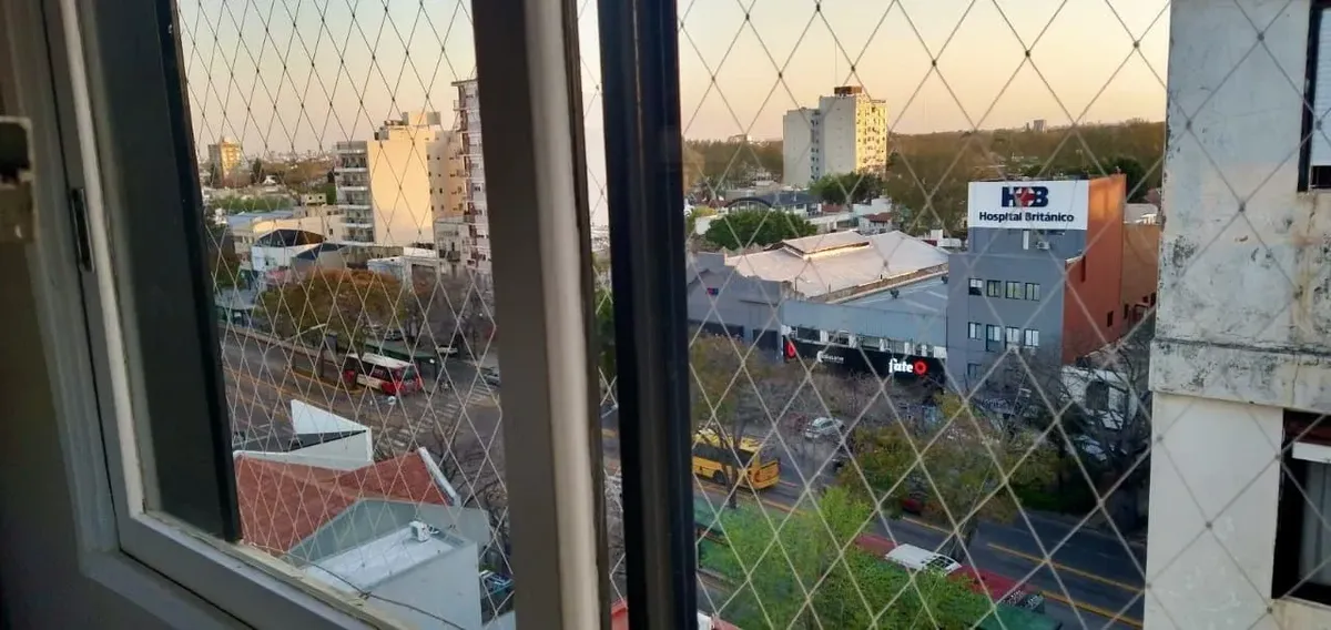 Two-room apartment with 1 bedroom in Vicente López, located on Avenida Maipú near Av. San Martín. Situated on the 8th and top floor of the second building section, with open west-facing views and access via stairs to the terrace; the building has 2 units per floor per section and a total of 4 covered parking spaces, with this unit assigned 1 space. Living-dining area, distribution hall to a bedroom with a built-in wardrobe, full bathroom, and an eat-in kitchen with a built-in laundry area; wood