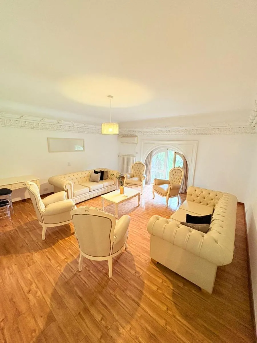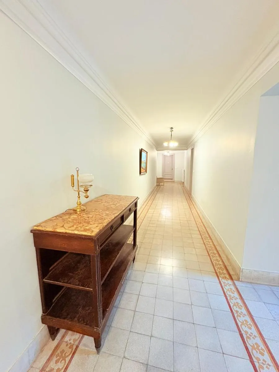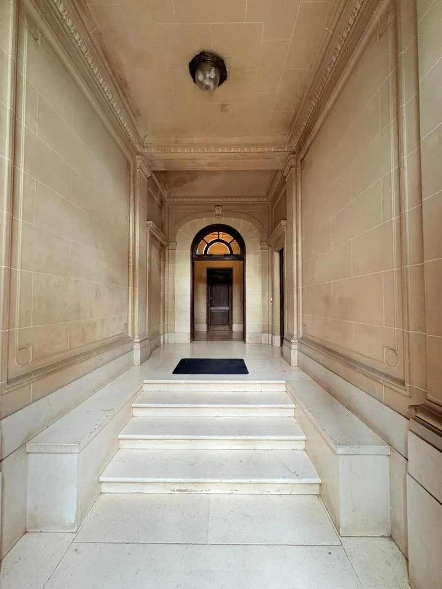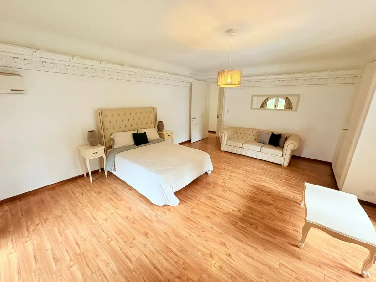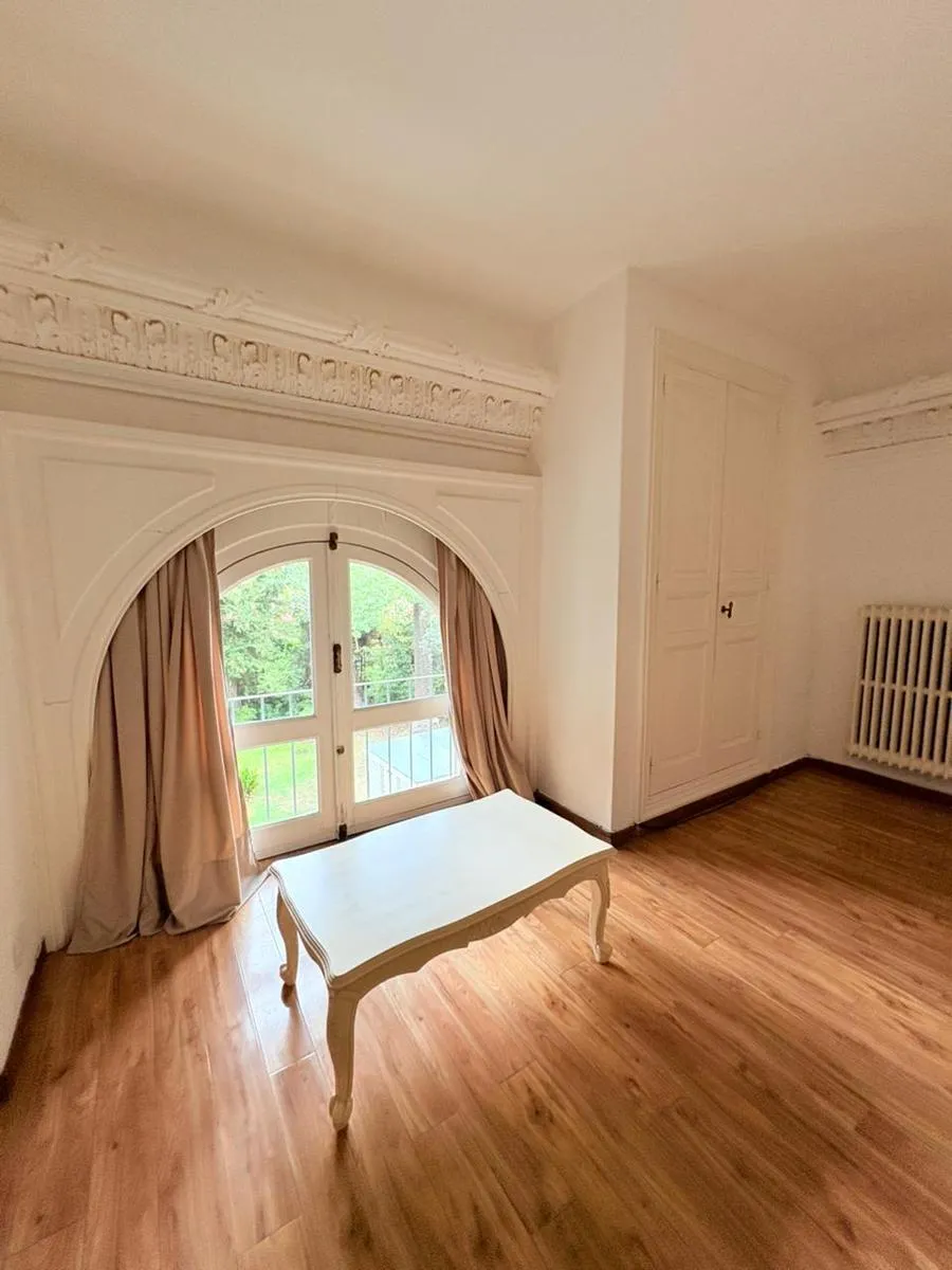 One-bedroom apartment on the first floor of Palacio Sans Souci in Punta Chica, San Fernando. The bedroom has wooden floors, high ceilings with original mouldings, and arched windows with open views over the greenery and the palace pool. The apartment has a full marble-tiled bathroom with natural ventilation and a traditional bathtub, plus a classic-style toilet. Central heating is provided by the palace, with split air-conditioning units installed. Covered in the building fees are three-times-we