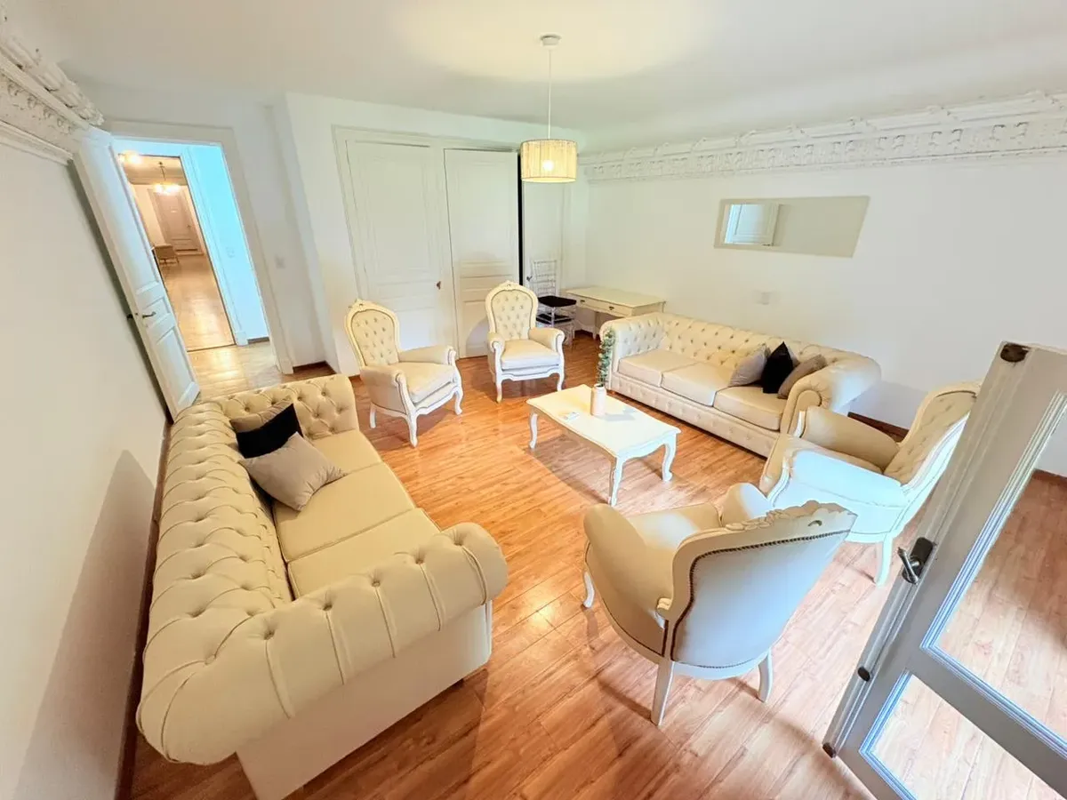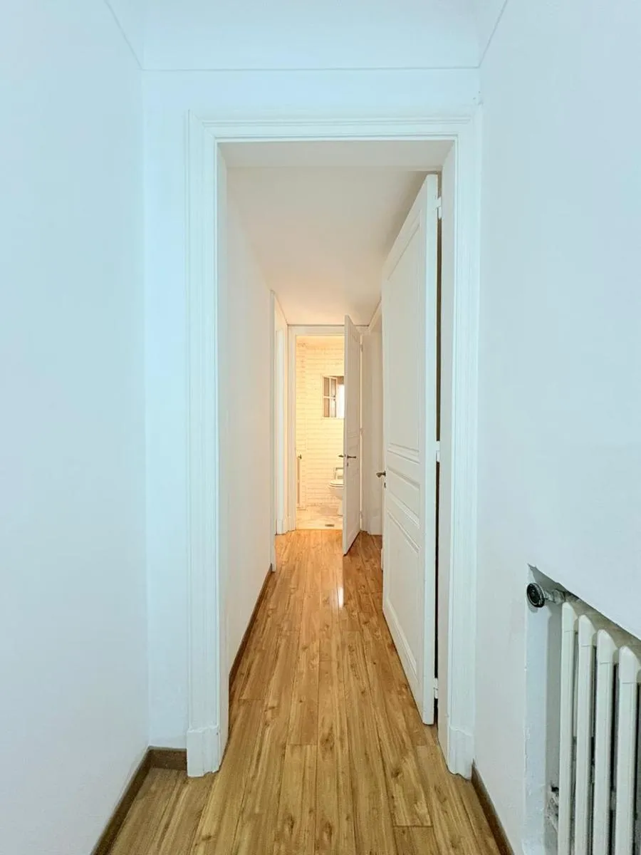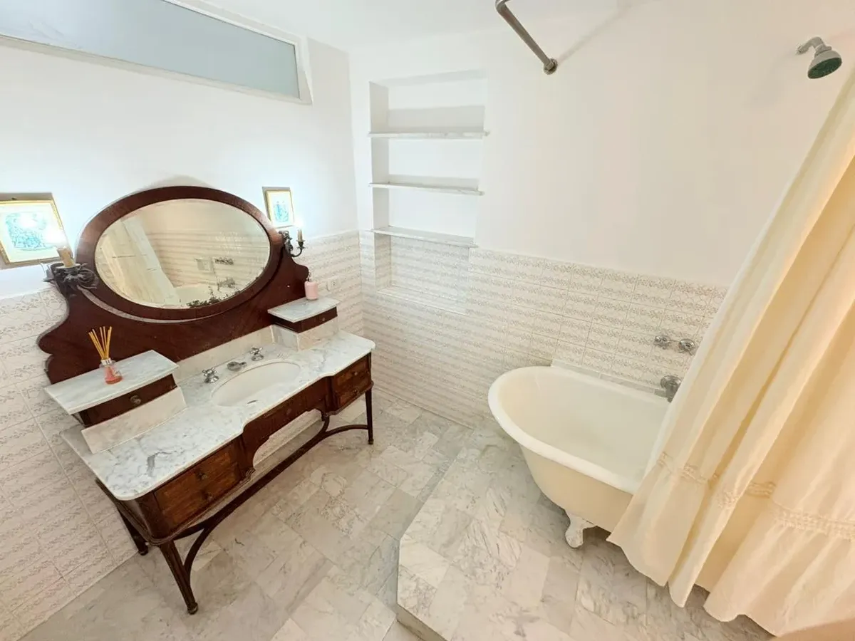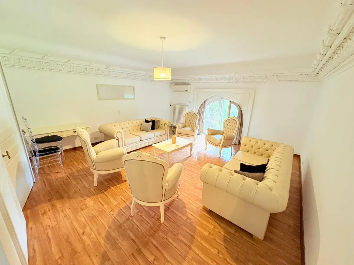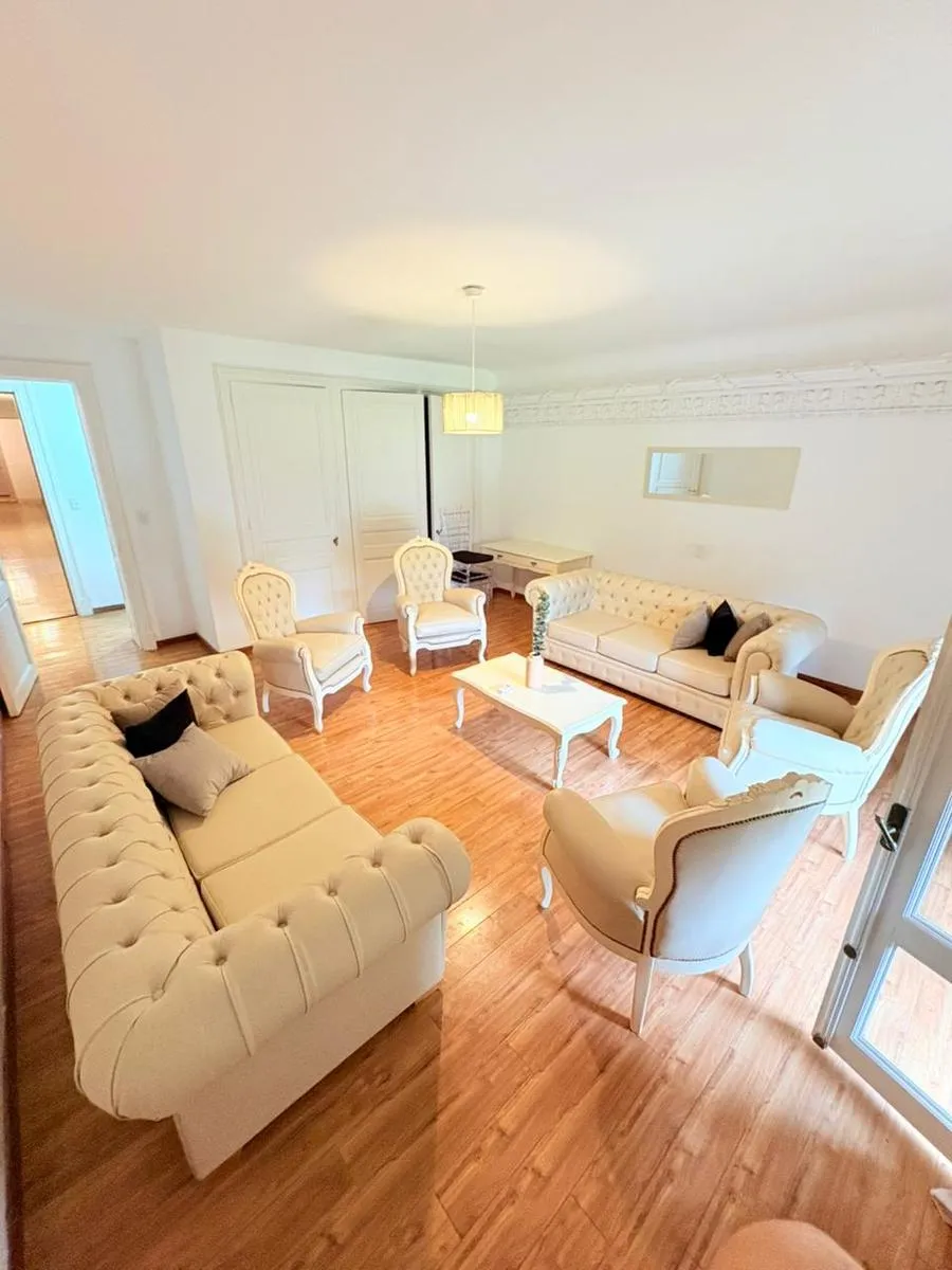 One-bedroom apartment on the first floor of Palacio Sans Souci in Punta Chica, San Fernando. The bedroom has wooden floors, high ceilings with original mouldings, and arched windows with open views over the greenery and the palace pool. The apartment has a full marble-tiled bathroom with natural ventilation and a traditional bathtub, plus a classic-style toilet. Central heating is provided by the palace, with split air-conditioning units installed. Covered in the building fees are three-times-we