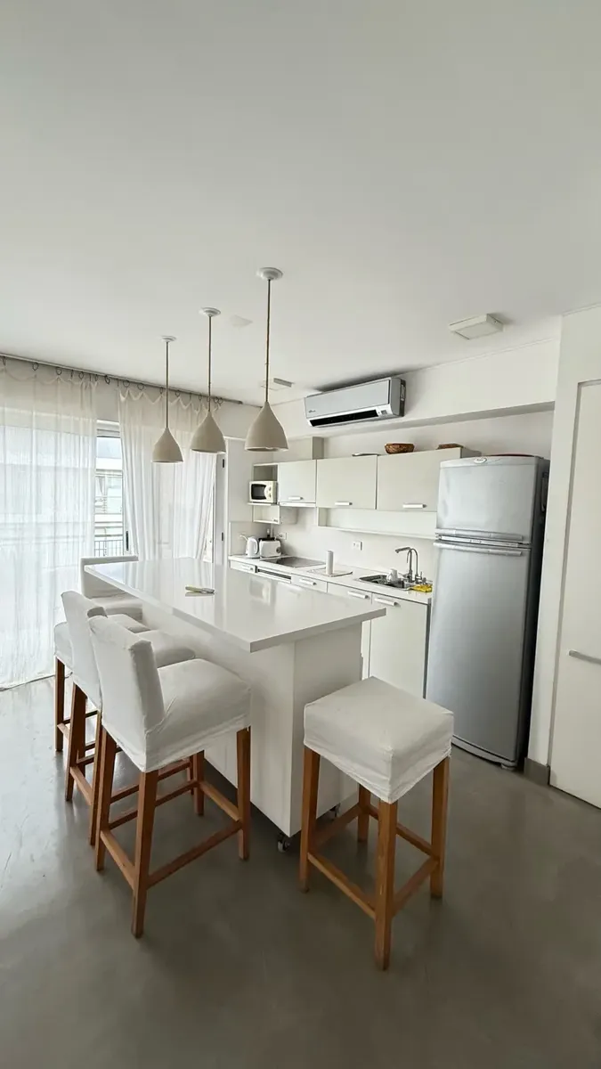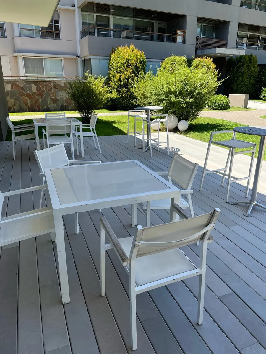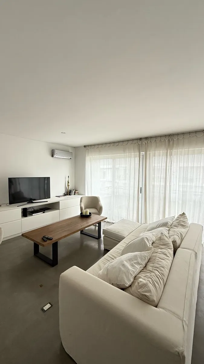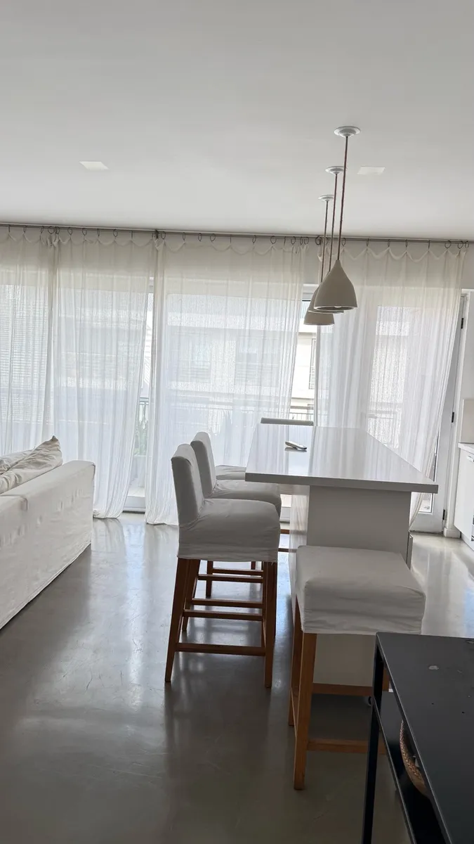 Fully furnished apartment available from July 2026 for annual or temporary rental. The unit is a three-room layout that has been converted into two, with a large en-suite bedroom area and a spacious living-dining room, plus a second bathroom available. It was refurbished with an island and a laundry area, and includes a large terrace with outdoor seating and a private grill. The complex has a gym, a communal room (SUM), grills, and an outdoor pool; there is underground parking and courtesy parki