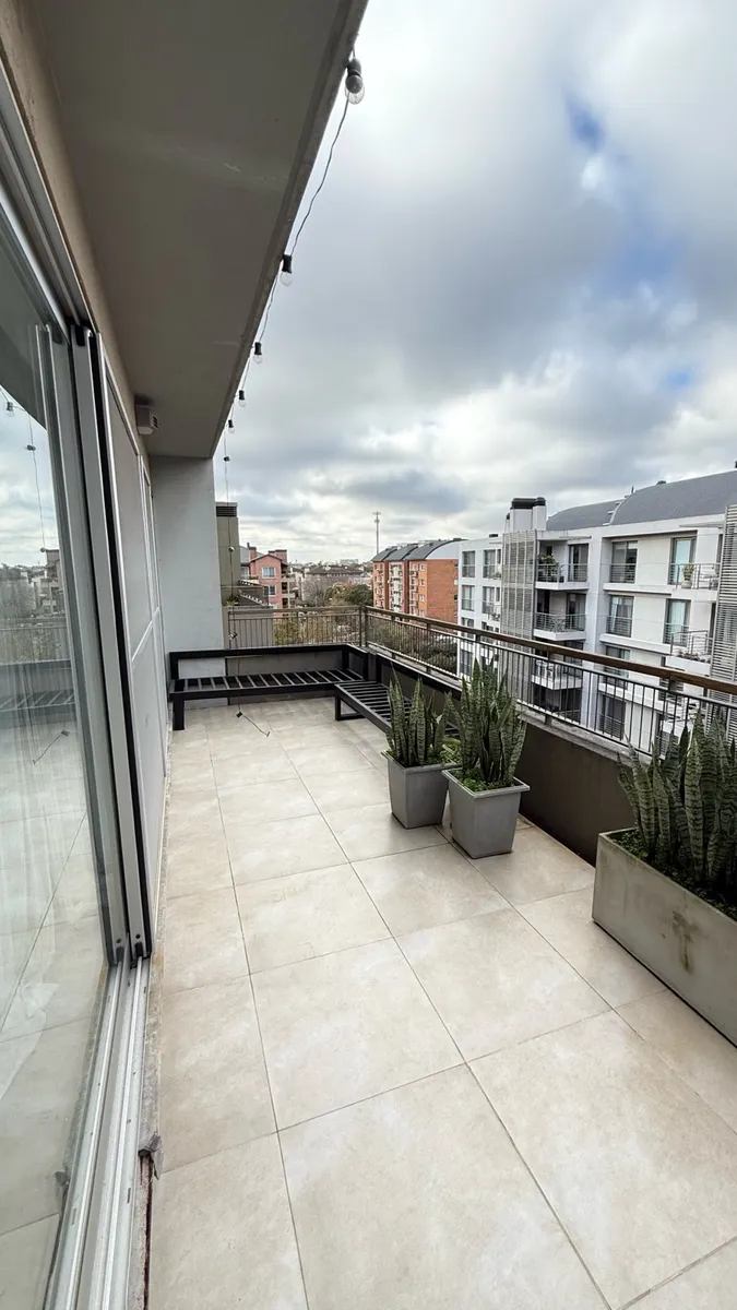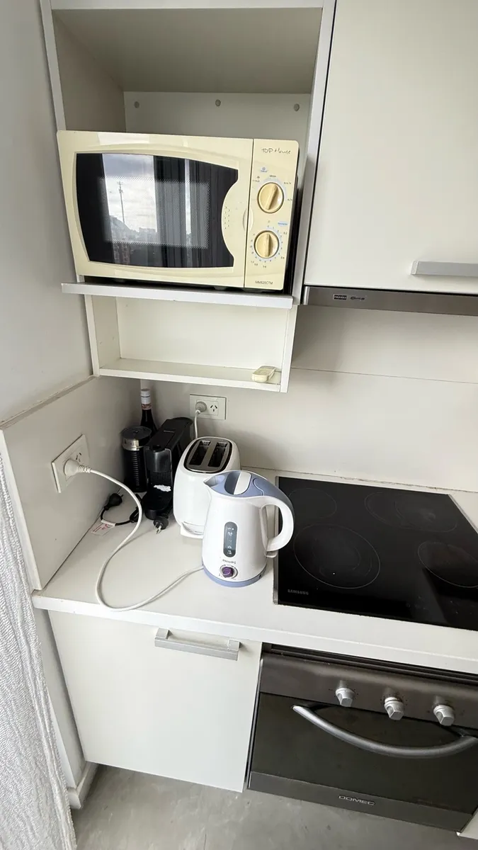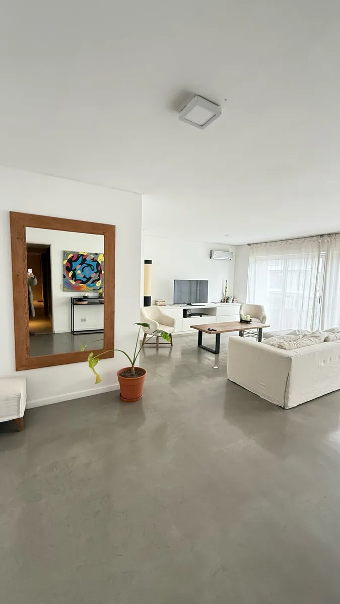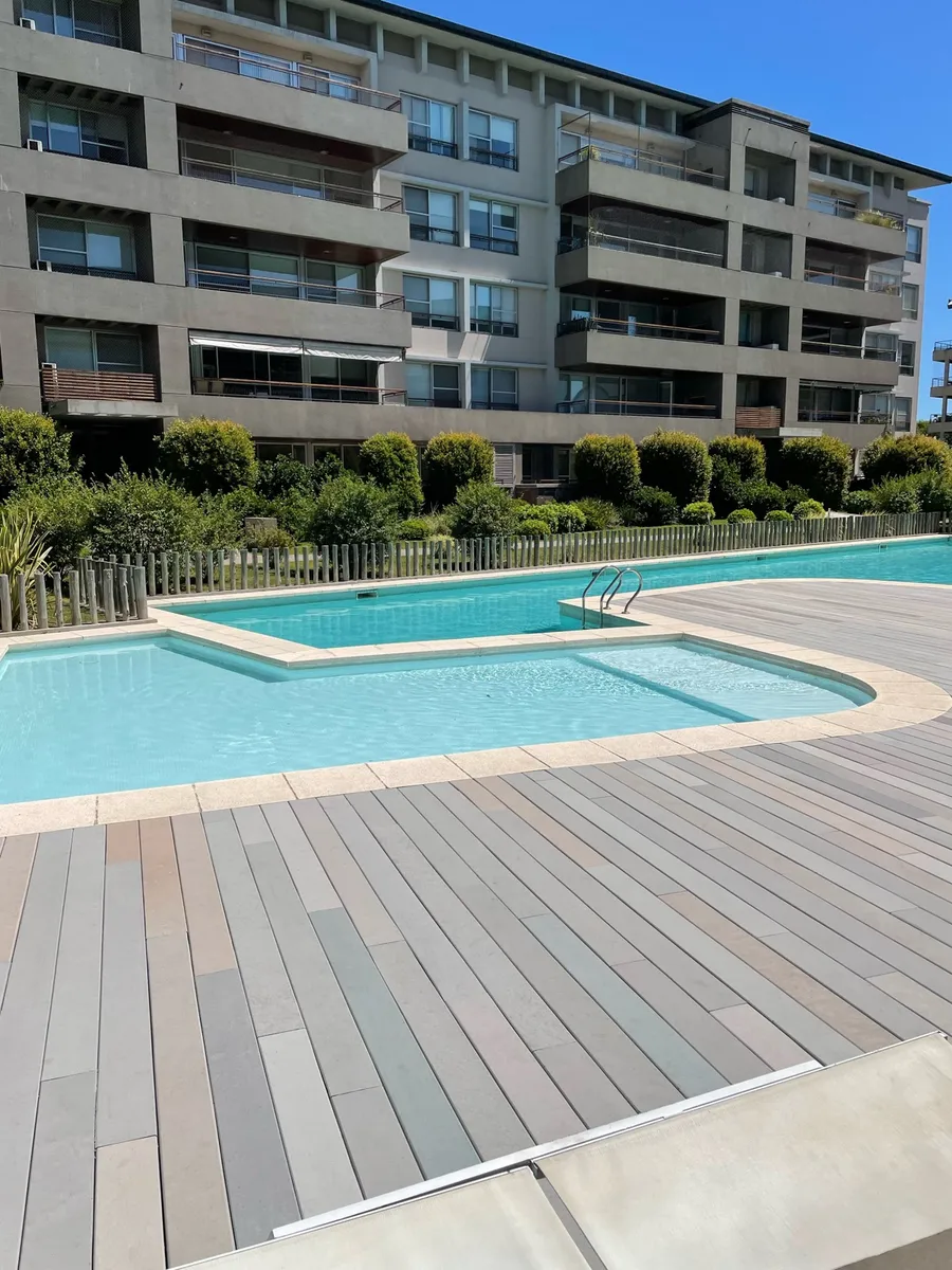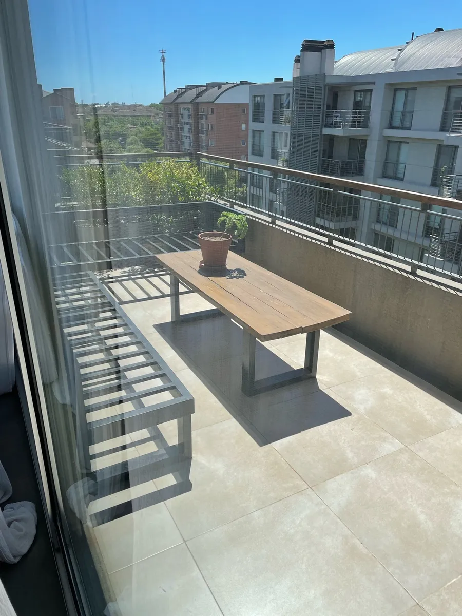 Fully furnished apartment available from July 2026 for annual or temporary rental. The unit is a three-room layout that has been converted into two, with a large en-suite bedroom area and a spacious living-dining room, plus a second bathroom available. It was refurbished with an island and a laundry area, and includes a large terrace with outdoor seating and a private grill. The complex has a gym, a communal room (SUM), grills, and an outdoor pool; there is underground parking and courtesy parki