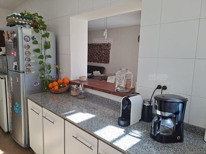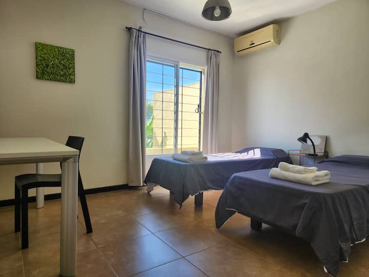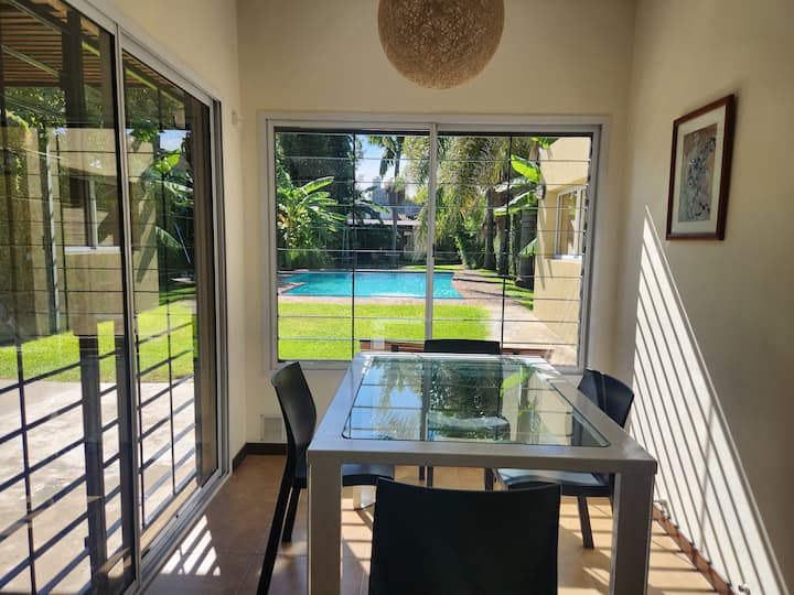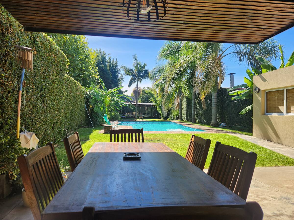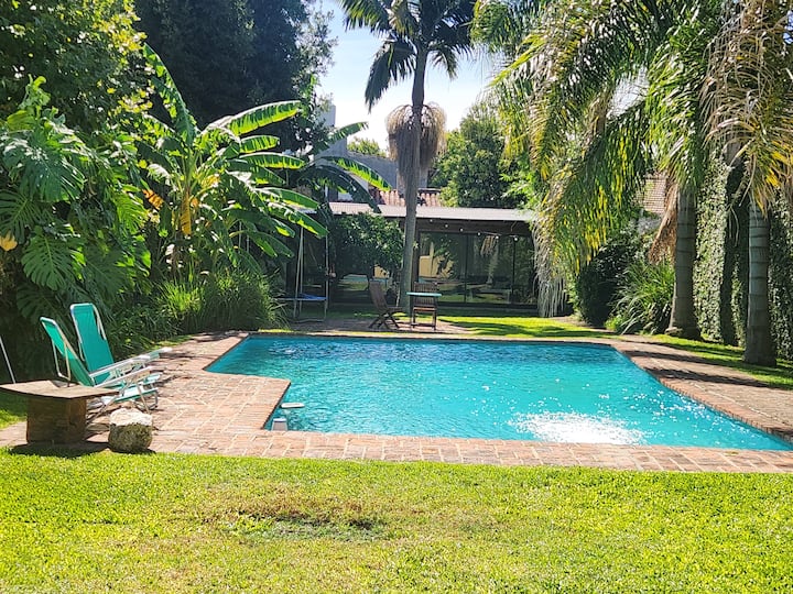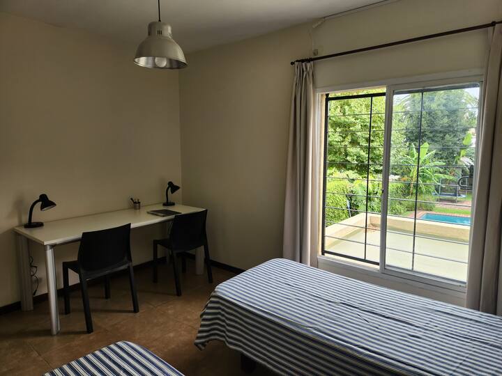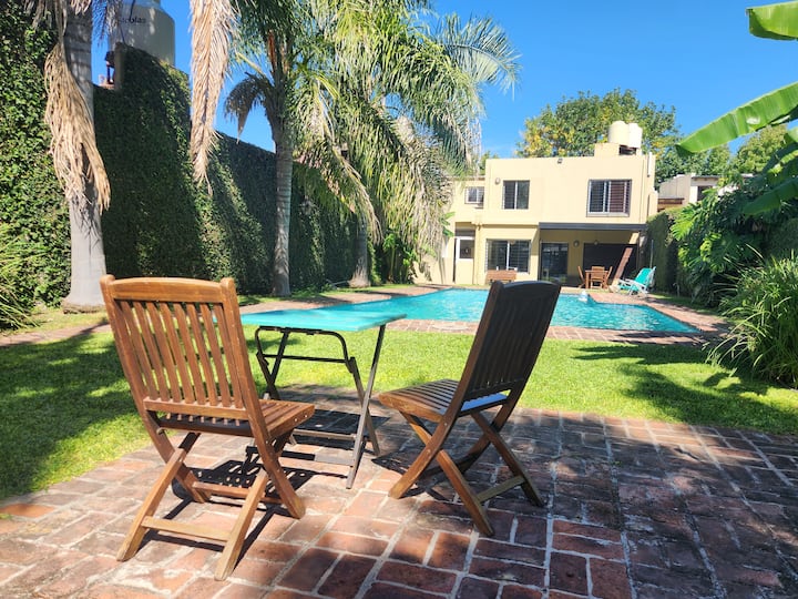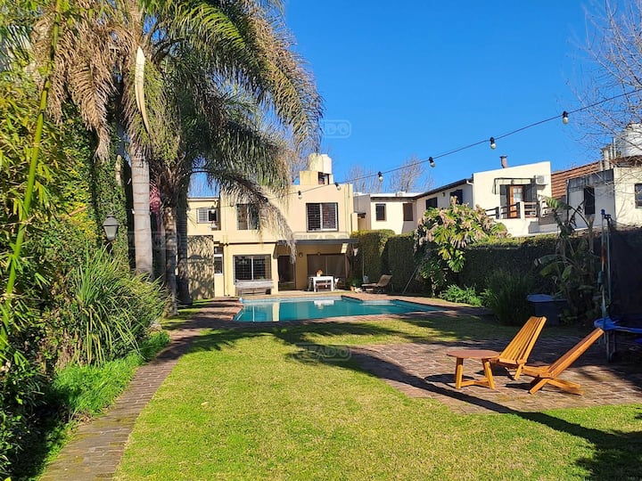 Double room in a house in Victoria. Shared kitchen, living and dining areas with TV, plus a dining room with garden views. The property has a large pool, garden and barbecue (quincho). Public transport includes buses 2 blocks away and Mitre train station 4 blocks away.