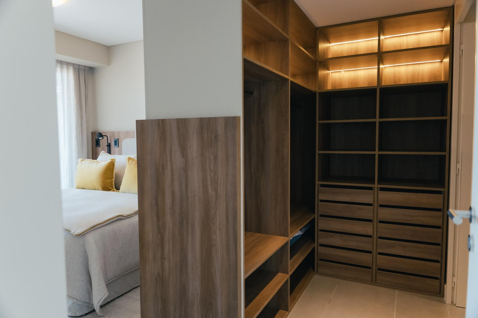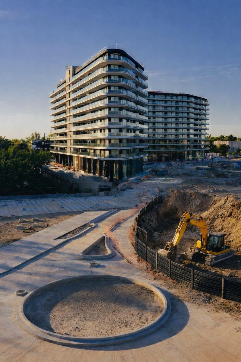 Two-room apartment in Edificio Marina, within the Bliss Buenos Aires development, available from June 2026. The unit has a living-dining area with direct access to a long balcony, an integrated kitchen with space for a double-door refrigerator and a dishwasher, and a master bedroom in suite with access to the same long balcony. There is also a separate reception toilet and an independent laundry area.