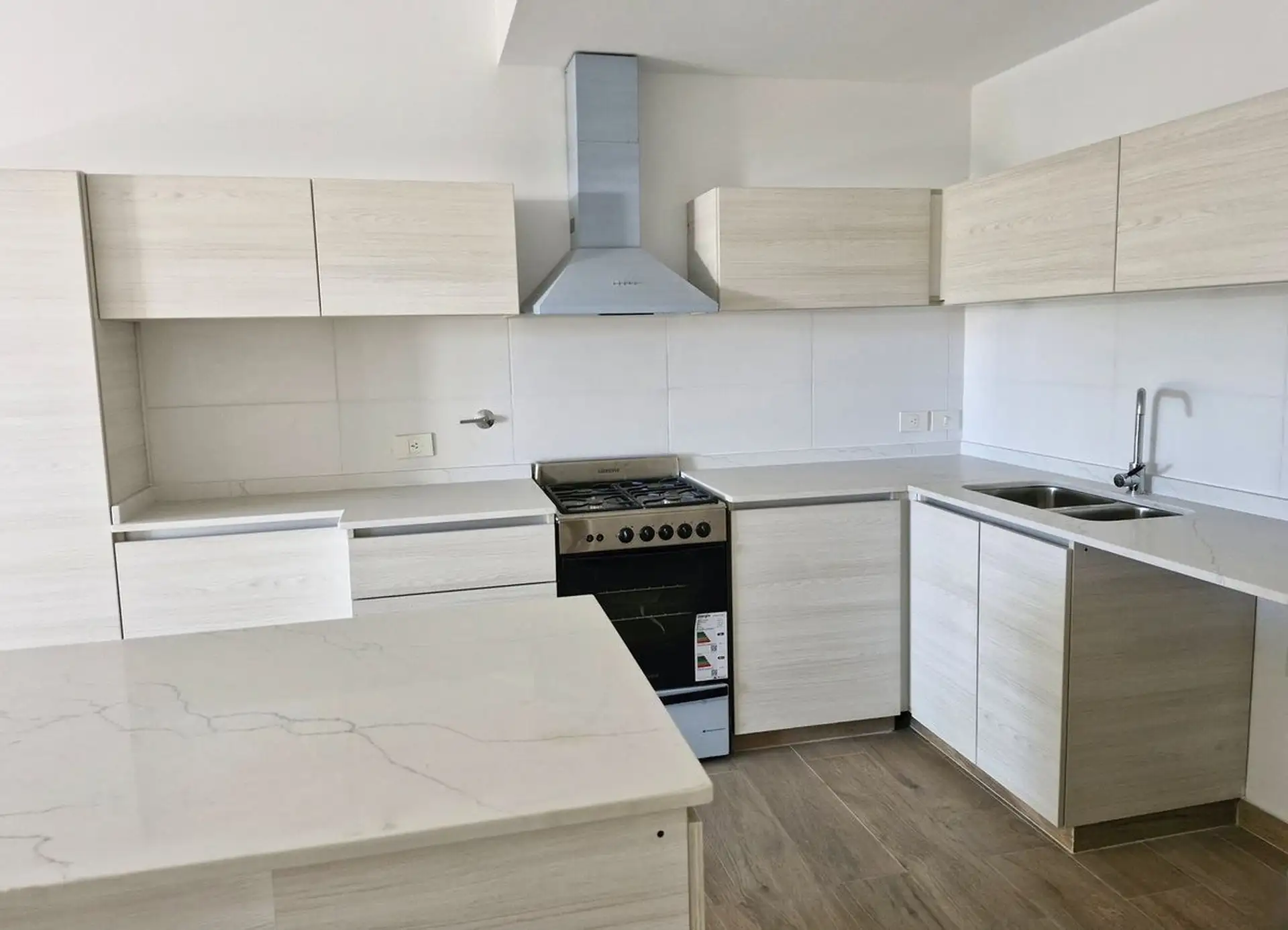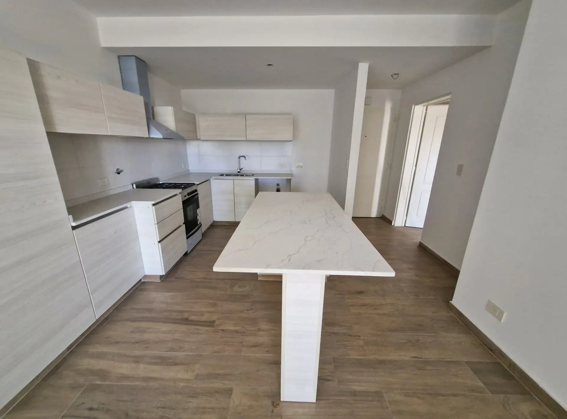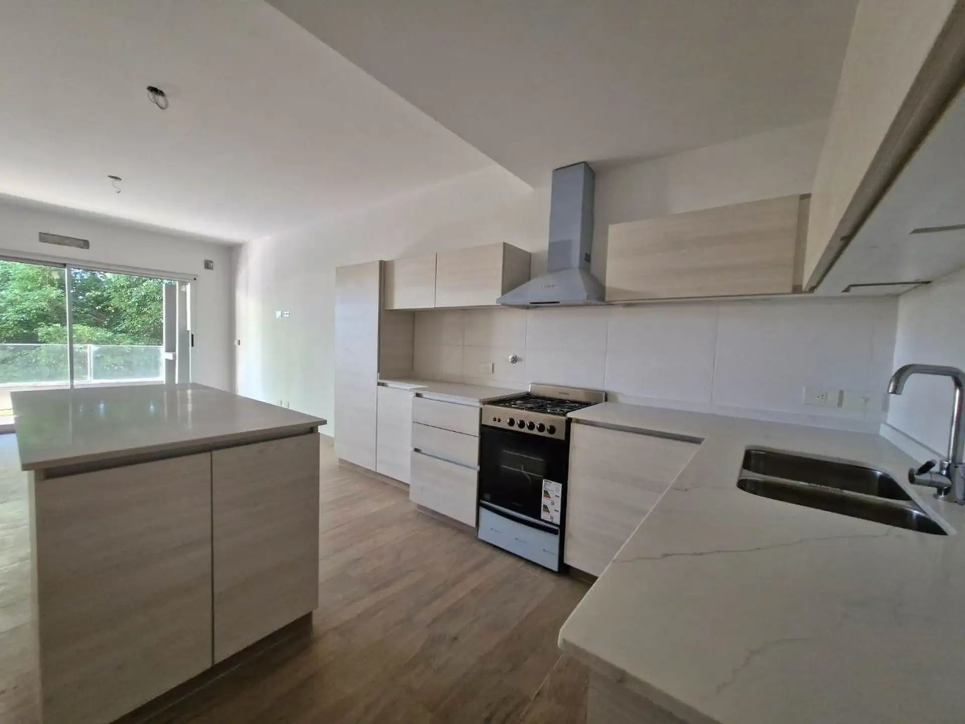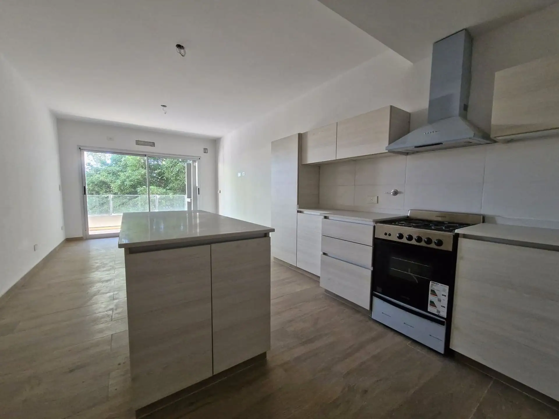 New-build two-room apartment in a modern building, street-facing on Av. Del Libertador in Victoria, San Fernando. It has 1 bedroom, a living-dining area with access to a private terrace, a continuous front balcony with room for a private grill, a semi-integrated kitchen with an island, and 1 full bathroom in a semi-suite configuration with a bathtub. The apartment includes fixed parking space (N25) on the ground floor with access via a ramp and gate; kitchen gas cooking and an extractor hood, pl