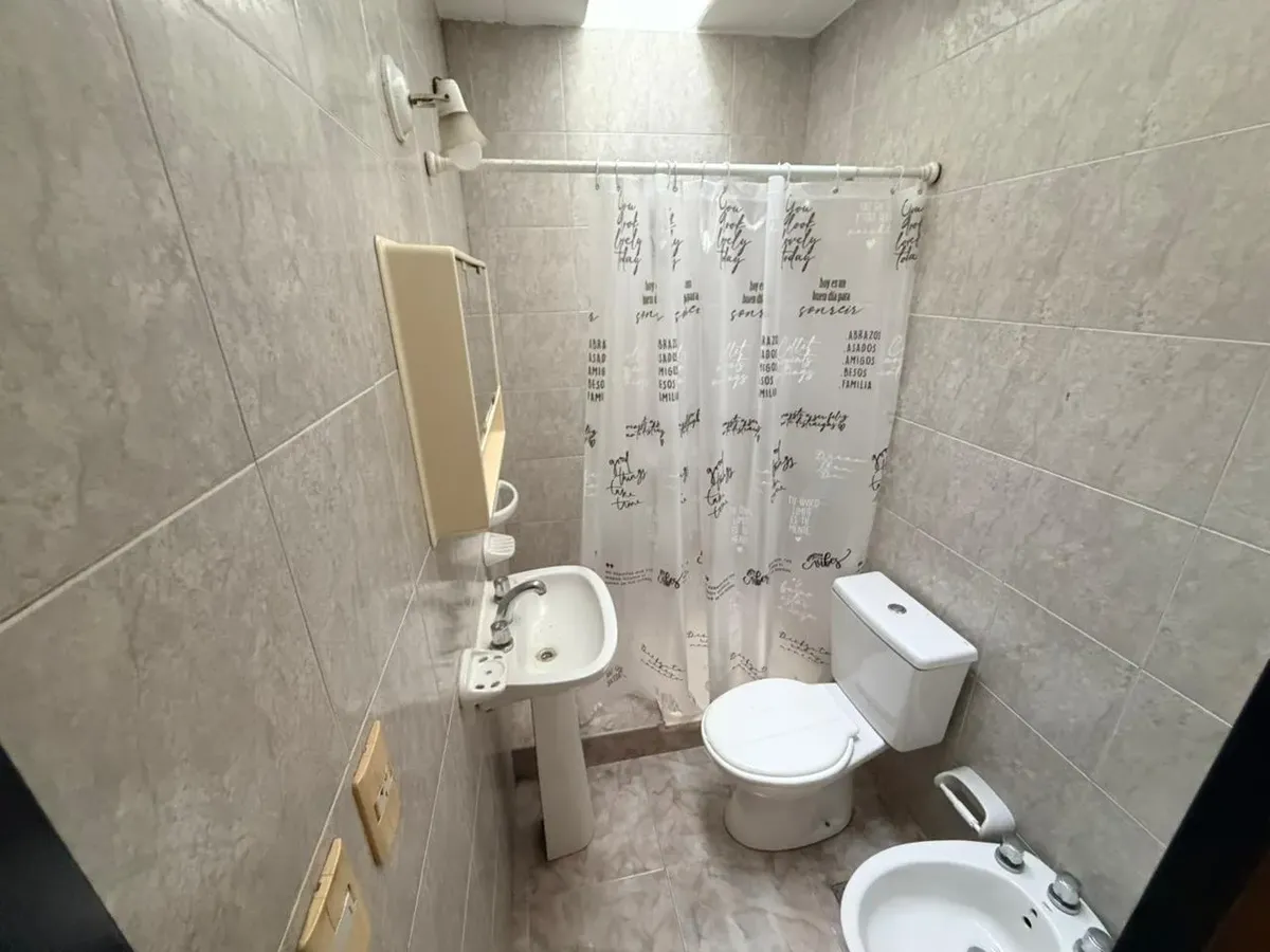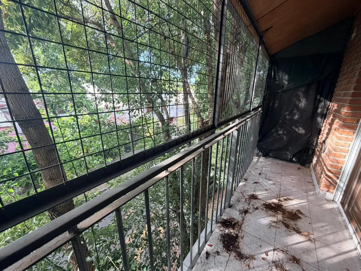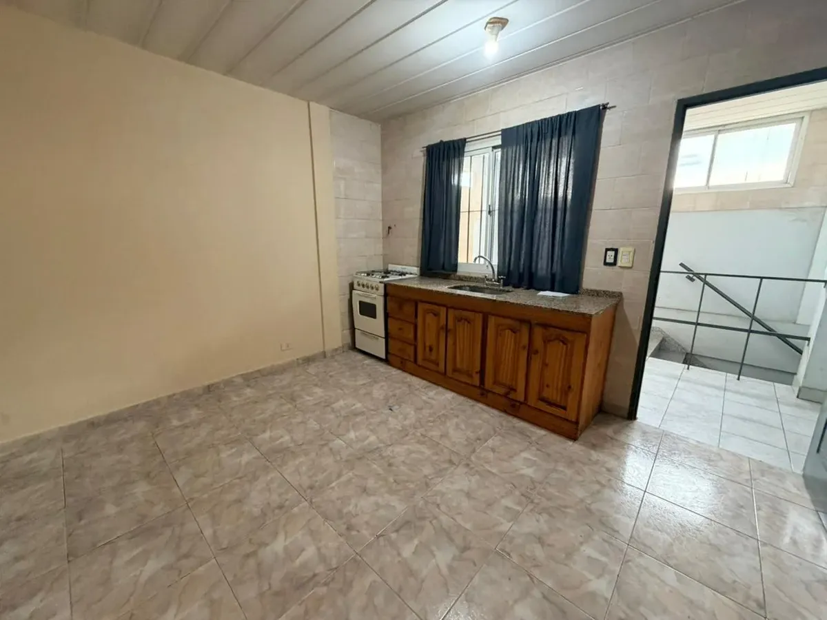 Two-room apartment for rent in Victoria, unit 3 at FOUNIER 3110. It has a living-dining area, kitchen, full bathroom, and 1 bedroom, with a private balcony and an individual laundry area plus a communal roof terrace. Building fees are listed as approximately $30,000, AYSA as approximately $20,000, and ABL as approximately $57,000; electricity (Edenor) and gas are independent. Small pets are allowed (cat or small dog).