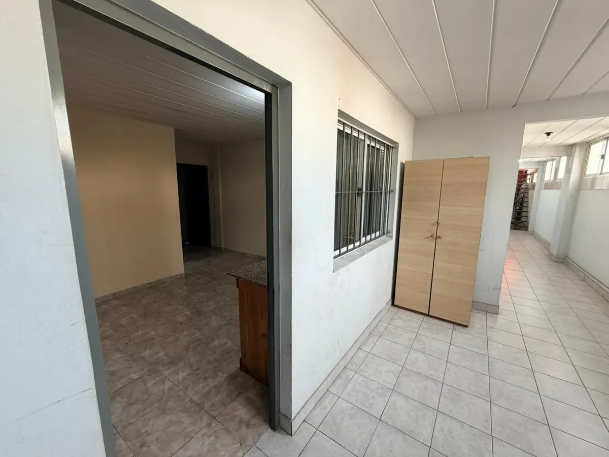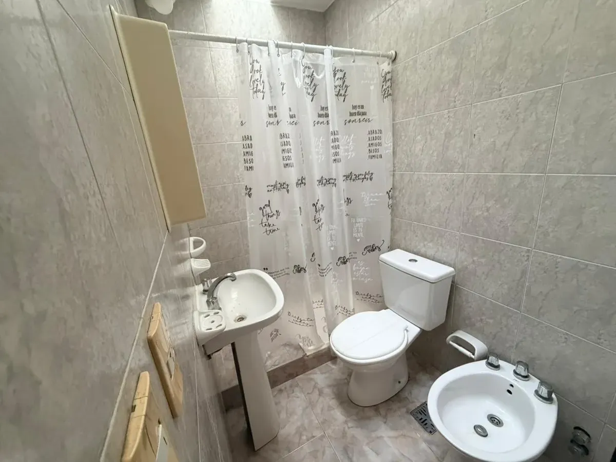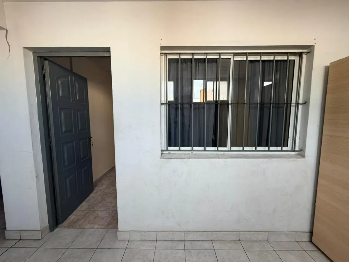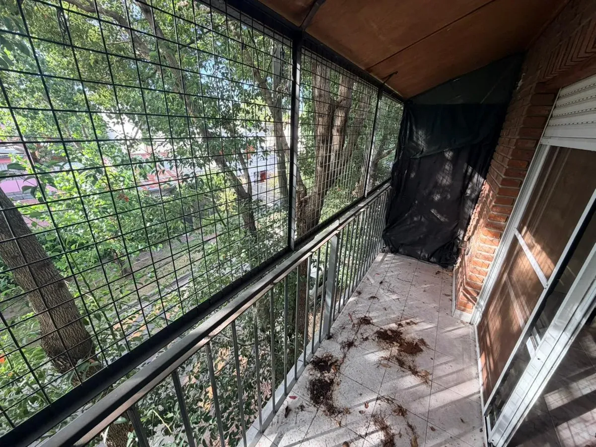 Two-room apartment for rent in Victoria, unit 3 at FOUNIER 3110. It has a living-dining area, kitchen, full bathroom, and 1 bedroom, with a private balcony and an individual laundry area plus a communal roof terrace. Building fees are listed as approximately $30,000, AYSA as approximately $20,000, and ABL as approximately $57,000; electricity (Edenor) and gas are independent. Small pets are allowed (cat or small dog).