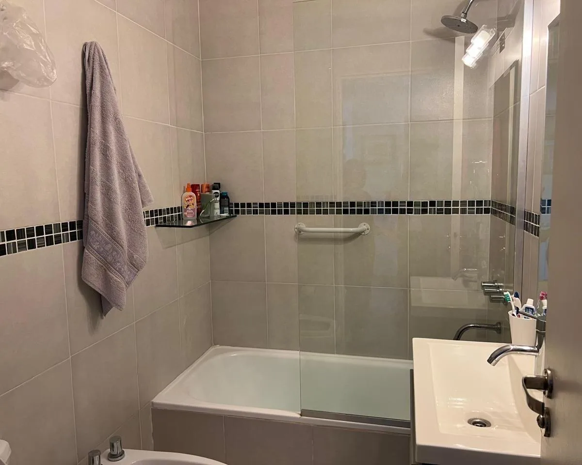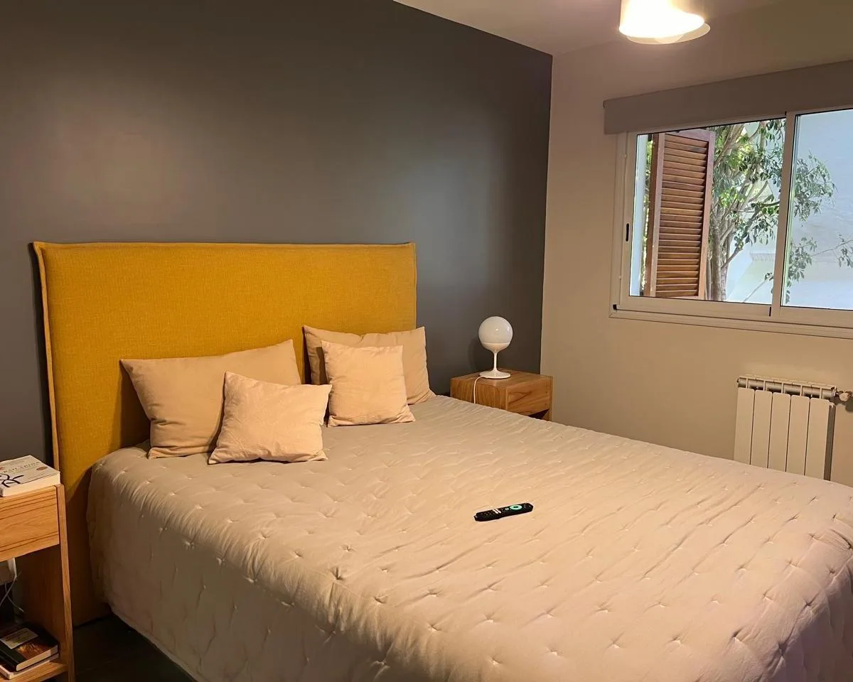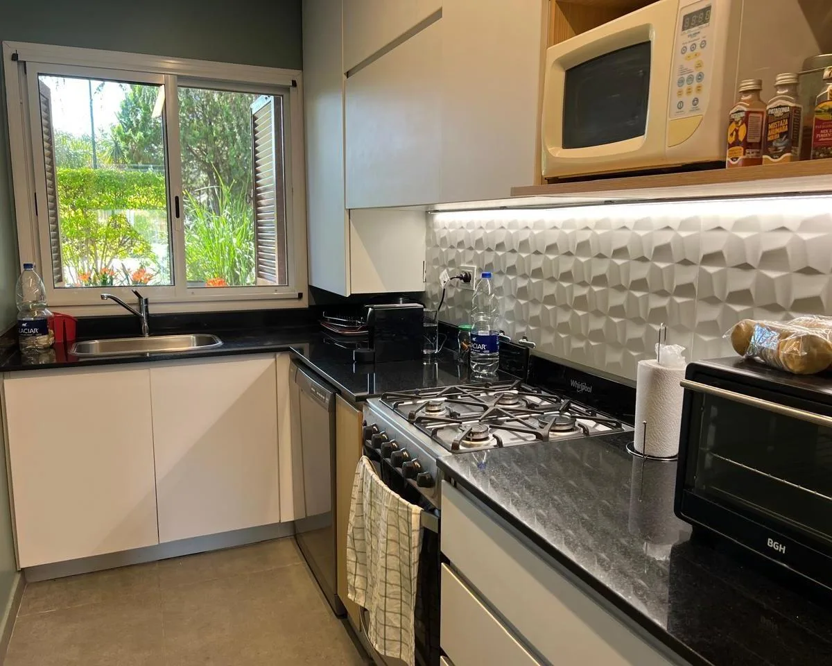 Ground-floor two-room apartment, fully refurbished, with a living and dining area and access to a terrace with garden and a covered BBQ area. Separate kitchen and a bedroom with built-in wardrobes, plus a full bathroom. The listing includes an assigned parking space for 1 car and a courtesy parking spot; building amenities mentioned are a pool, tennis court, gym and 24-hour security, with an amarra available.