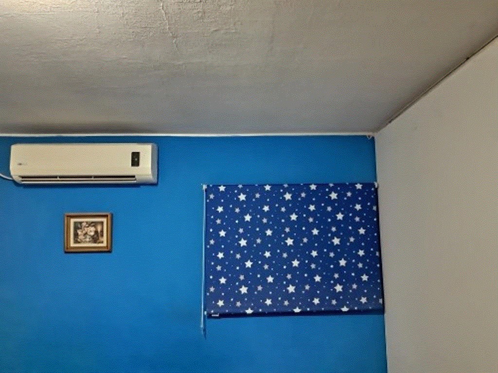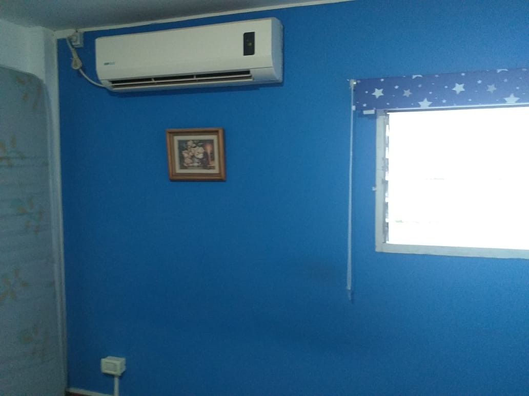 One-bedroom PH house-type unit on the first floor accessed by stairs in Villa Adelina. The unit has no building fees and does not include ABL; water is charged in a 33% share. The layout includes a carpeted living room with a wall heater, a bedroom with a closet, split air conditioning and blackout curtains, a bathroom with fixtures and accessories, and a kitchen-dining area with base and wall cabinets, an Eskabe cooker, and a new Señorial brand hot-water tank. From the kitchen there is access t