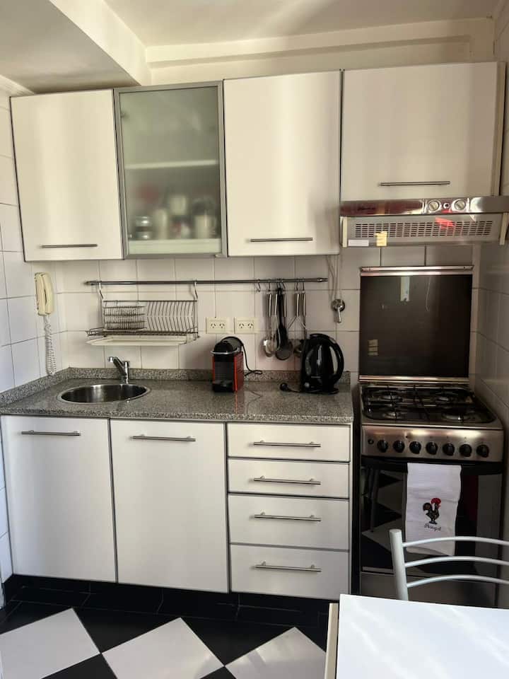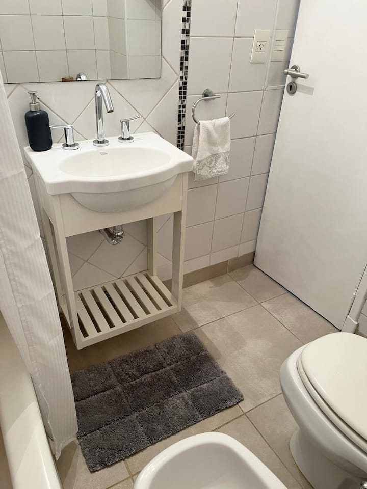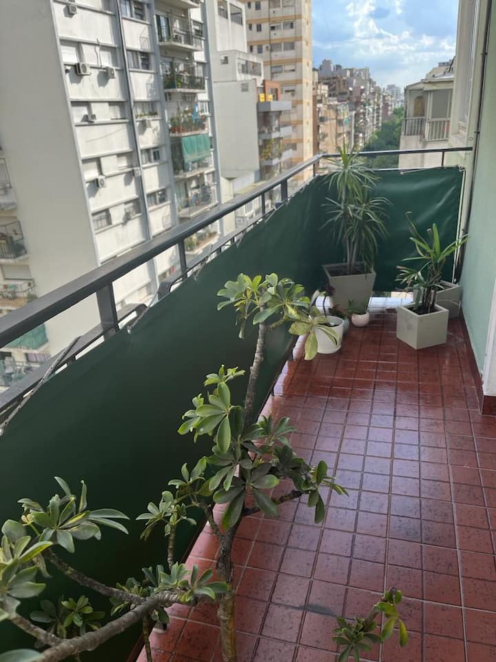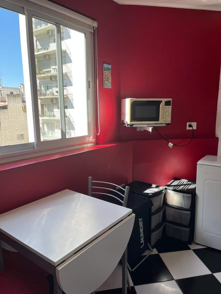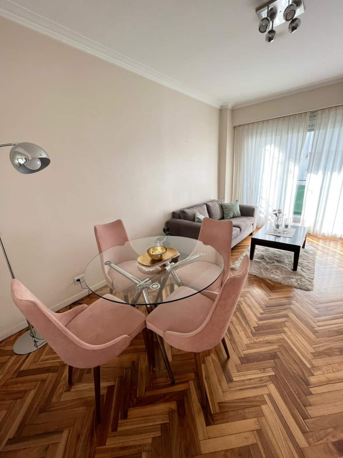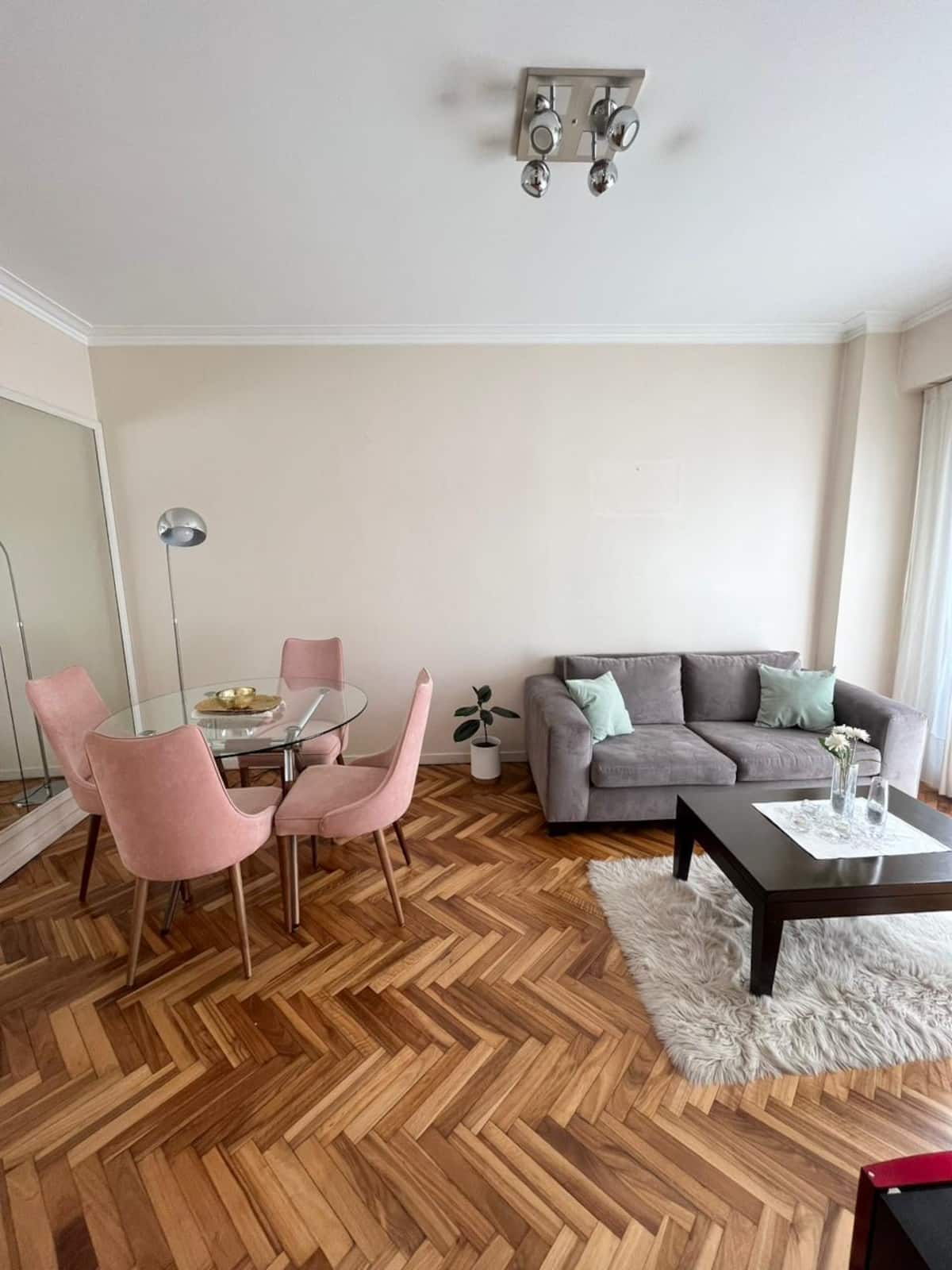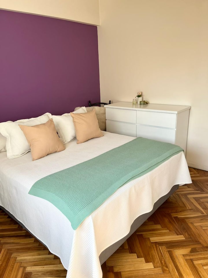 Two-bedroom apartment in Villa Crespo. The unit is described as very bright and includes a double bed in the bedroom, with space to add a sofa bed in the living room for 1–2 additional guests. The listing places the property about three blocks from Malabia station and the Angel Gallardo line B, with multiple bus lines nearby.