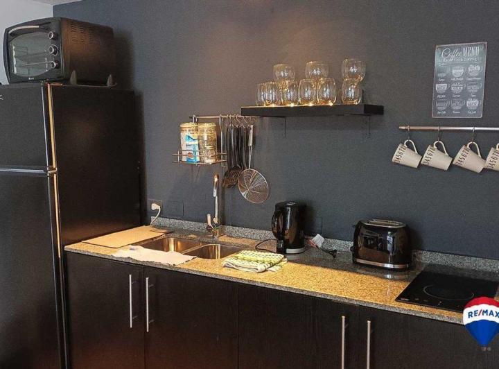 Furnished apartment with 1 bedroom in Villa Crespo. Features include a living-dining area, a full bathroom, and a balcony with an outdoor living set. The unit is equipped with a modern kitchen with breakfast bar, microwave, and electric cooktop, plus air conditioning (hot and cold). Building amenities include a pool and parrilla (BBQ) areas available for shared use, and a laundry on the ground floor. The rent includes wifi, AYSA and gas.