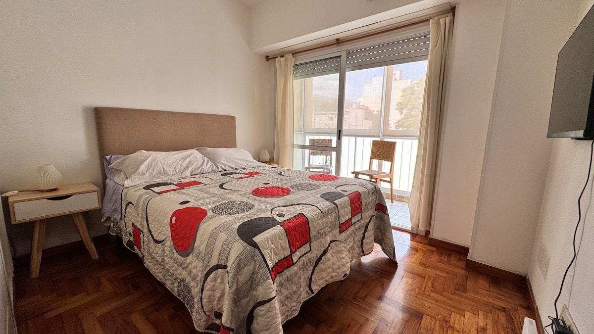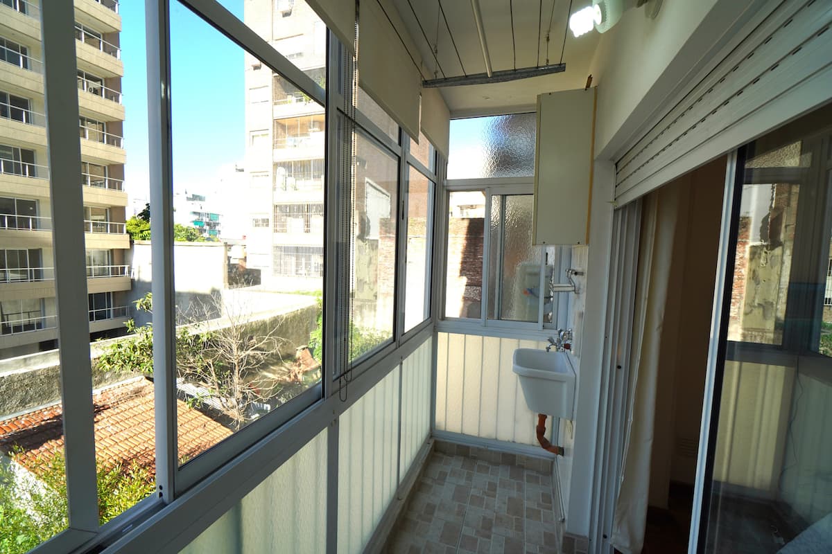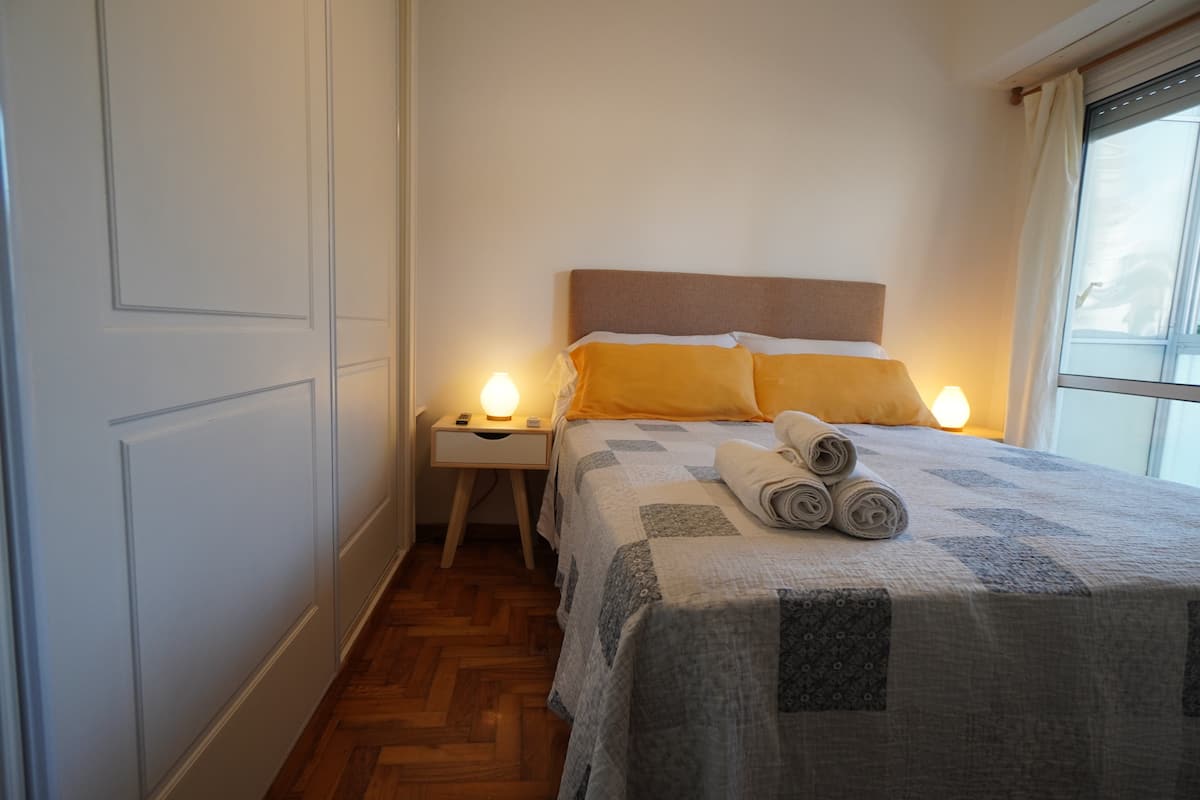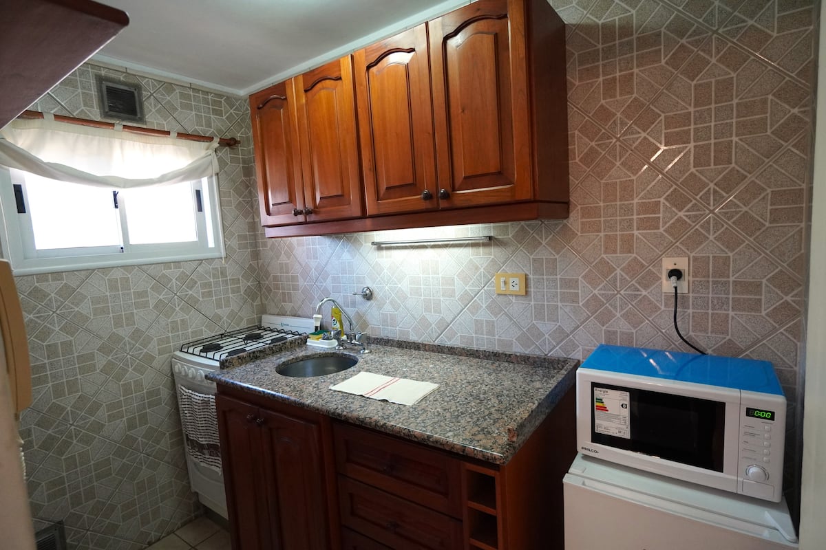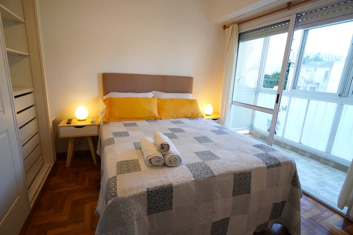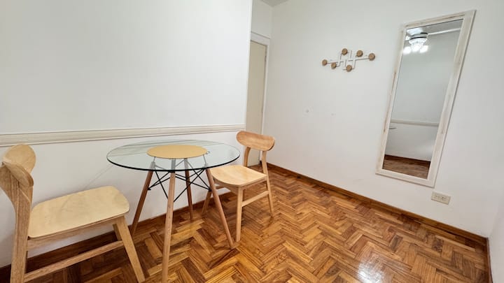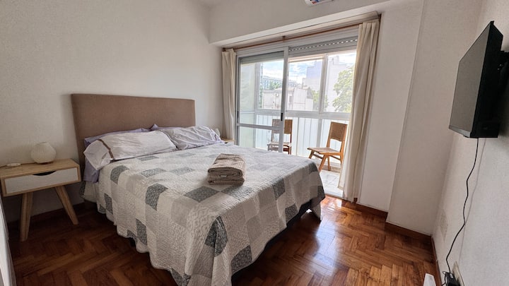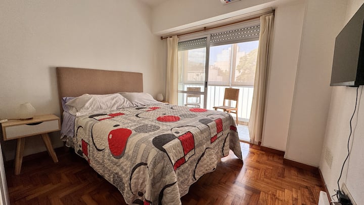 Studio apartment in Villa Crespo, 2 blocks from Movistar Arena. It has an equipped kitchenette, Wi-Fi, TV, air conditioning, and a balcony. The listing mentions a bathroom and private transportation options for events, with special rates during shows.