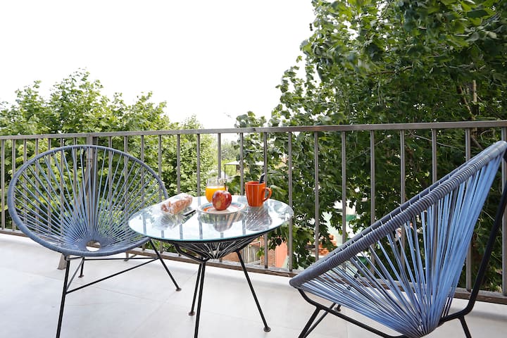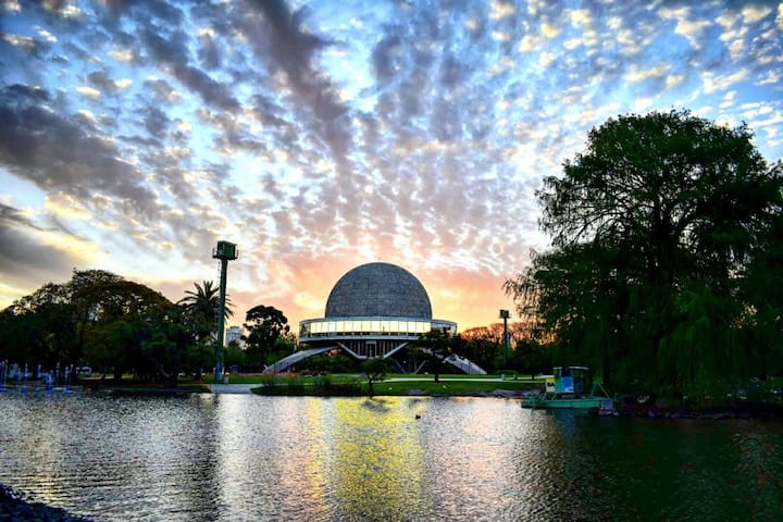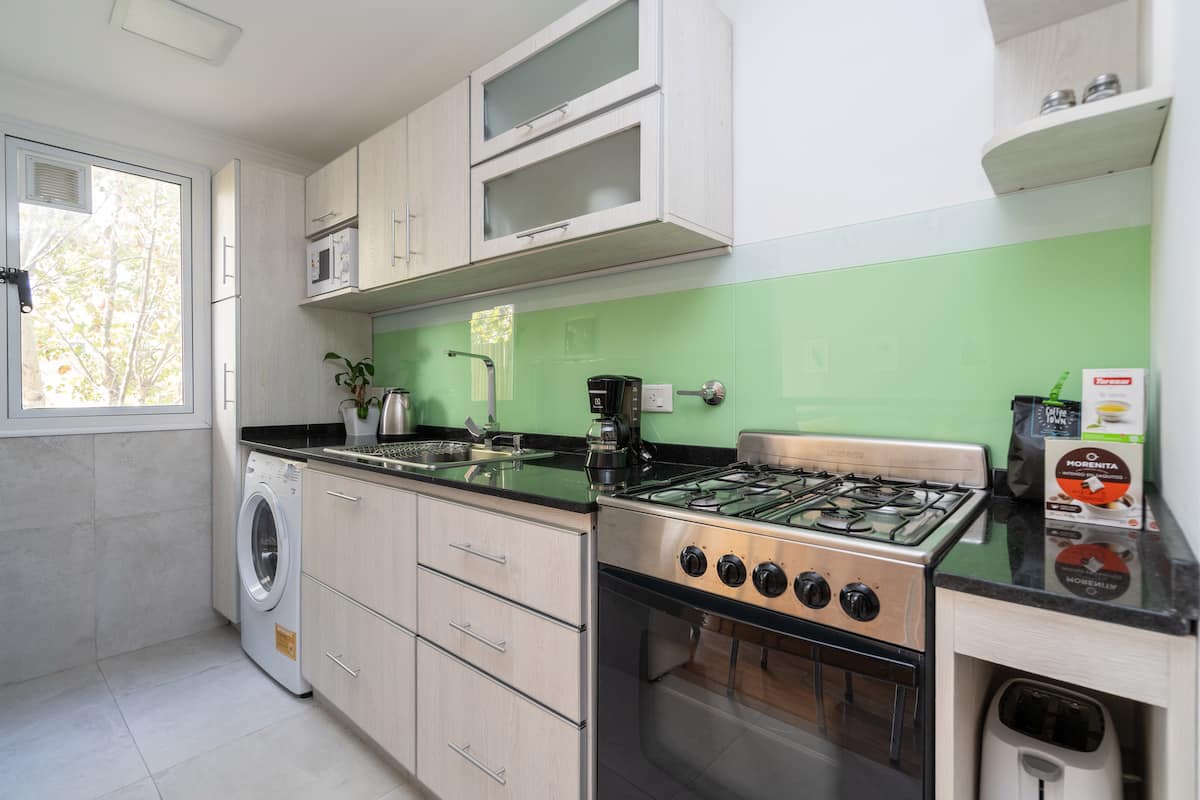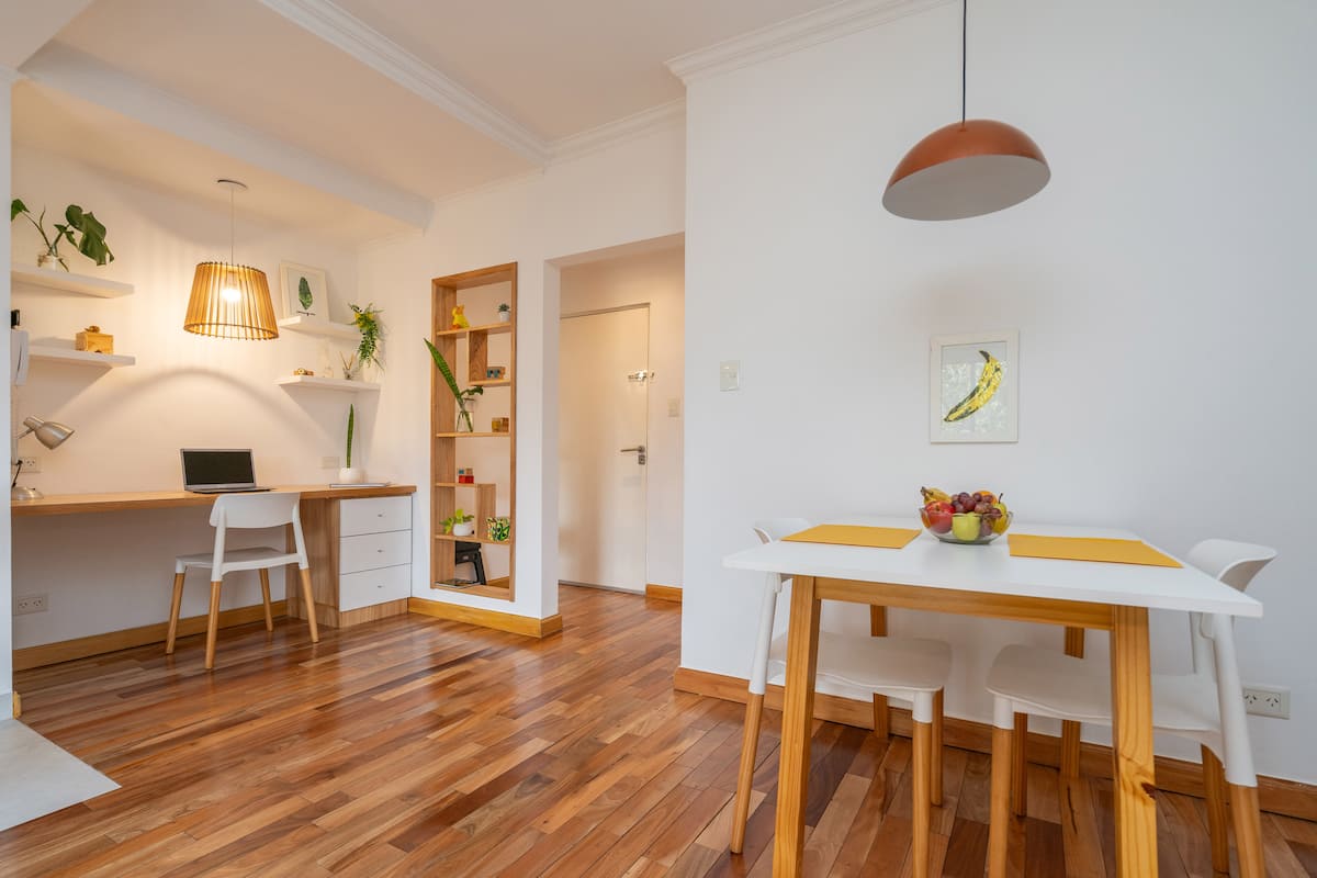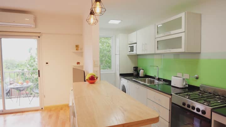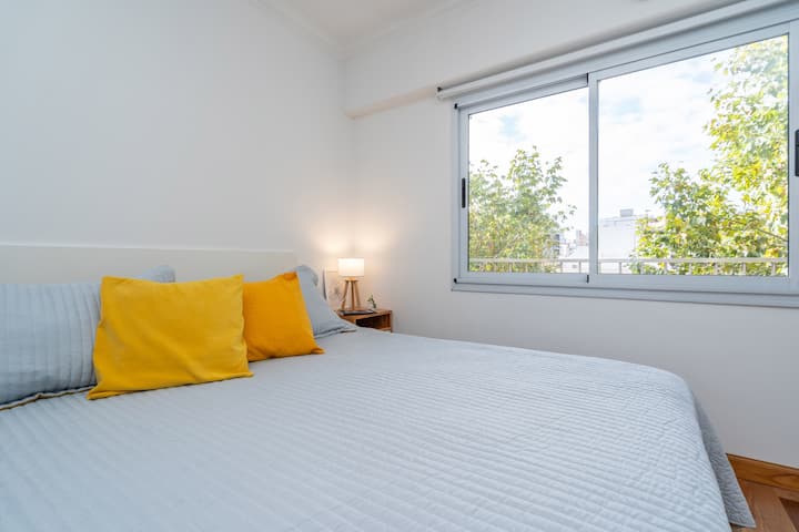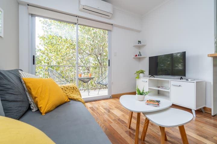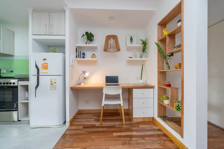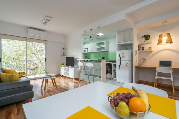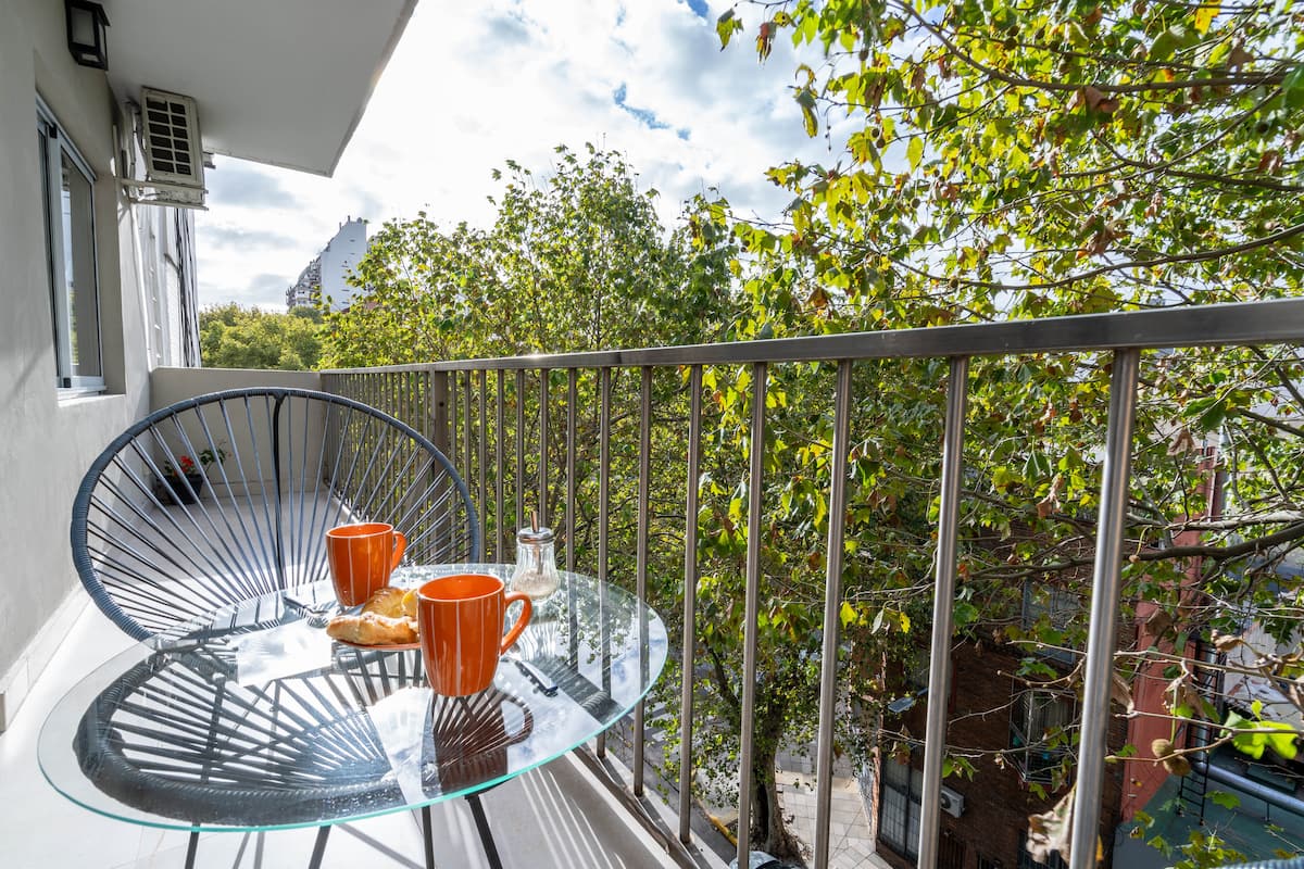 Furnished one-bedroom apartment in Villa Crespo. The unit has a balcony and double-glazed windows, with natural light and an open, private view without buildings in front. It includes a desk for remote work and high-speed Wi-Fi, plus a fully equipped kitchen.