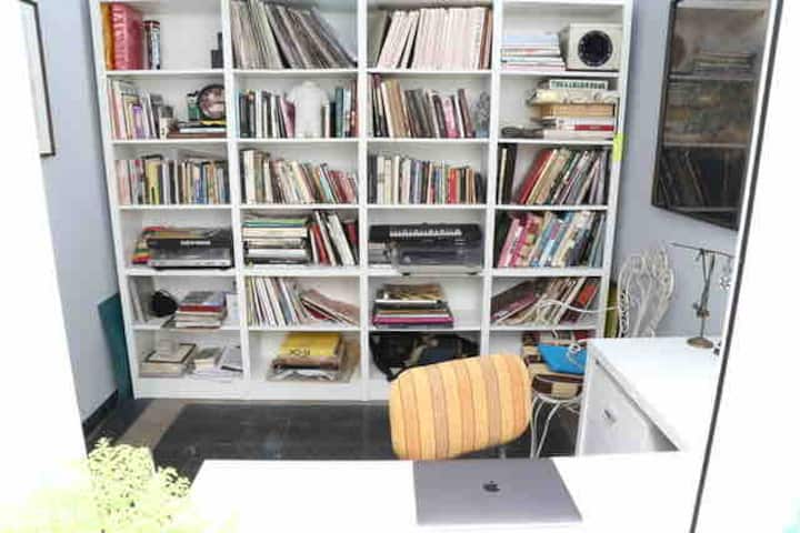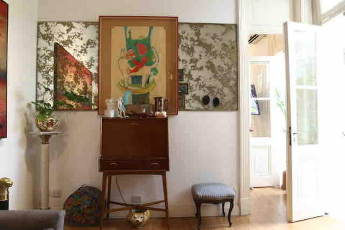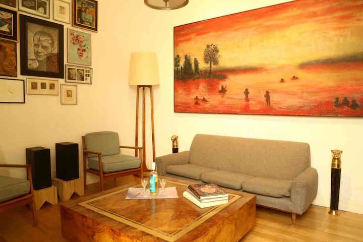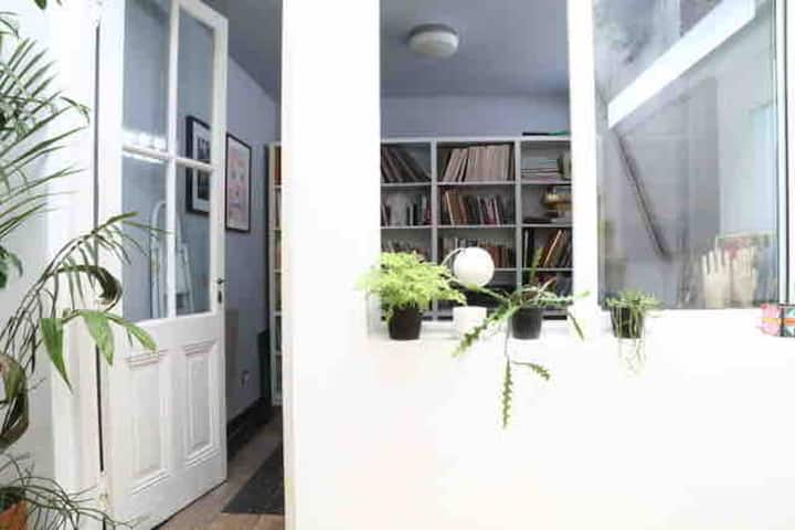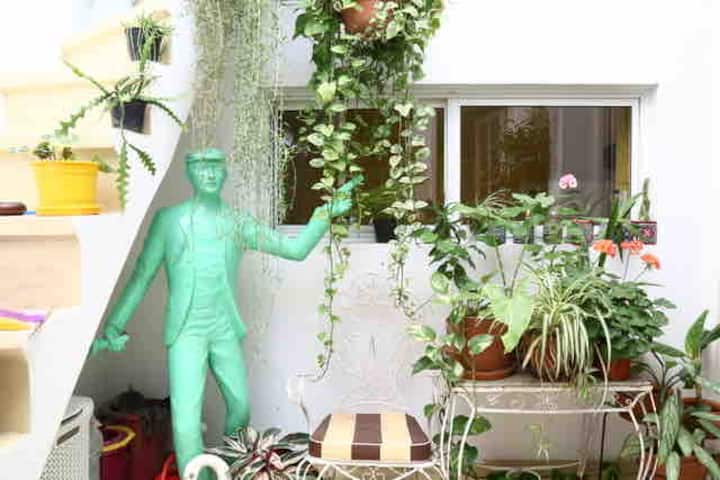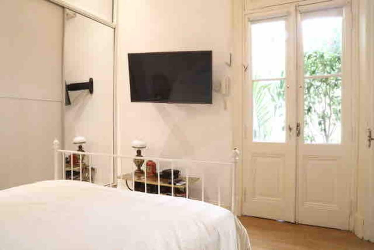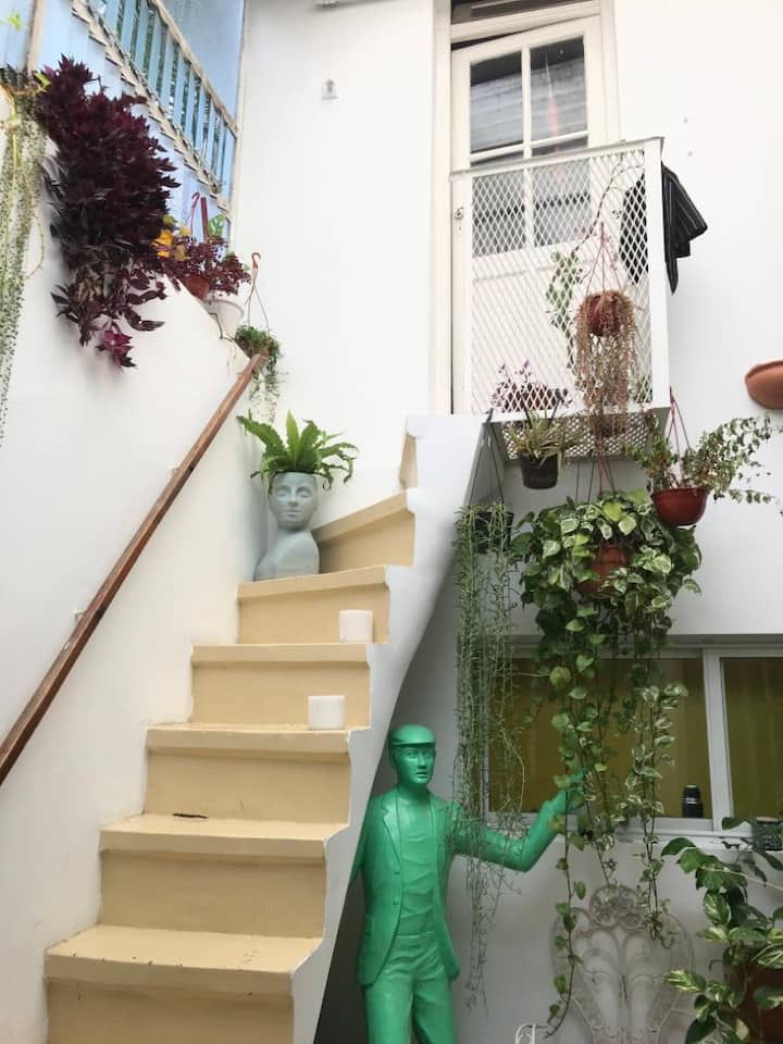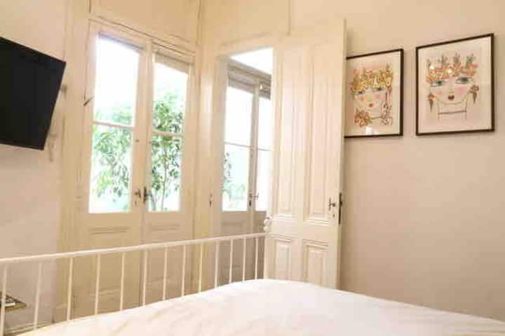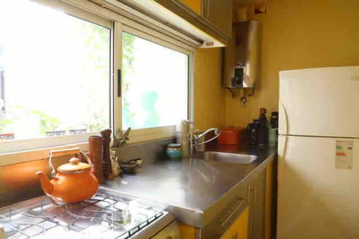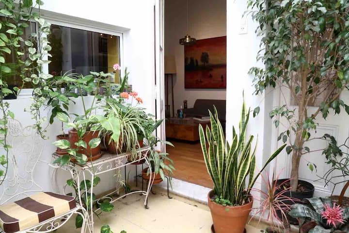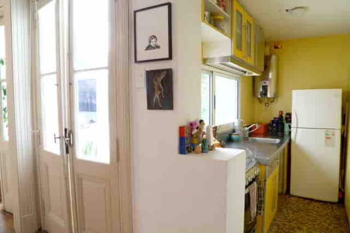 One-bedroom apartment in Villa Crespo. The property is fully equipped and includes a sunny patio with plants and a work area with a window overlooking the patio. It has a wide living room with Art Deco-style furnishings, a kitchen, and a bathroom, plus a king-size bed. Linen, bed sheets and shampoo are provided.