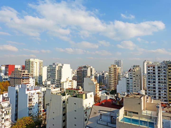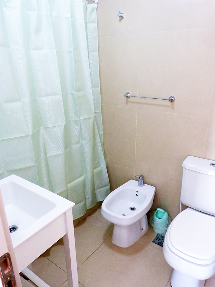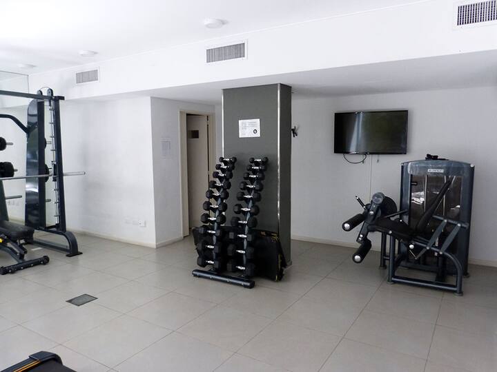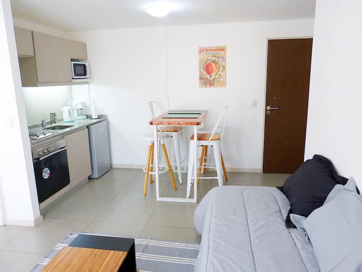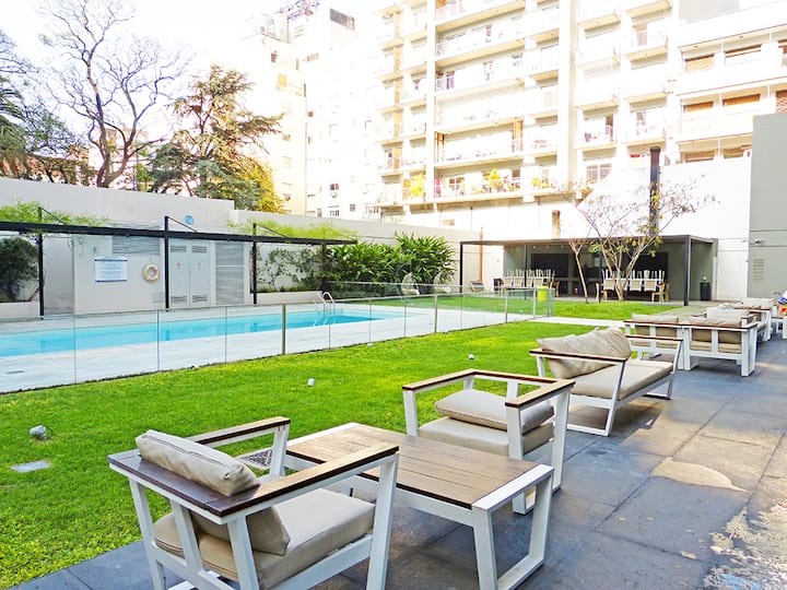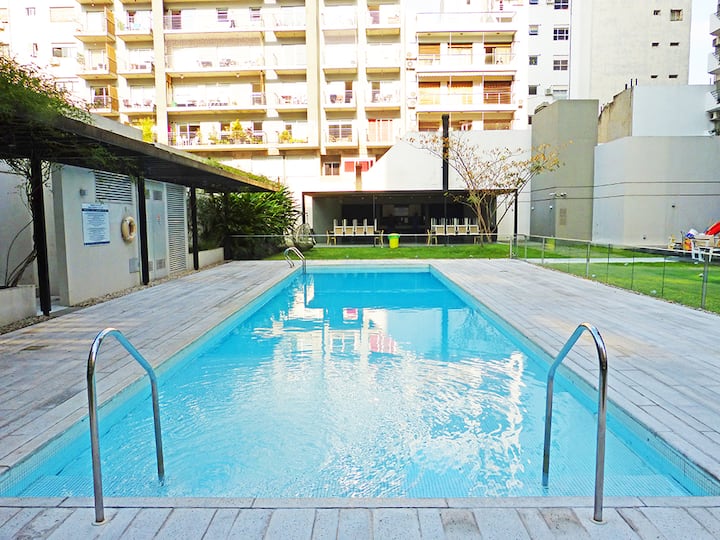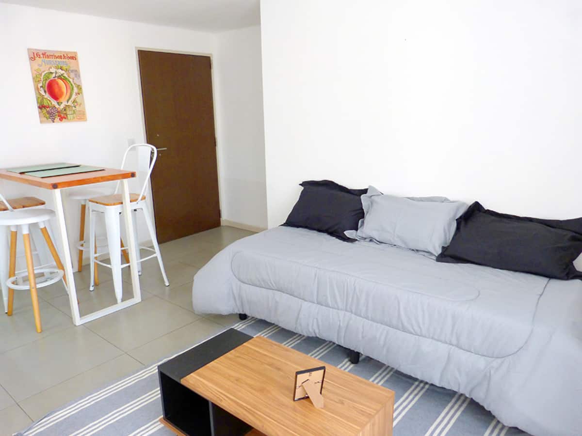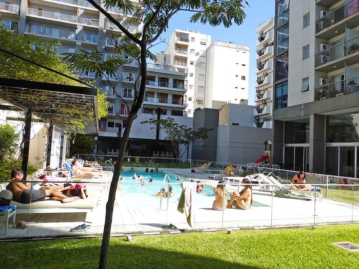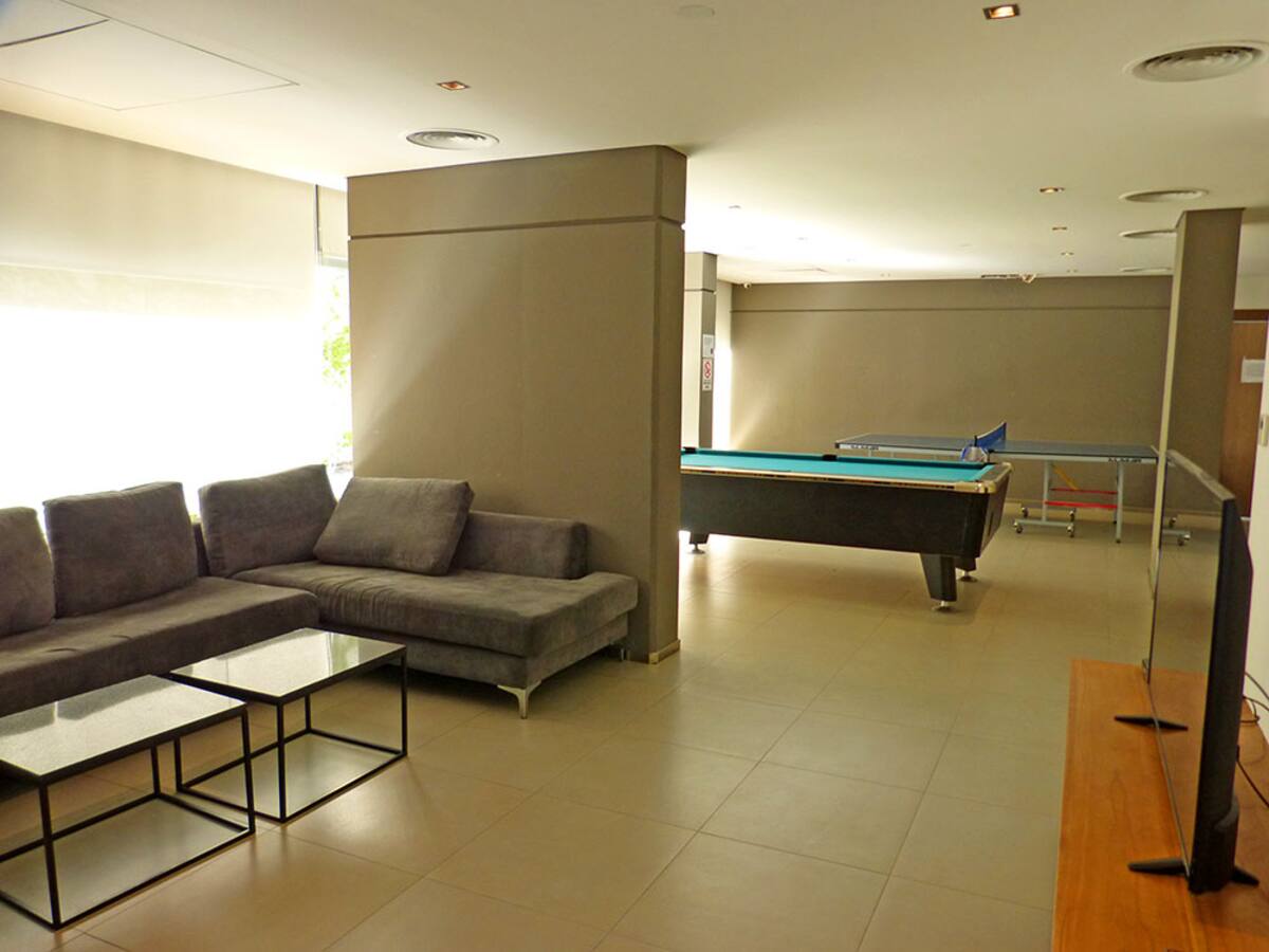 One-bedroom apartment for three people in Villa Crespo. The bedroom has a double bed; the living room includes a single bed. Air conditioning is installed and there are ceramic floors. The kitchen has an oven and burners, and includes a refrigerator, microwave, coffee machine, electric kettle, and cookware; WiFi and cable TV are available. The building has a pool, gym, gardens, a communal room (SUM), a games room with pool tables, ping pong and video games, barbecue grills, and 24-hour security;