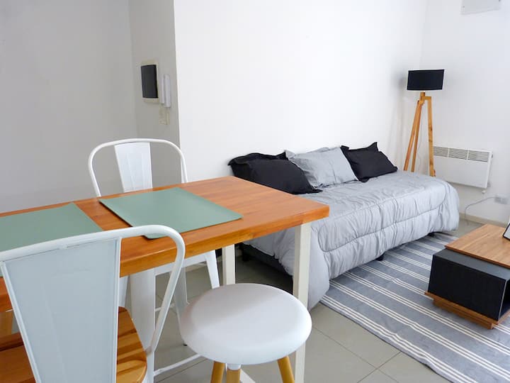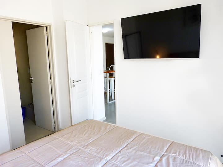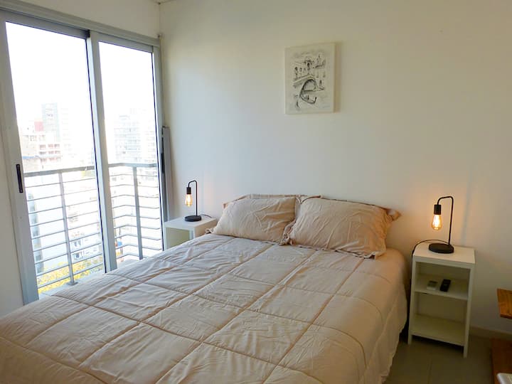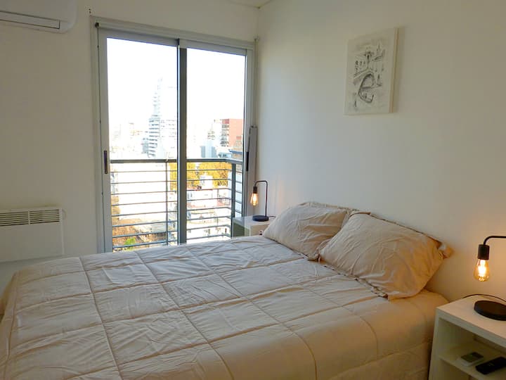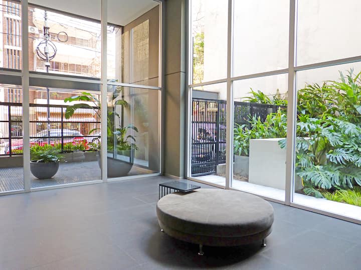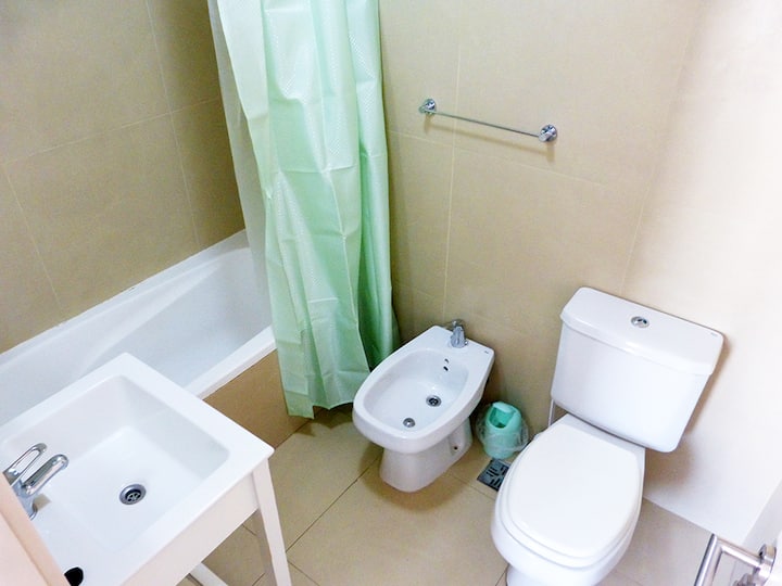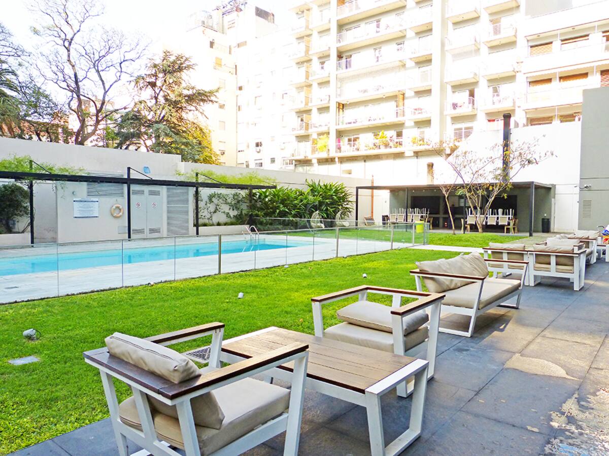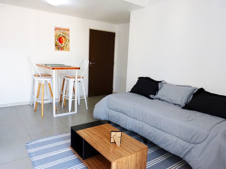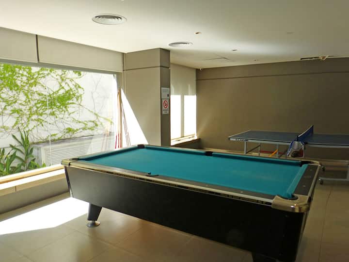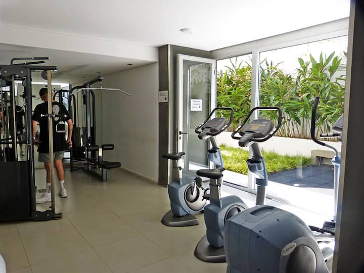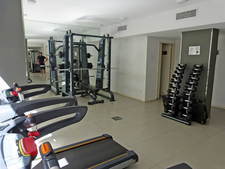 One-bedroom apartment for three people in Villa Crespo. The bedroom has a double bed; the living room includes a single bed. Air conditioning is installed and there are ceramic floors. The kitchen has an oven and burners, and includes a refrigerator, microwave, coffee machine, electric kettle, and cookware; WiFi and cable TV are available. The building has a pool, gym, gardens, a communal room (SUM), a games room with pool tables, ping pong and video games, barbecue grills, and 24-hour security;