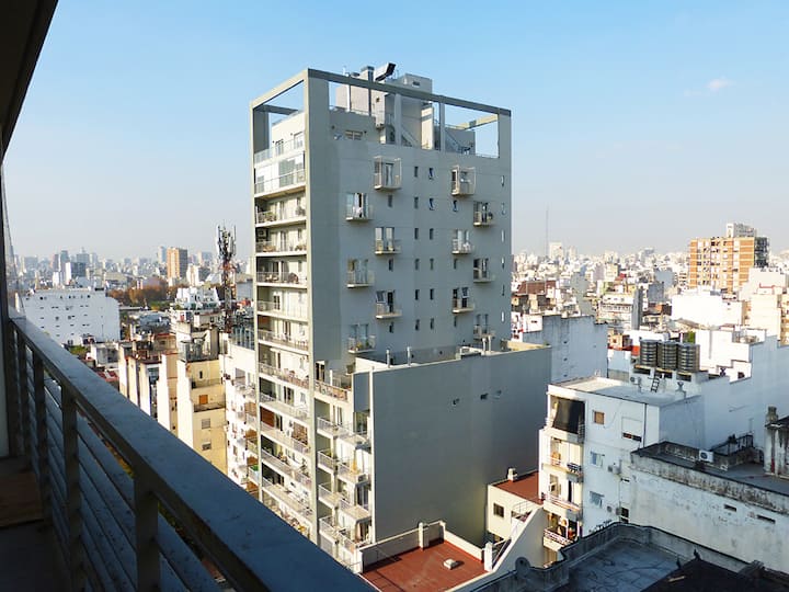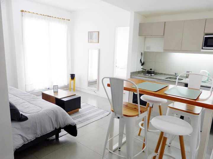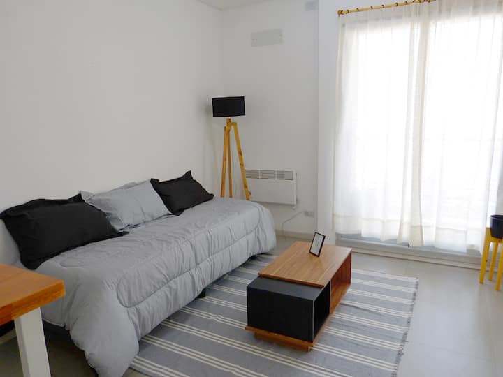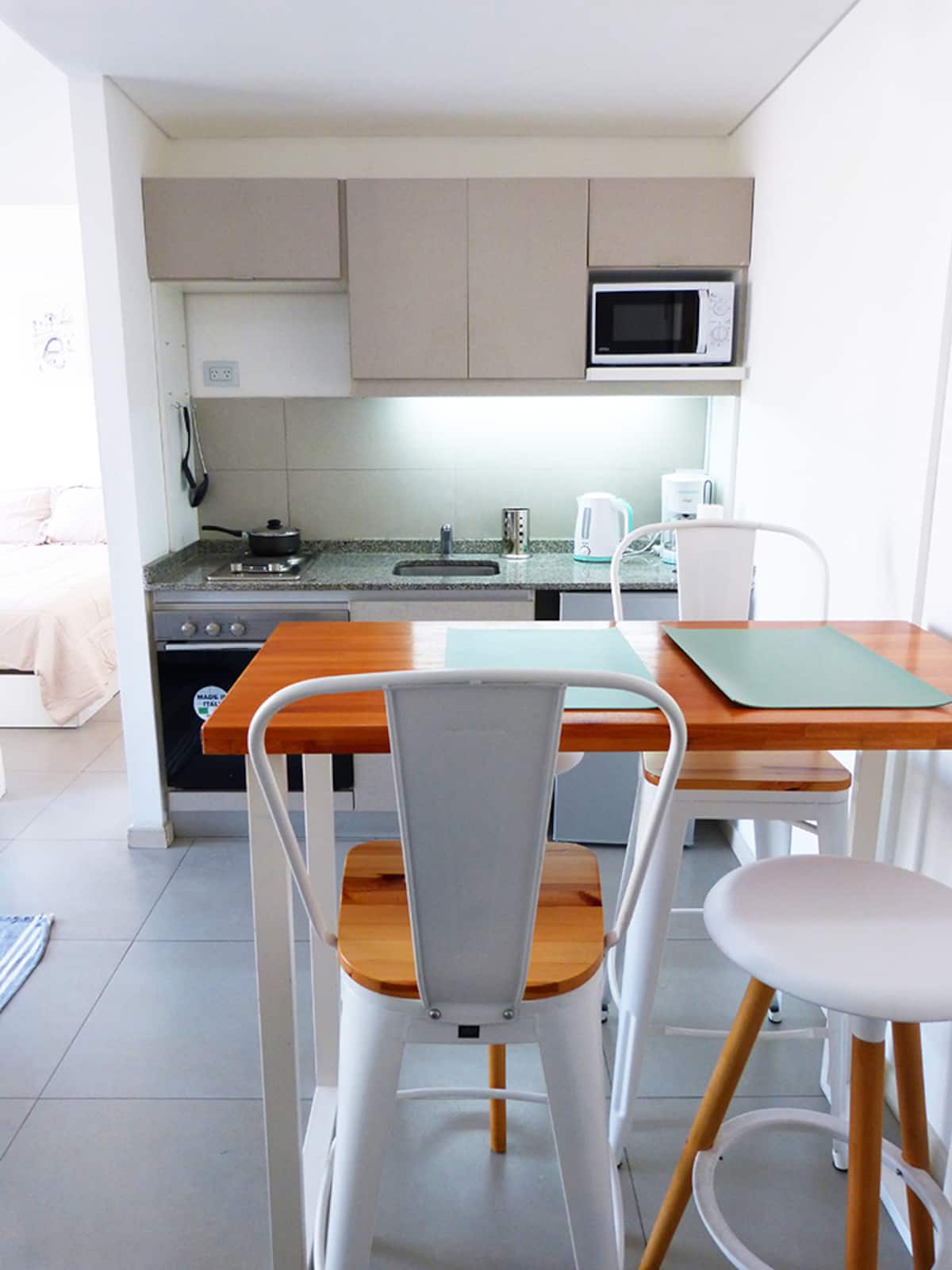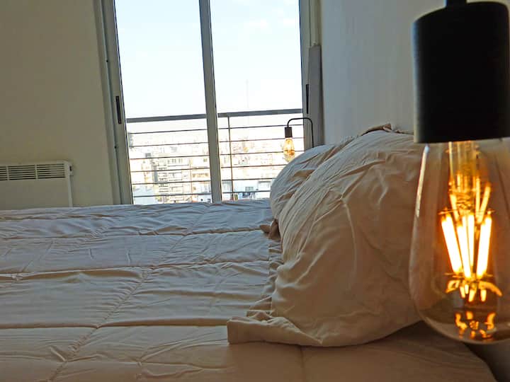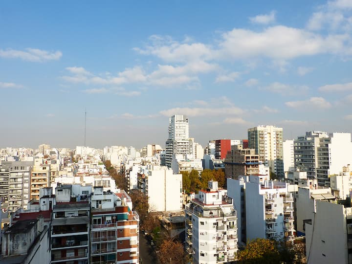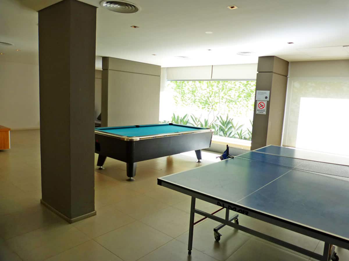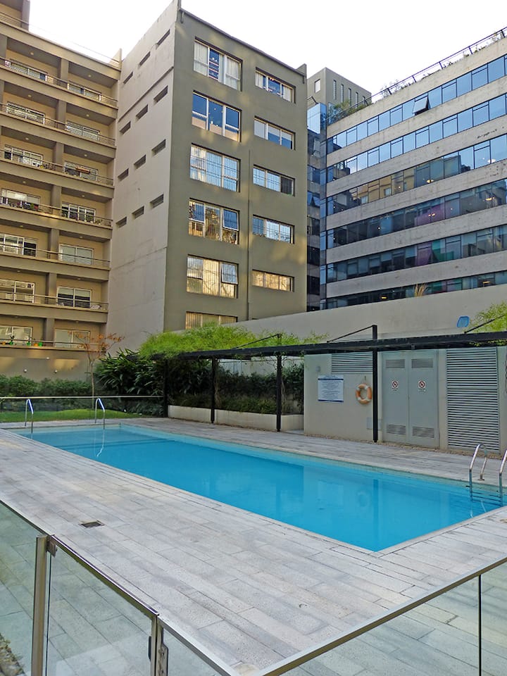 One-bedroom apartment for three people in Villa Crespo. The bedroom has a double bed; the living room includes a single bed. Air conditioning is installed and there are ceramic floors. The kitchen has an oven and burners, and includes a refrigerator, microwave, coffee machine, electric kettle, and cookware; WiFi and cable TV are available. The building has a pool, gym, gardens, a communal room (SUM), a games room with pool tables, ping pong and video games, barbecue grills, and 24-hour security;