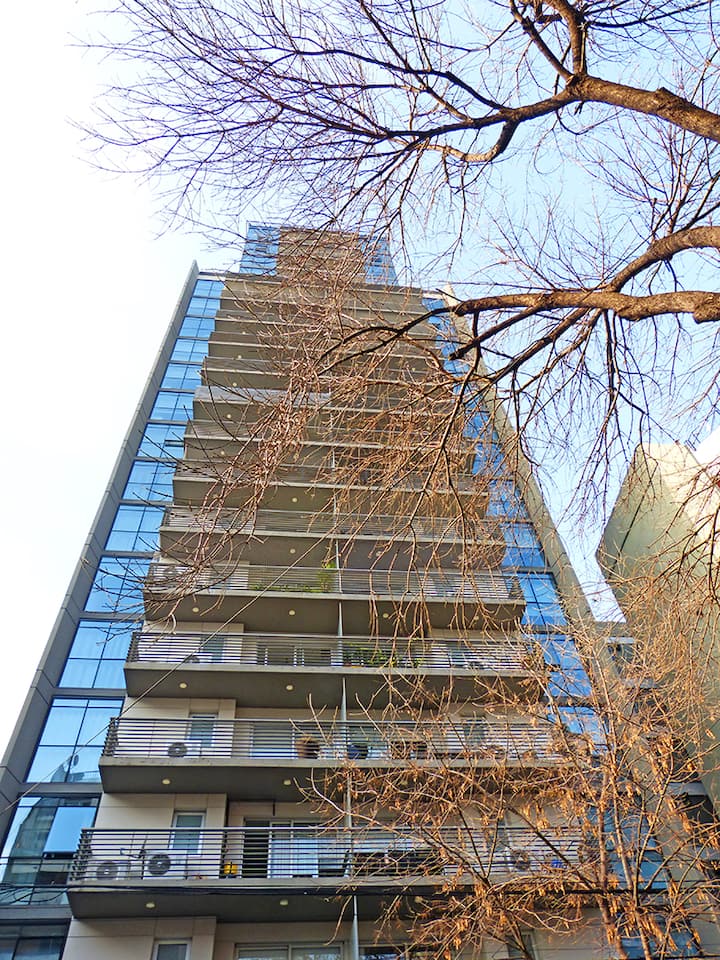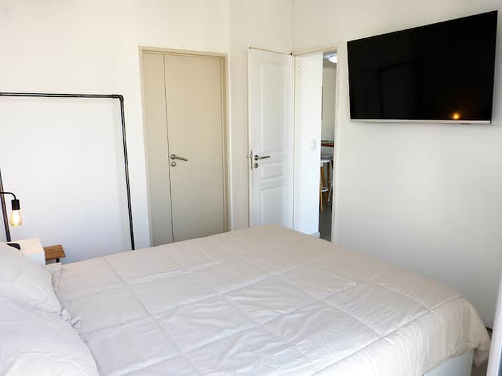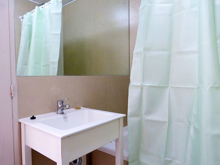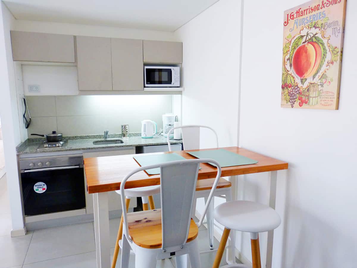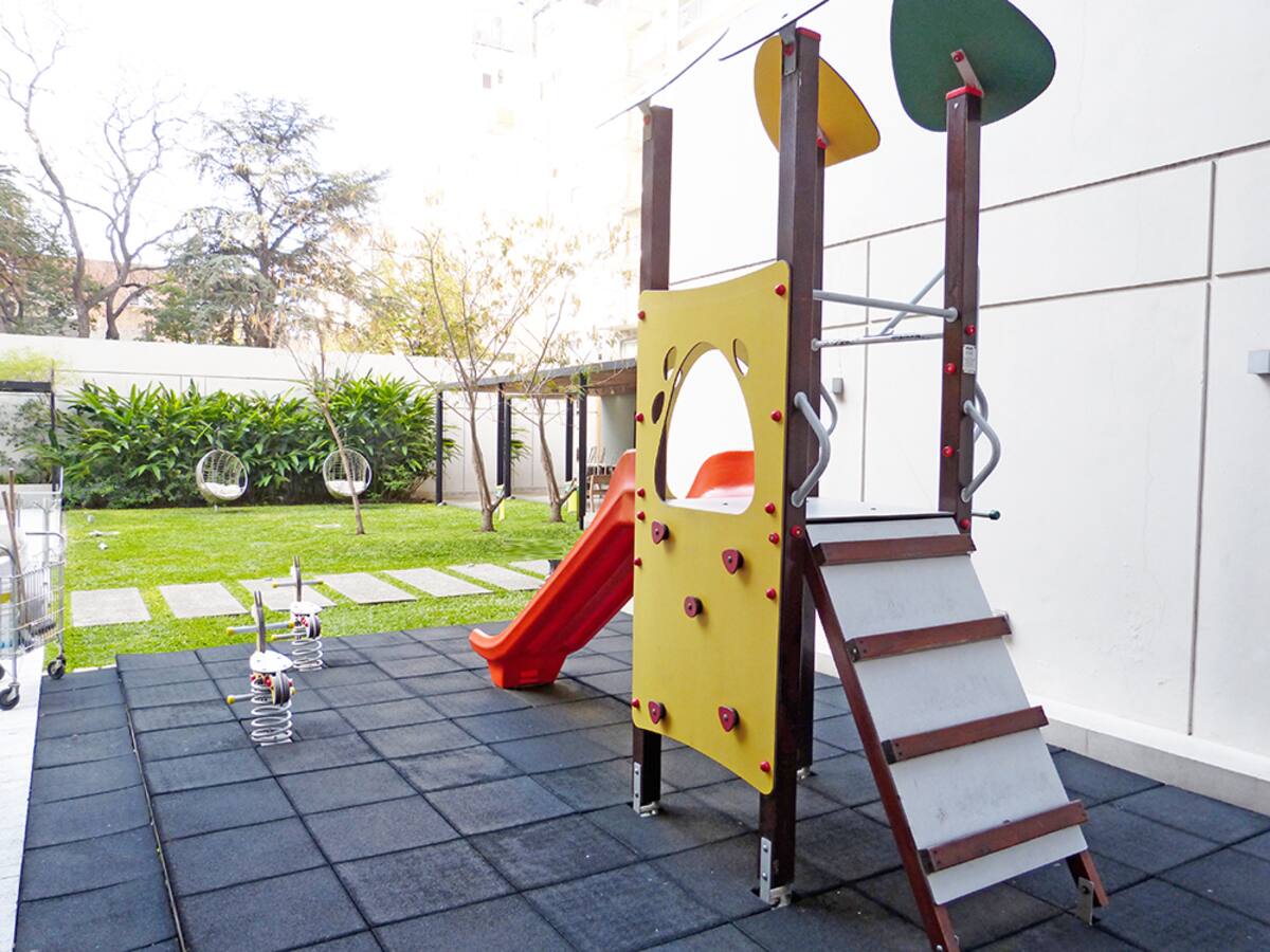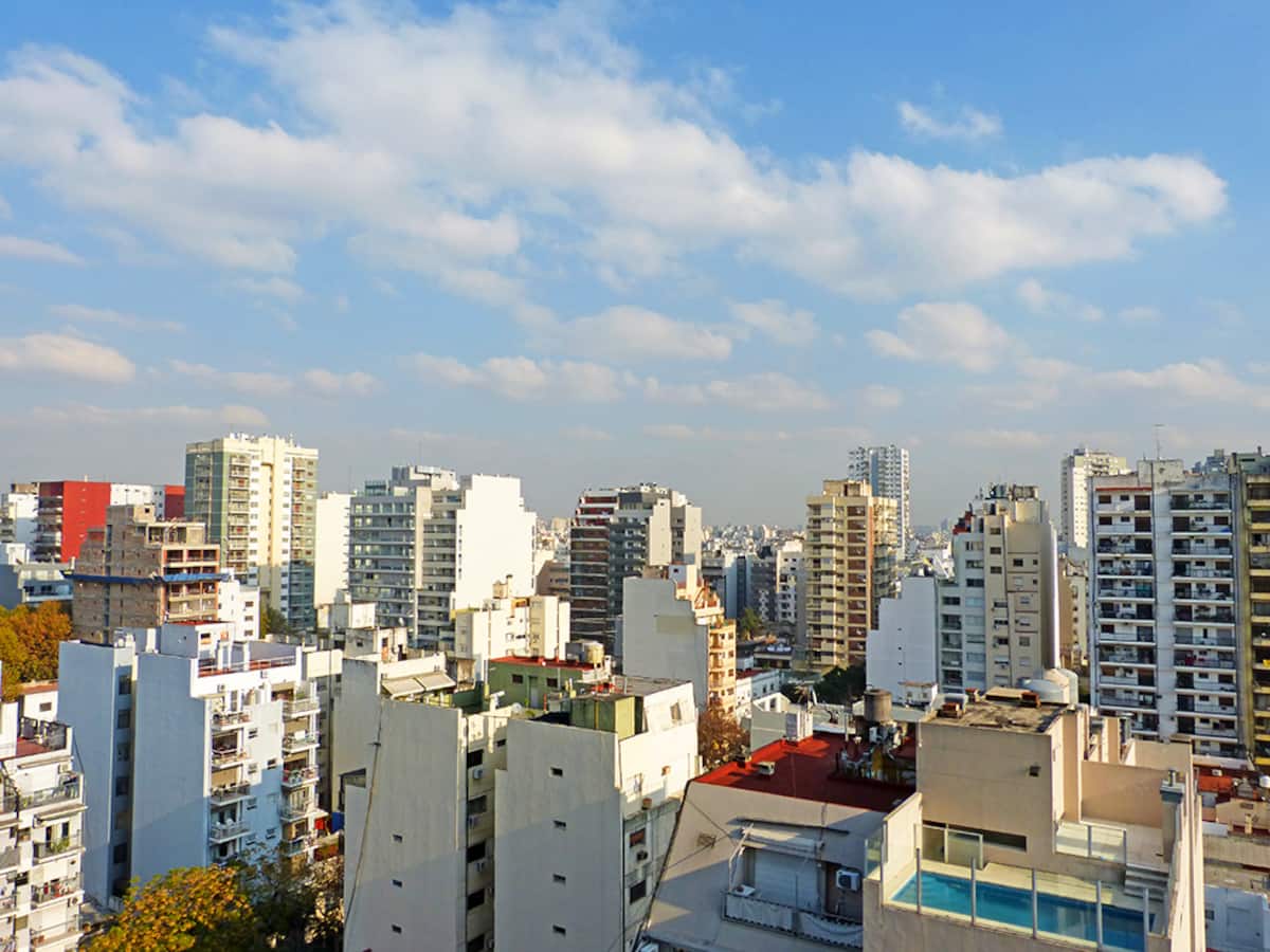 One-bedroom apartment for three people in Villa Crespo. The bedroom has a double bed; the living room includes a single bed. Air conditioning is installed and there are ceramic floors. The kitchen has an oven and burners, and includes a refrigerator, microwave, coffee machine, electric kettle, and cookware; WiFi and cable TV are available. The building has a pool, gym, gardens, a communal room (SUM), a games room with pool tables, ping pong and video games, barbecue grills, and 24-hour security;