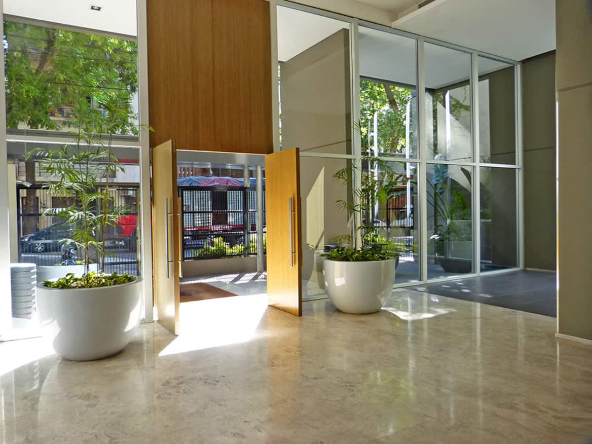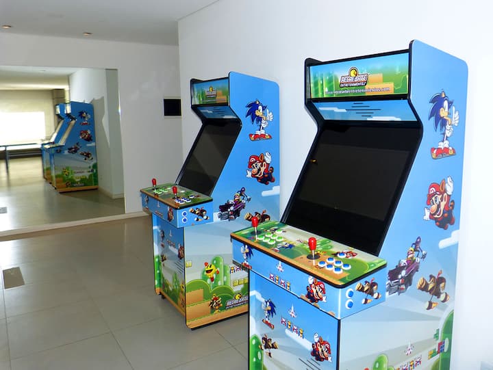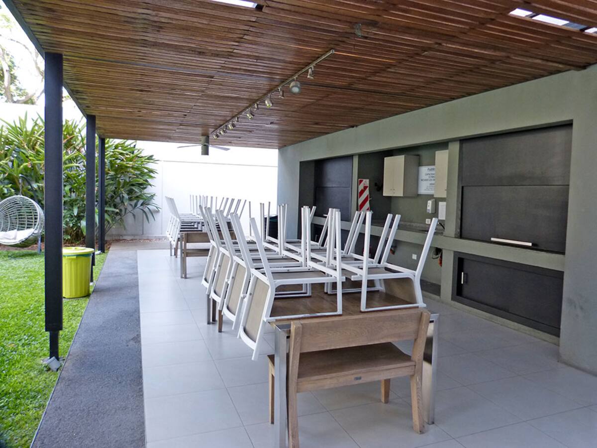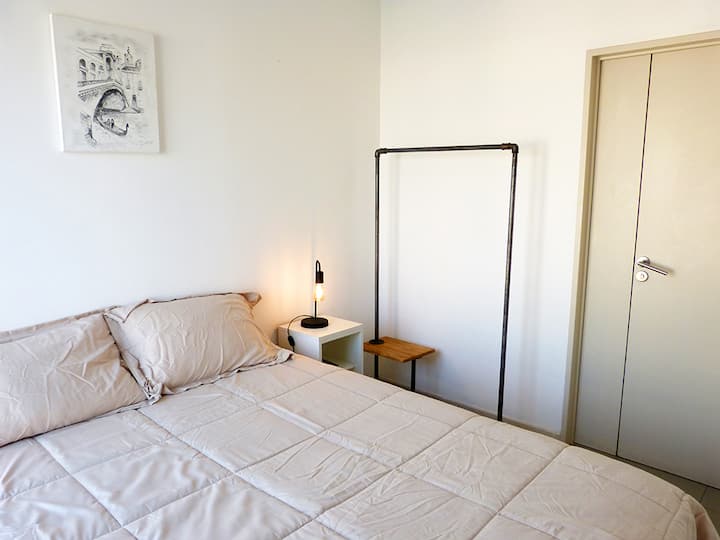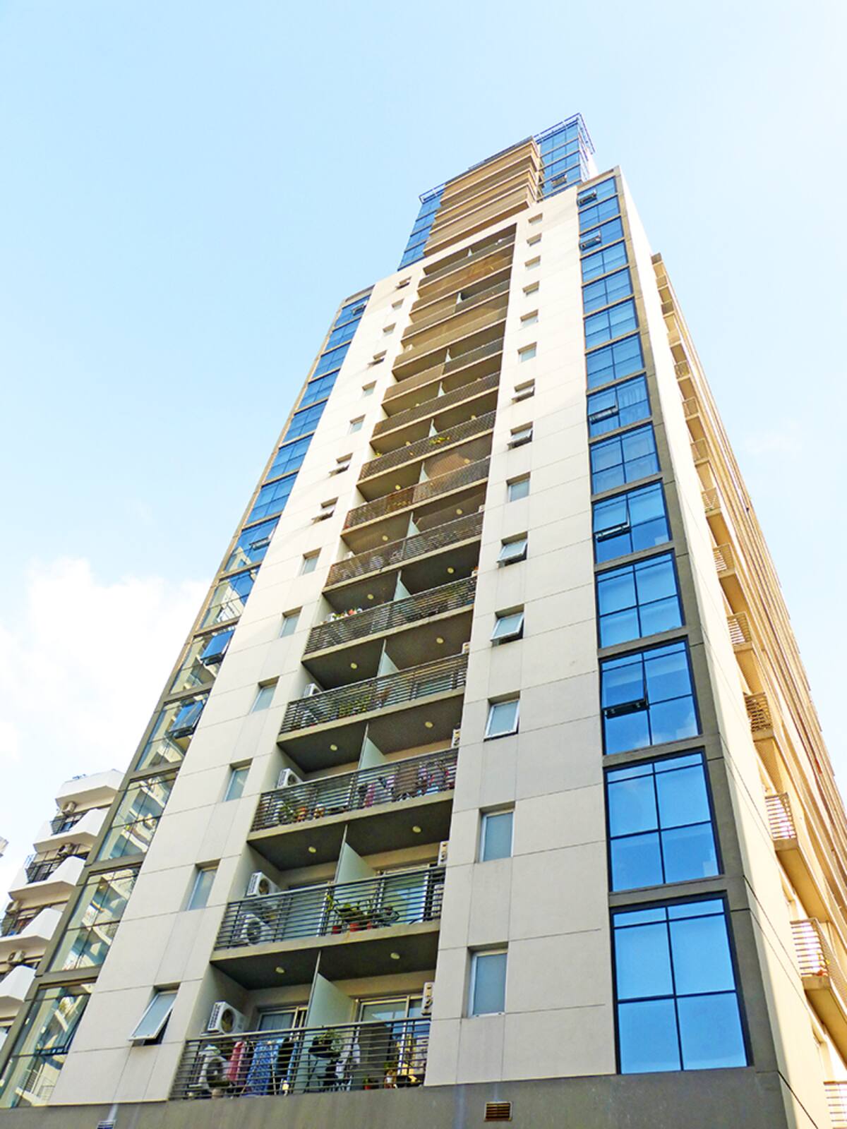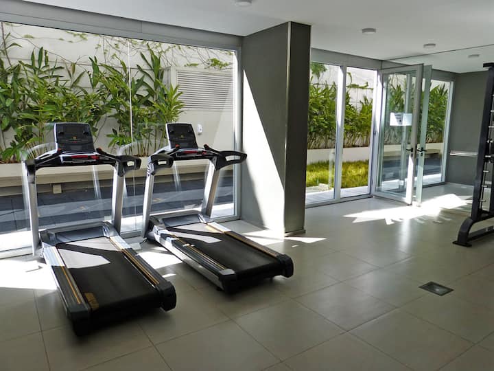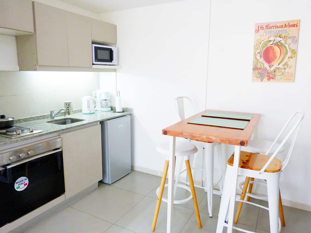 One-bedroom apartment for three people in Villa Crespo. The bedroom has a double bed; the living room includes a single bed. Air conditioning is installed and there are ceramic floors. The kitchen has an oven and burners, and includes a refrigerator, microwave, coffee machine, electric kettle, and cookware; WiFi and cable TV are available. The building has a pool, gym, gardens, a communal room (SUM), a games room with pool tables, ping pong and video games, barbecue grills, and 24-hour security;