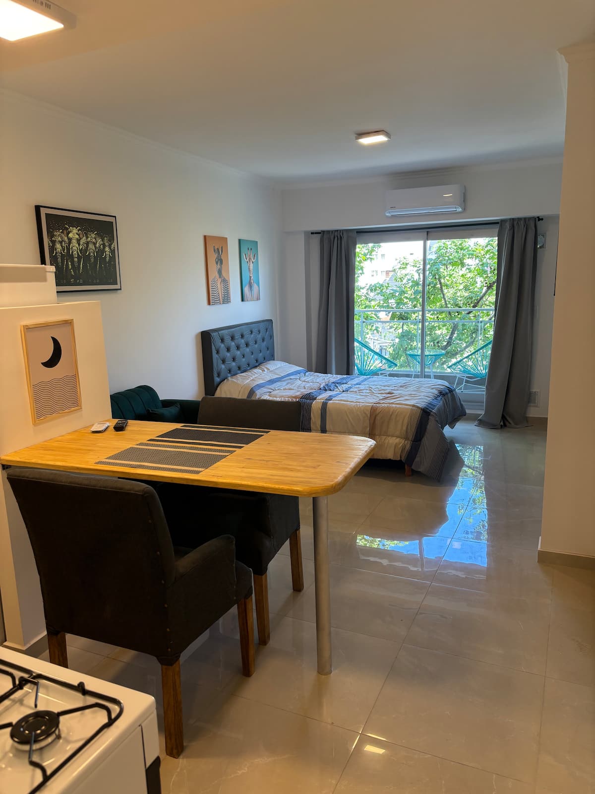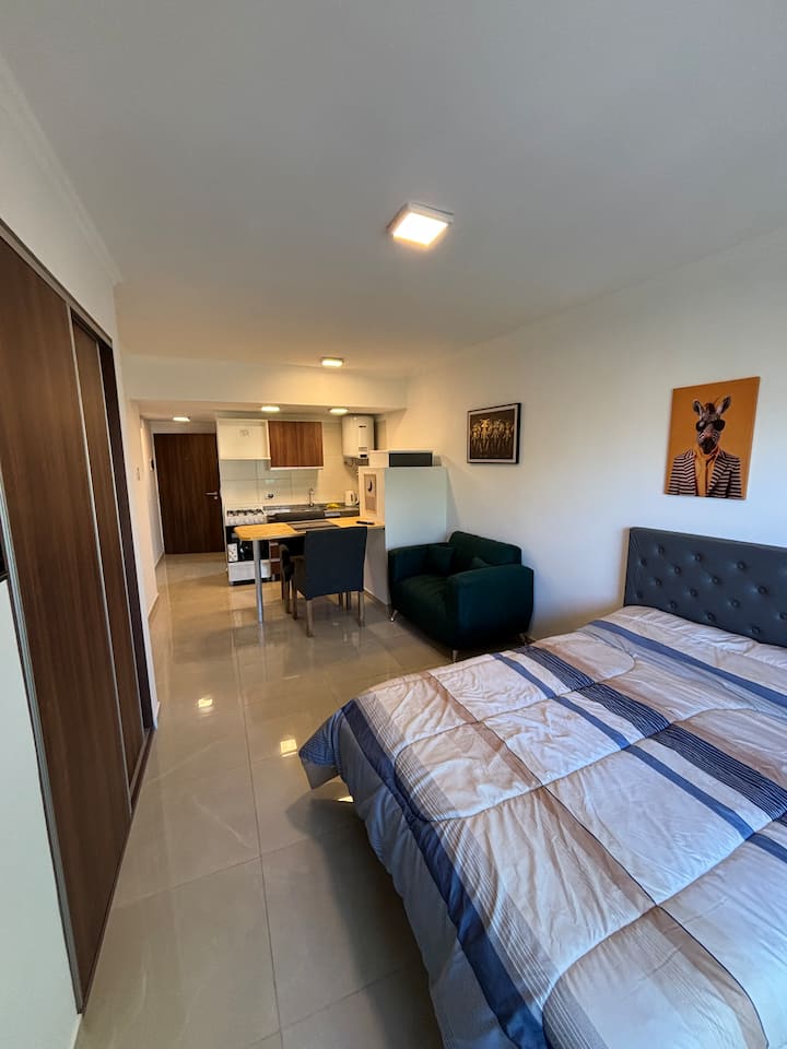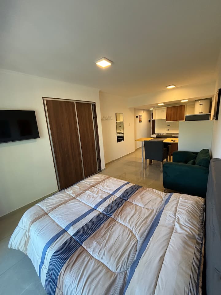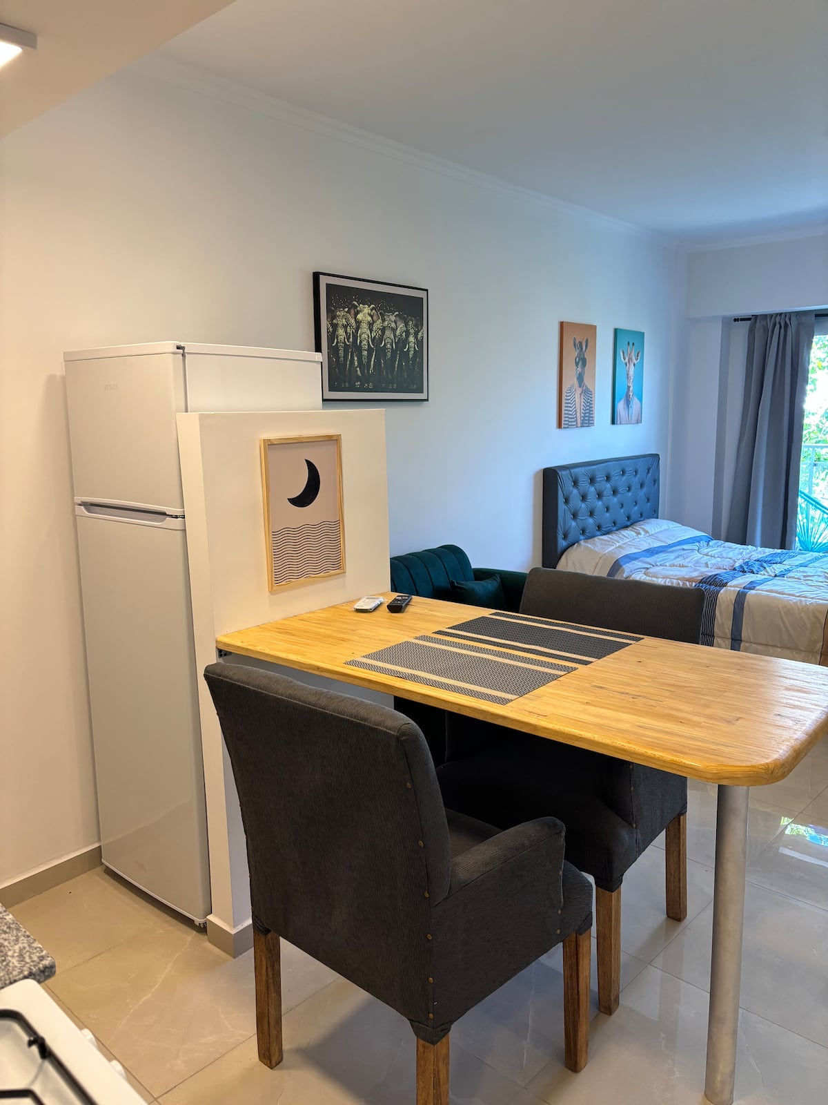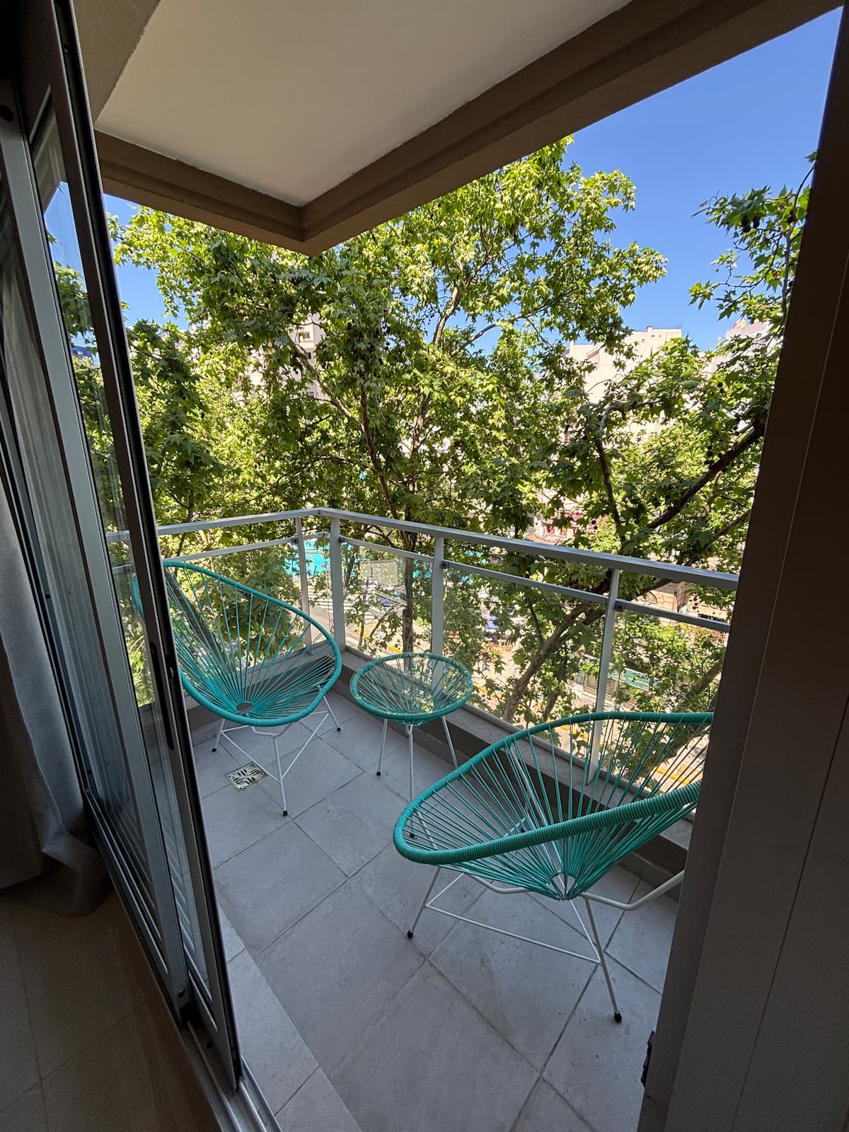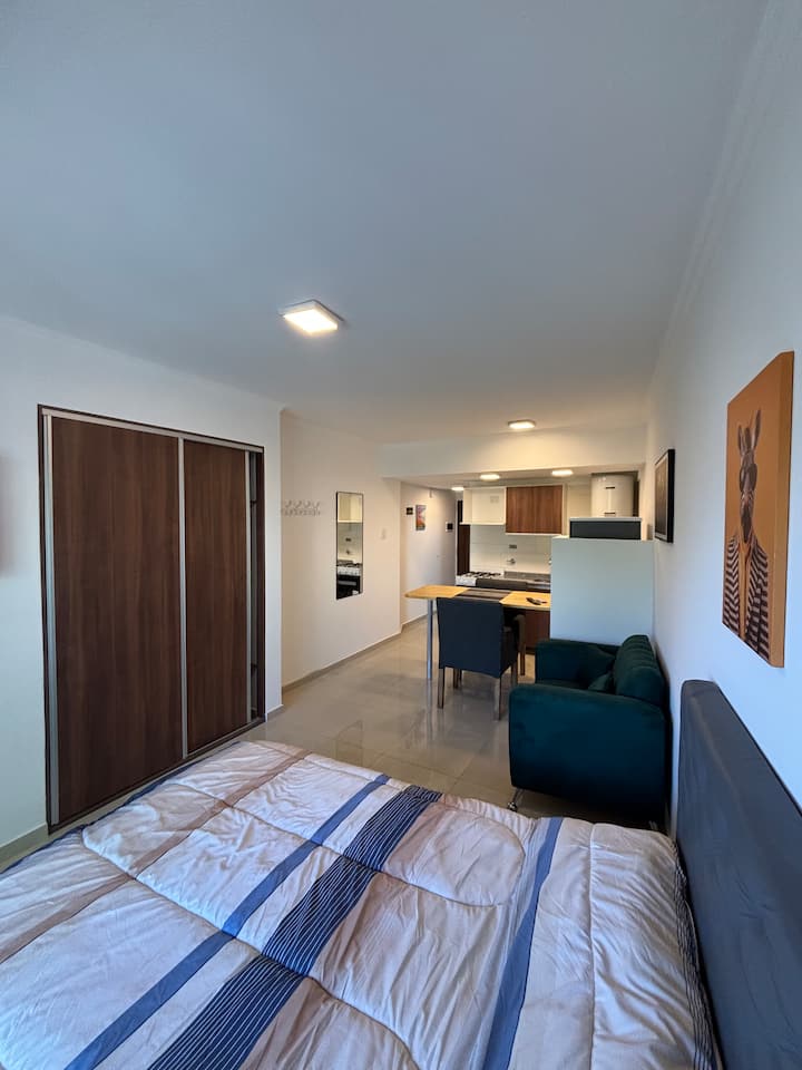 Studio apartment on the 5th floor, street-facing, with a 35 m² total area and a large balcony. Fully equipped modern kitchen with new appliances, one full bathroom, and a double bed, armchair and dining table. The building has a communal SUM, swimming pool, gym and grills. The price includes building fees and services.