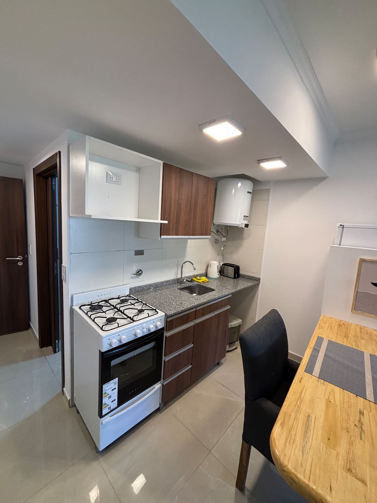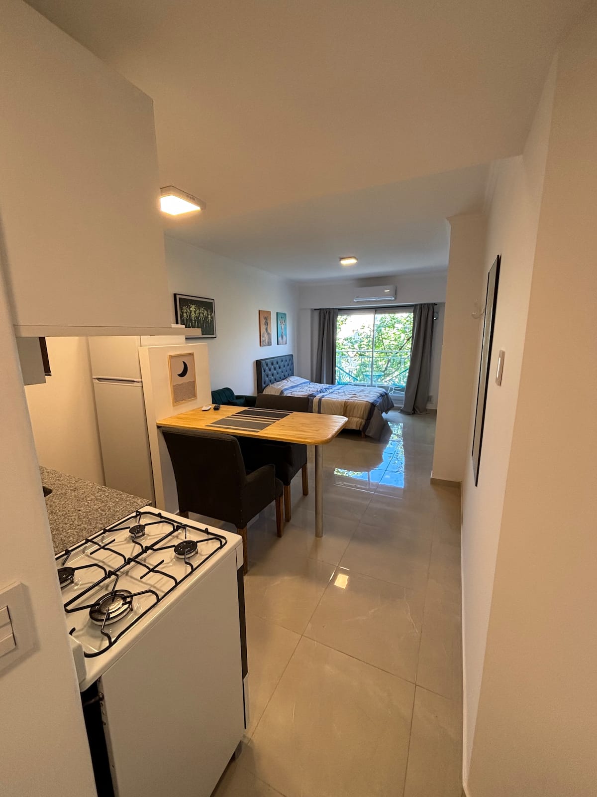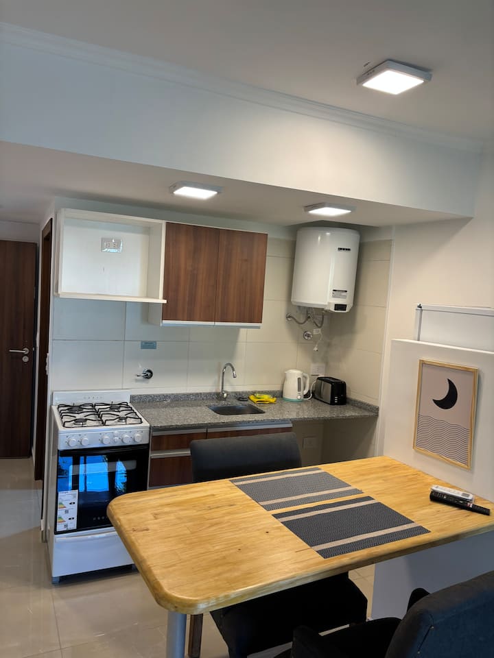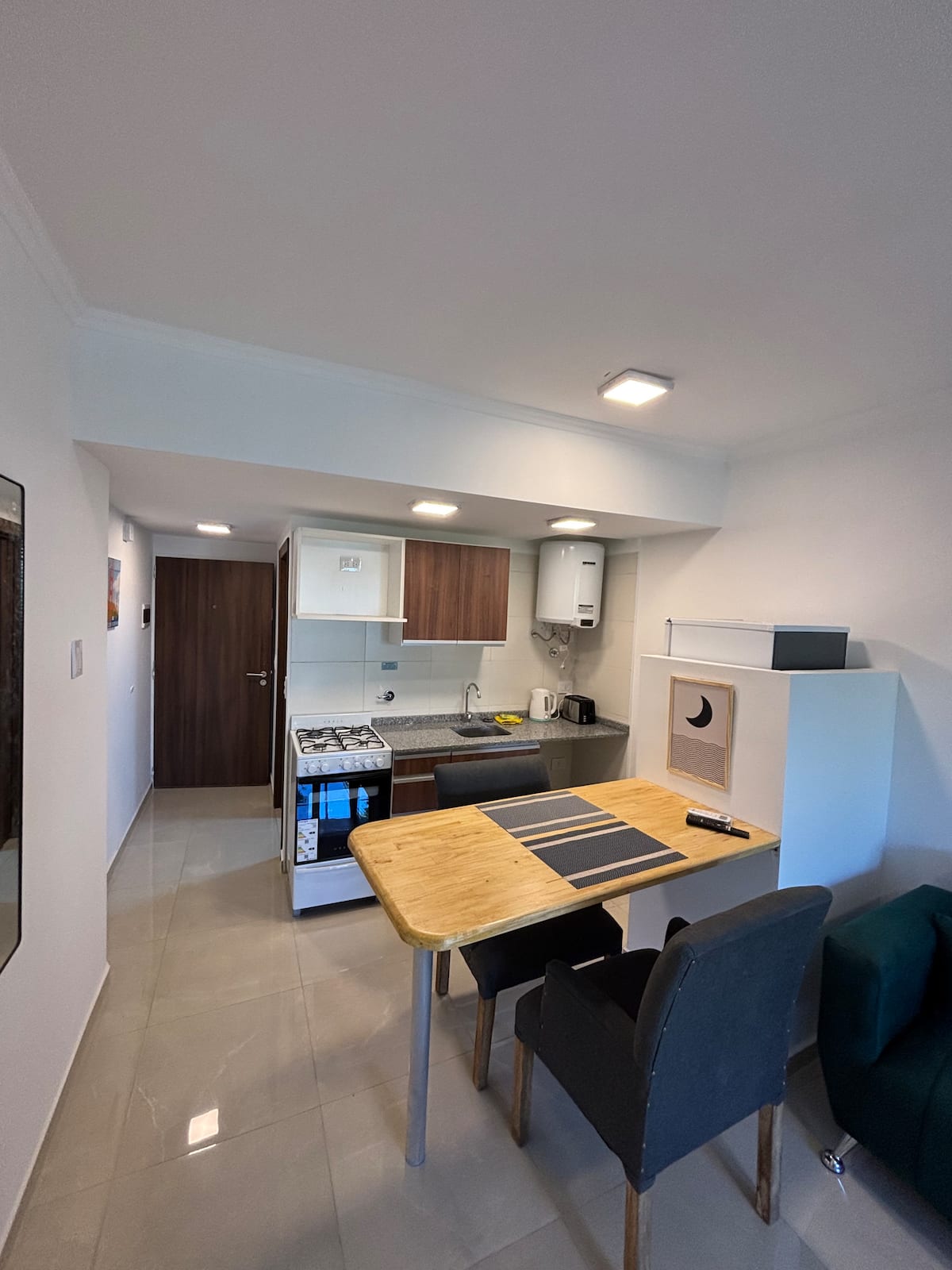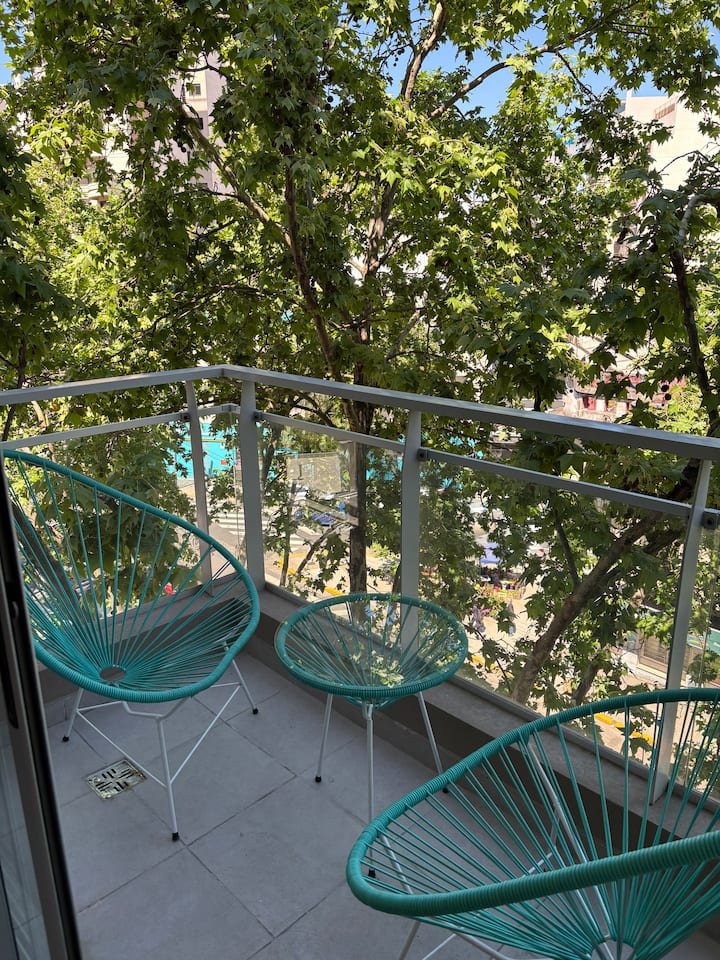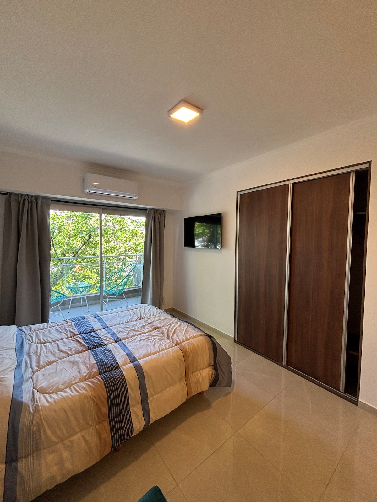 Studio apartment on the 5th floor, street-facing, with a 35 m² total area and a large balcony. Fully equipped modern kitchen with new appliances, one full bathroom, and a double bed, armchair and dining table. The building has a communal SUM, swimming pool, gym and grills. The price includes building fees and services.