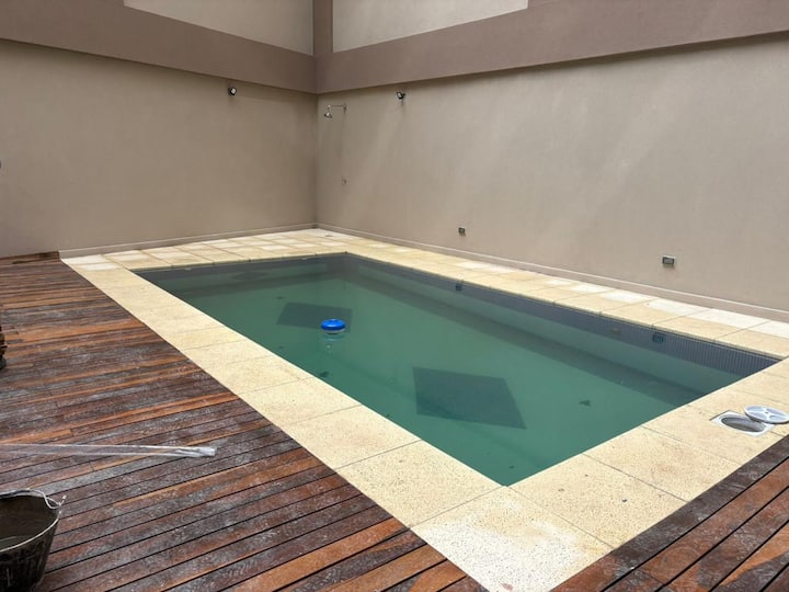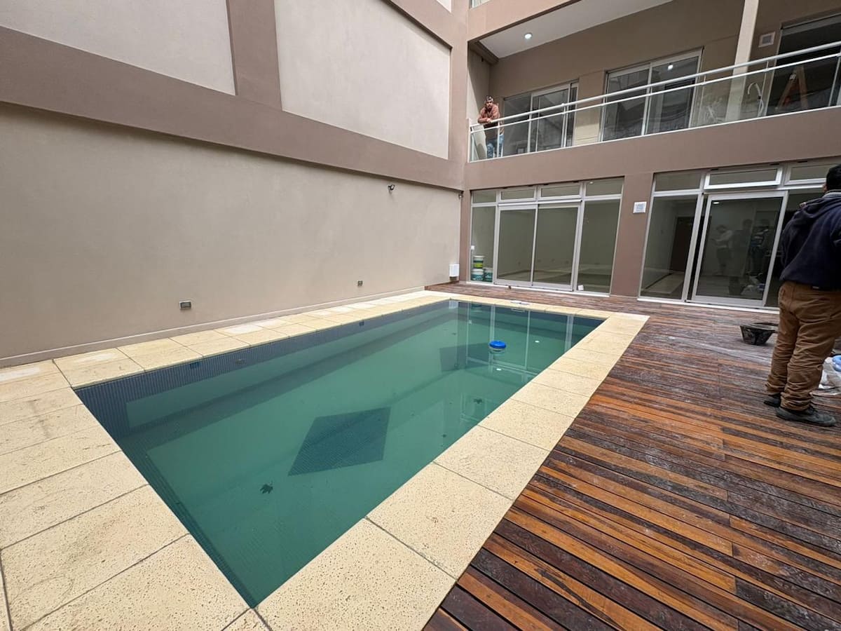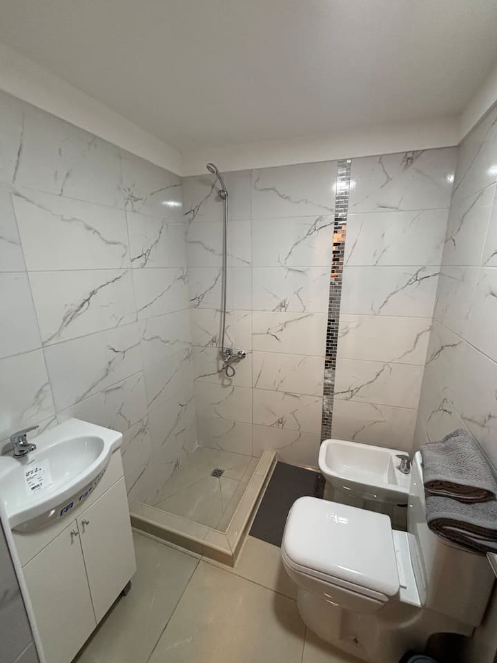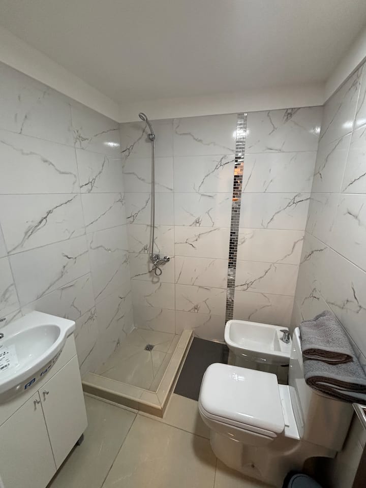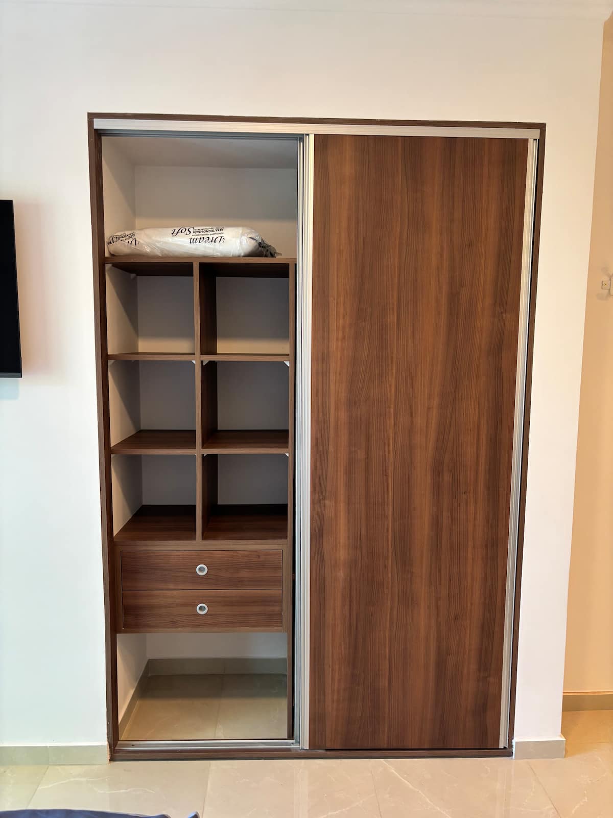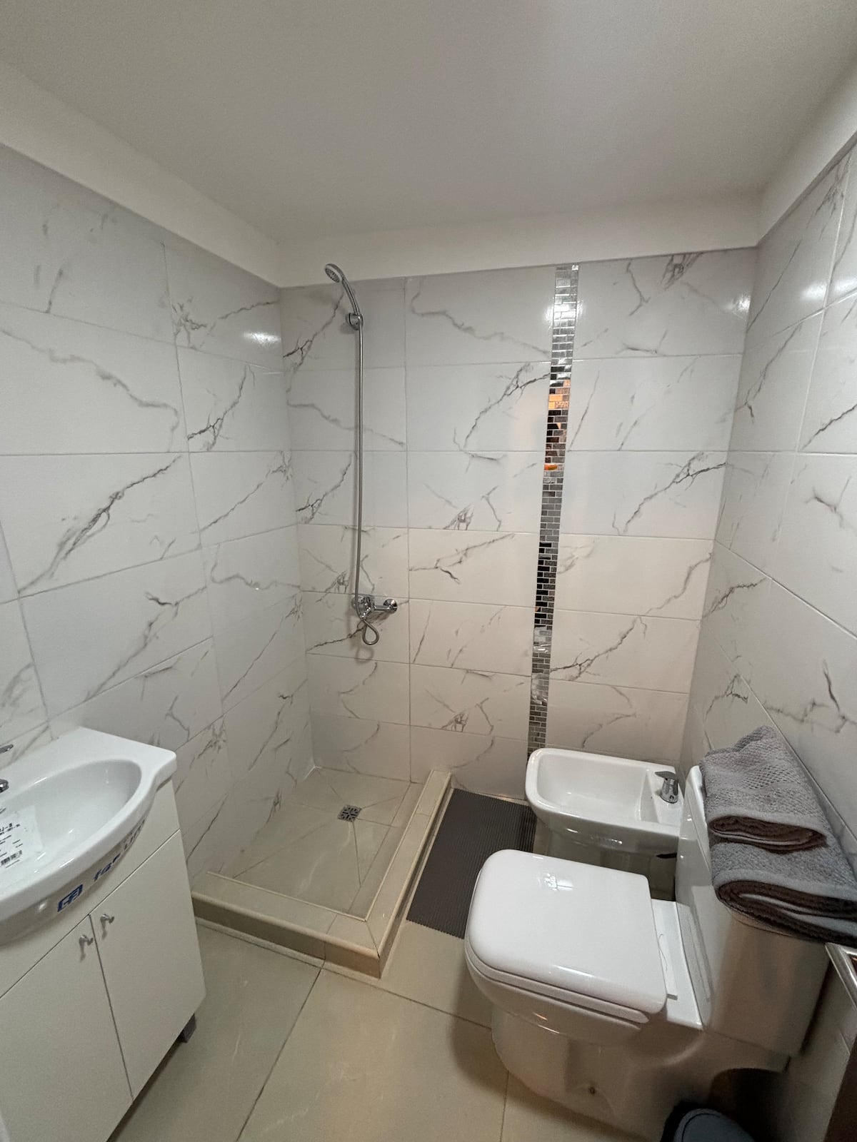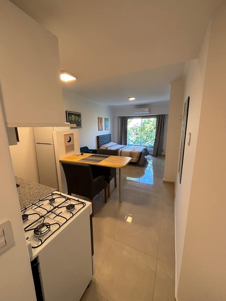 Studio apartment on the 5th floor, street-facing, with a 35 m² total area and a large balcony. Fully equipped modern kitchen with new appliances, one full bathroom, and a double bed, armchair and dining table. The building has a communal SUM, swimming pool, gym and grills. The price includes building fees and services.