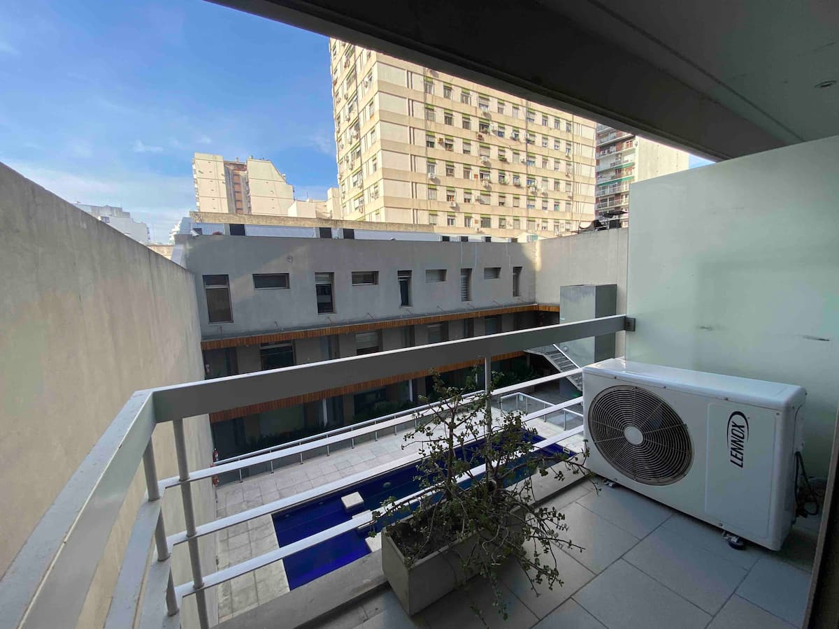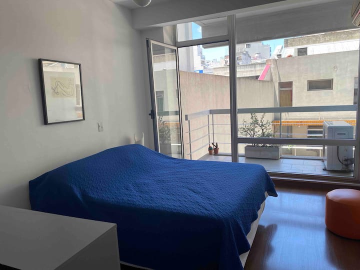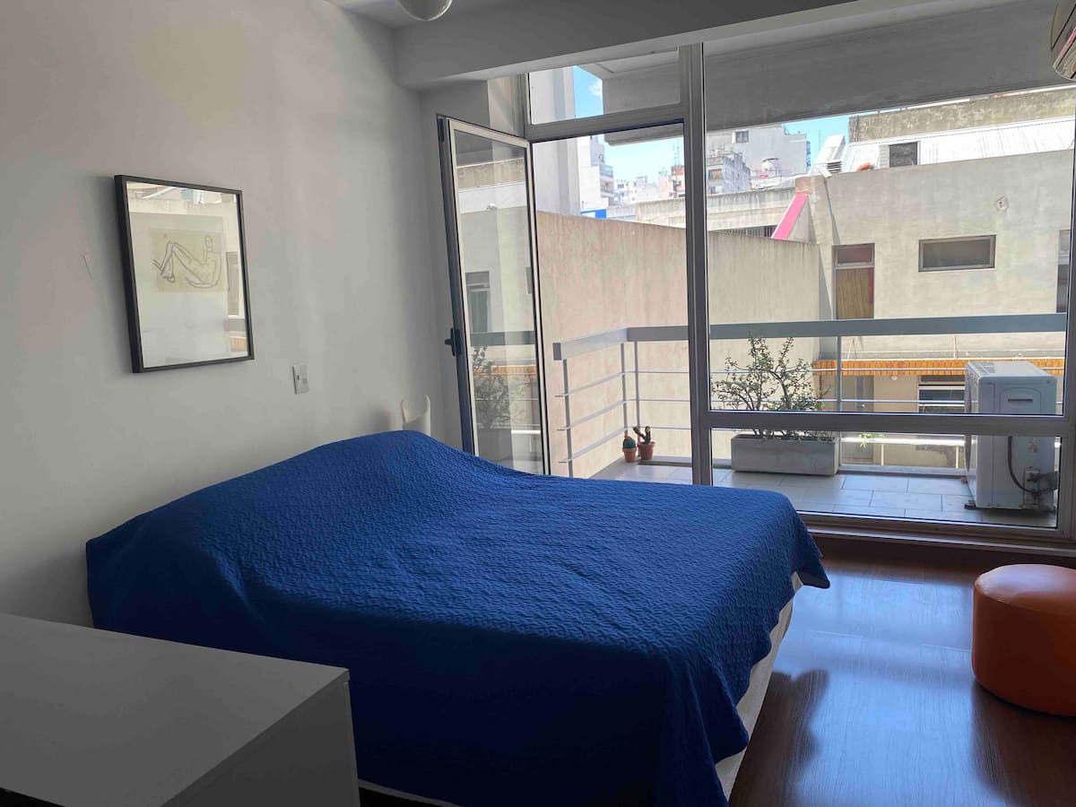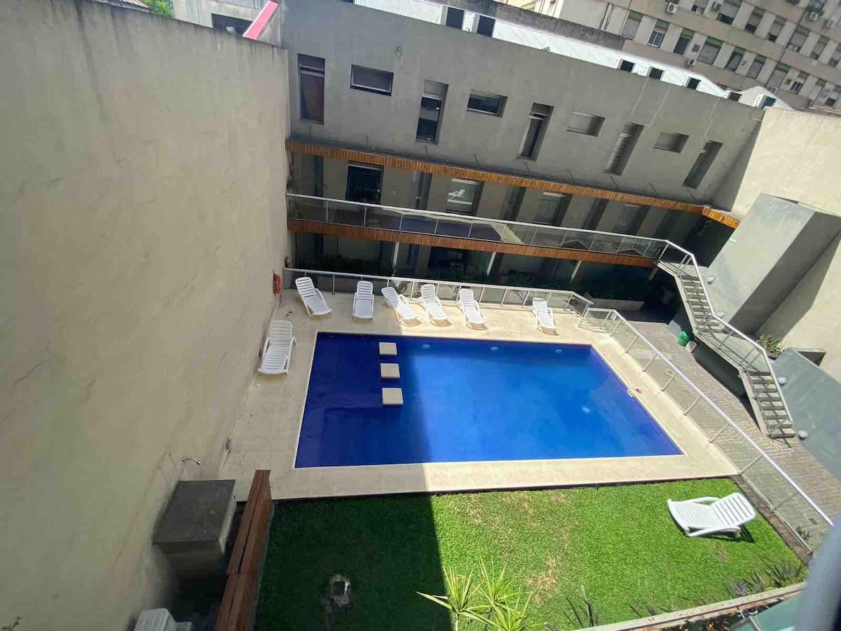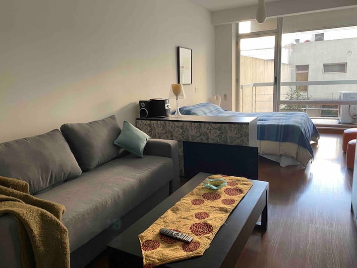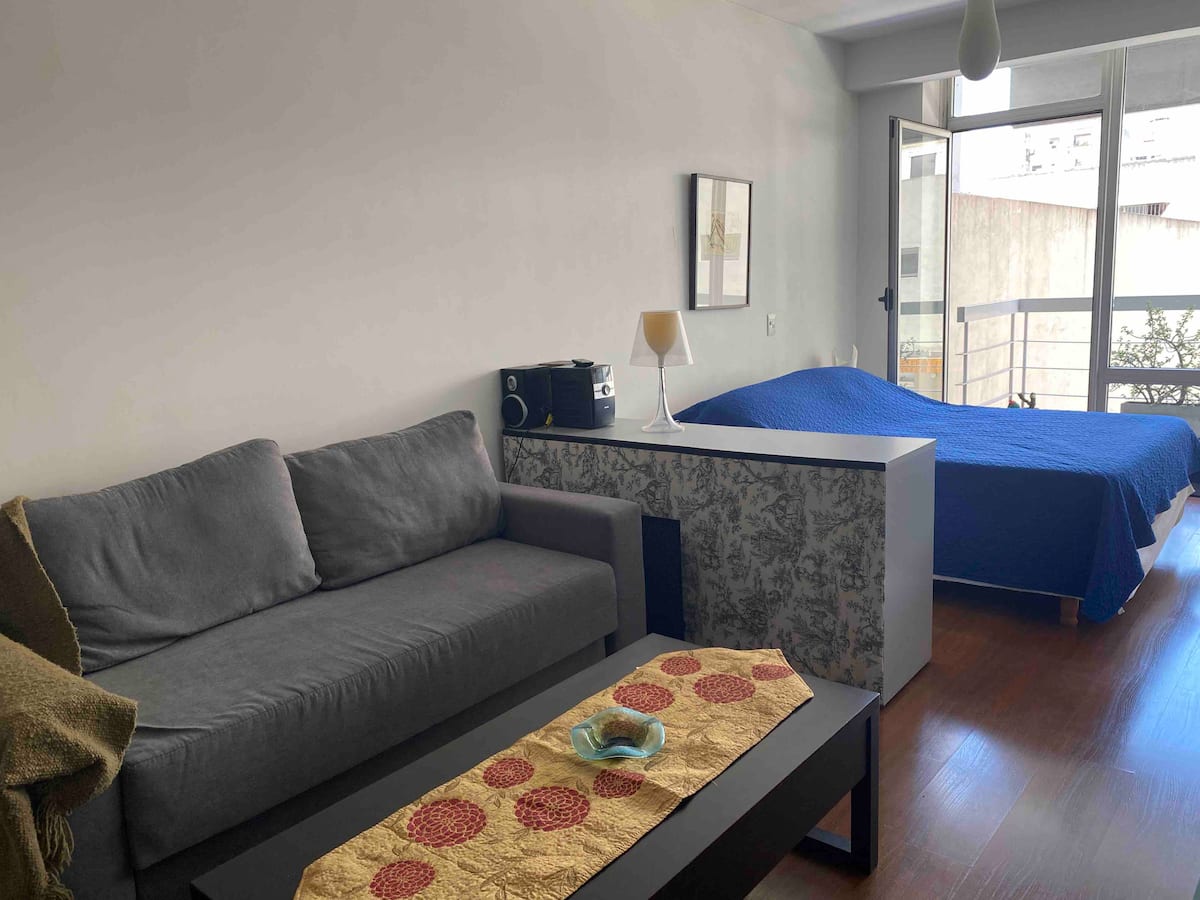 Modern studio apartment in Villa Crespo with 24-hour security. The building has a pool available only from January to March and a laundry room on the top floor with a washer and dryer that operate with tokens purchased nearby. The apartment has a sofa bed and a two-seater bed; parties are not allowed and only registered guests may enter the building.
