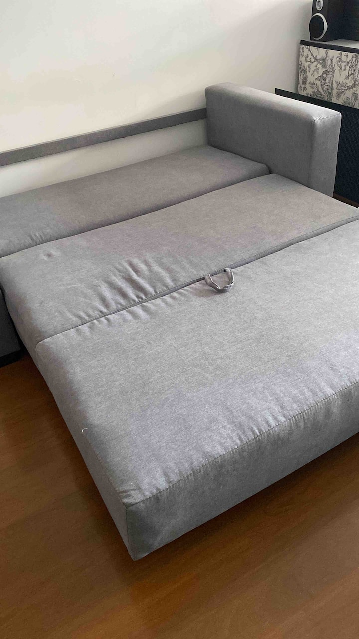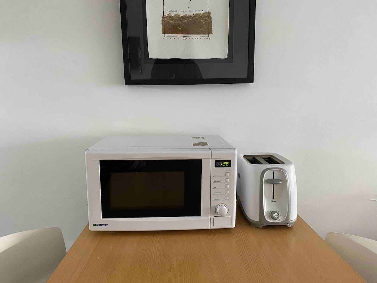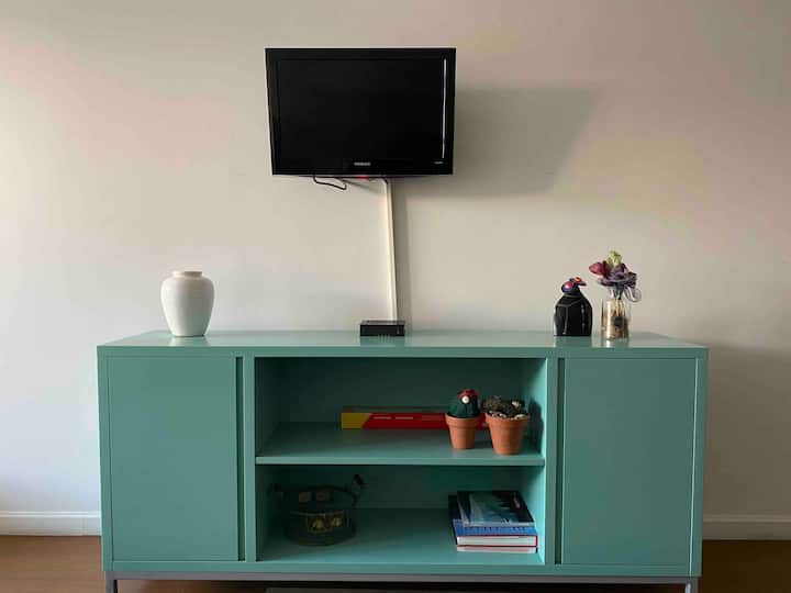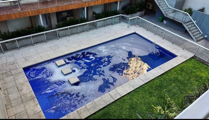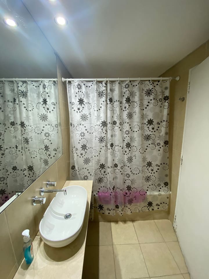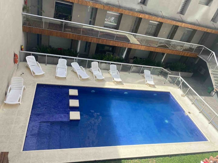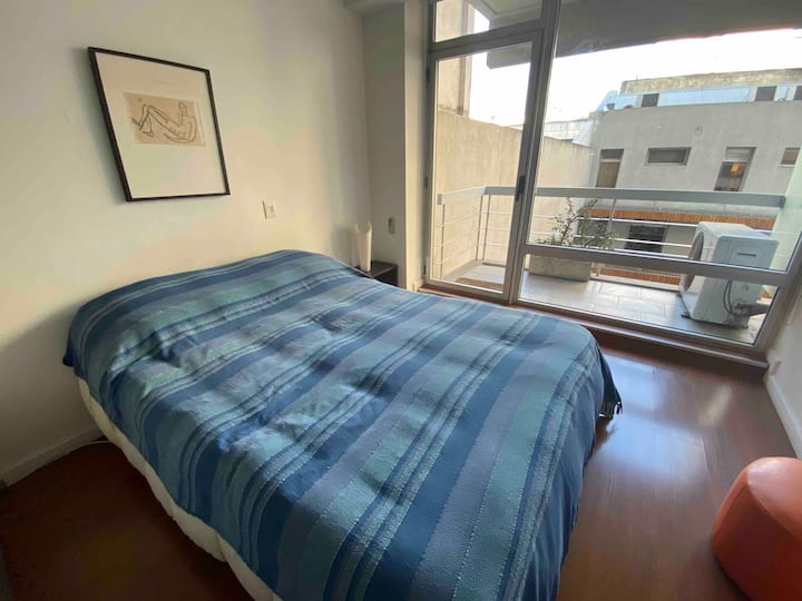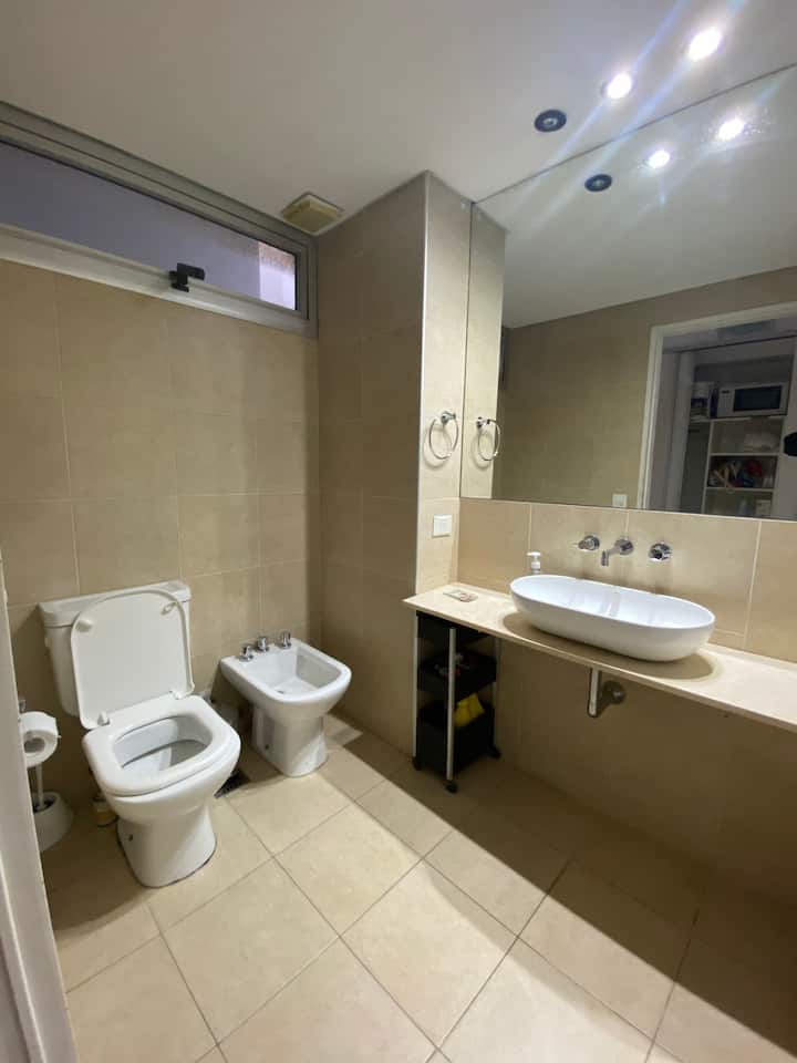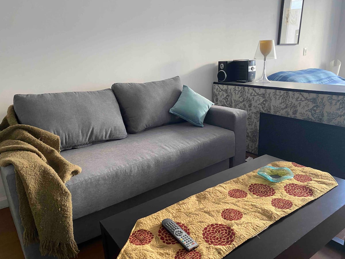 Modern studio apartment in Villa Crespo with 24-hour security. The building has a pool available only from January to March and a laundry room on the top floor with a washer and dryer that operate with tokens purchased nearby. The apartment has a sofa bed and a two-seater bed; parties are not allowed and only registered guests may enter the building.