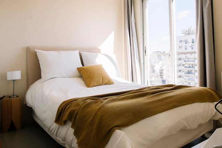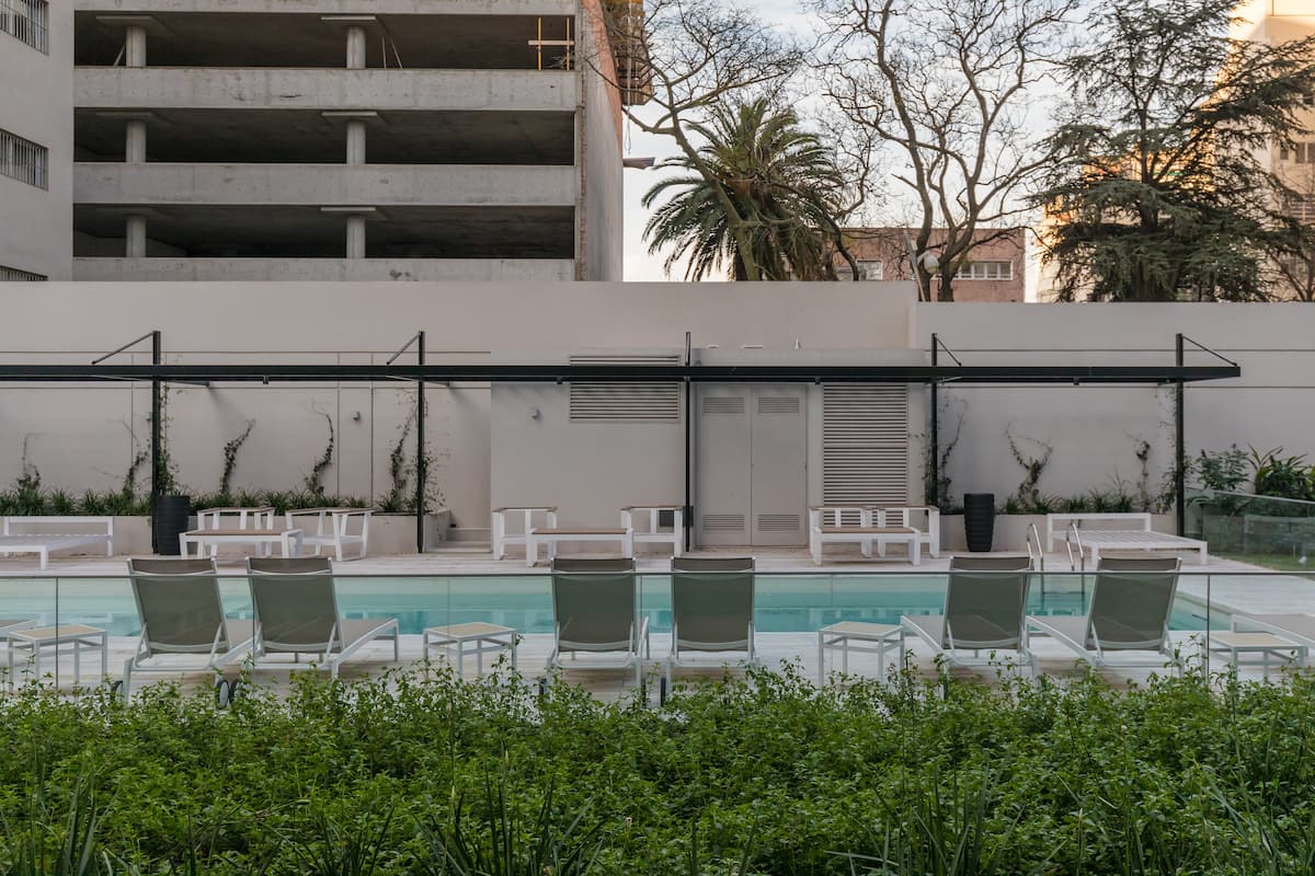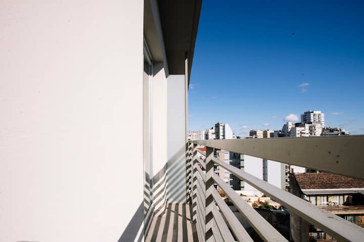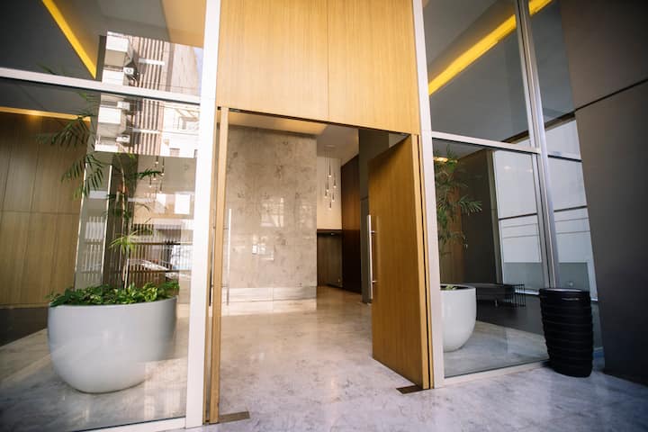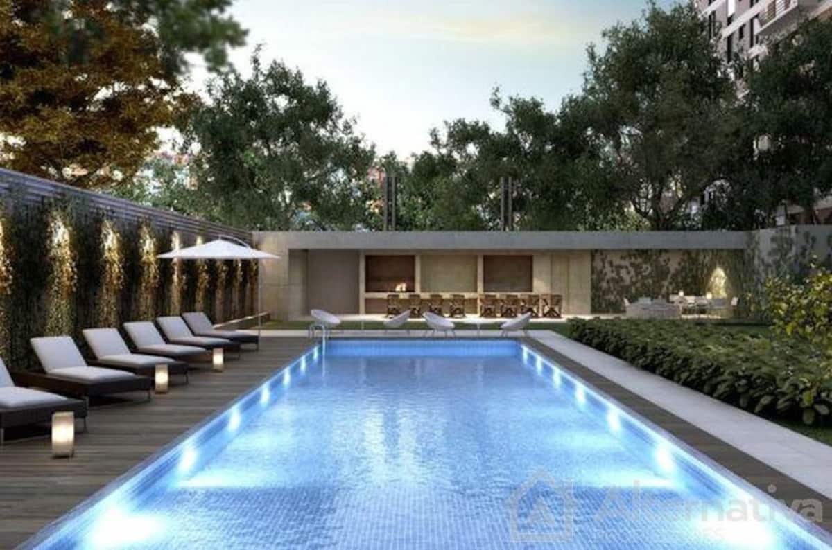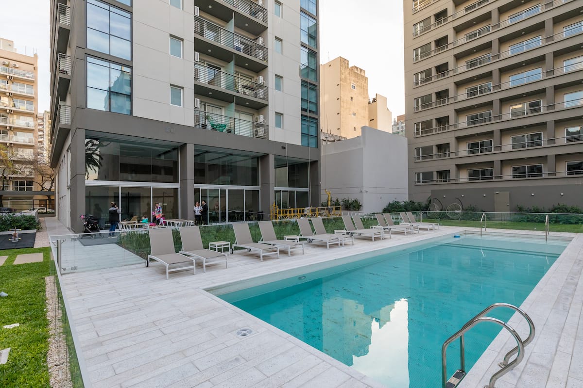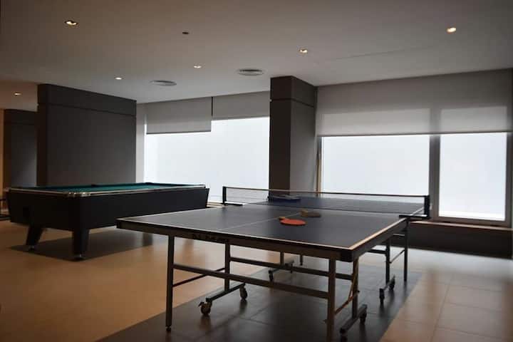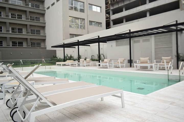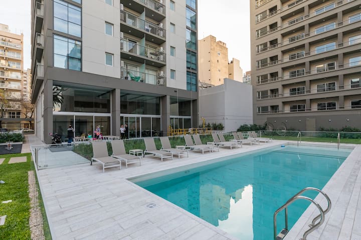 Furnished and fully equipped studio apartment in a modern tower. Building amenities include a swimming pool, gym, laundry room with a washer and dryer, a game room and outdoor green space.