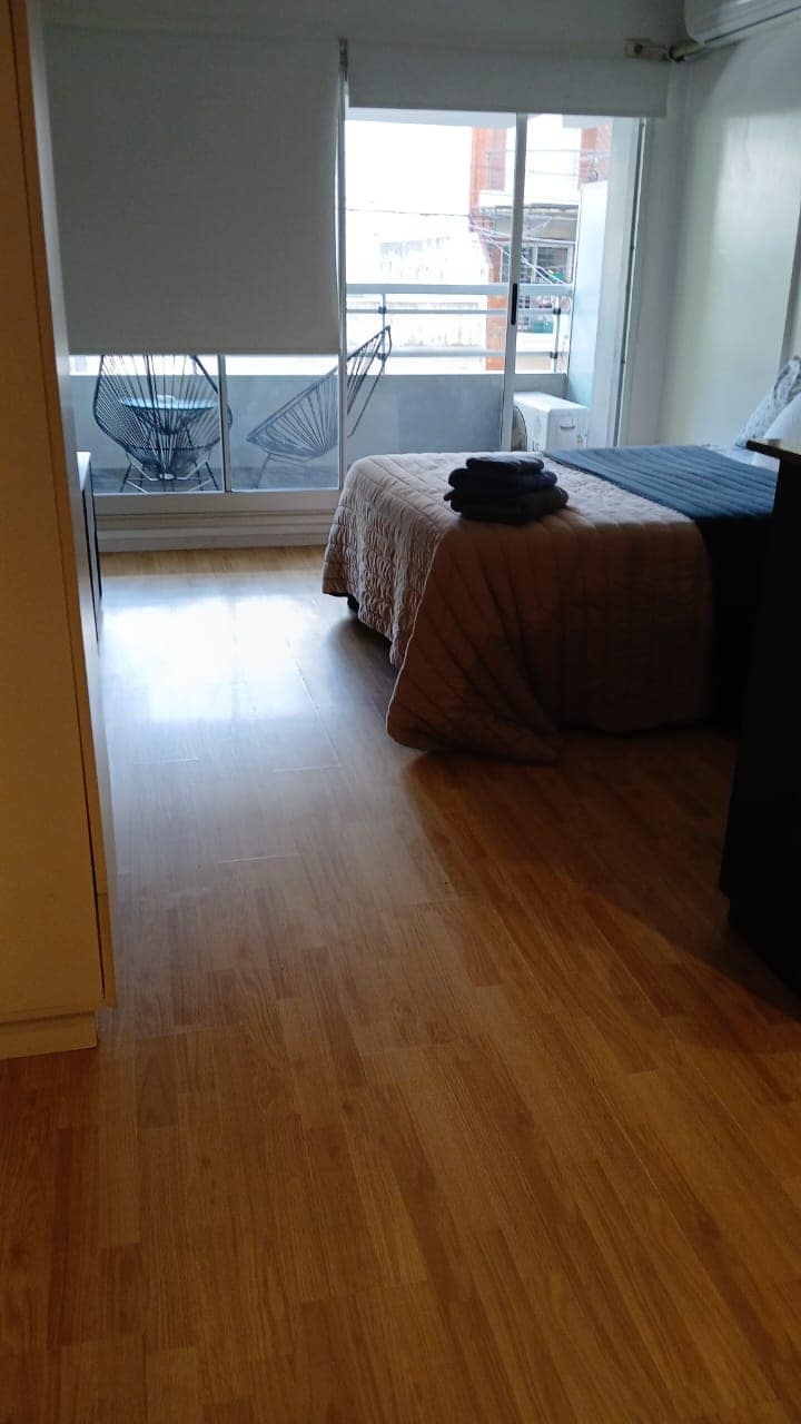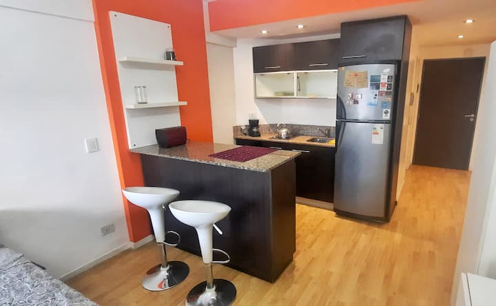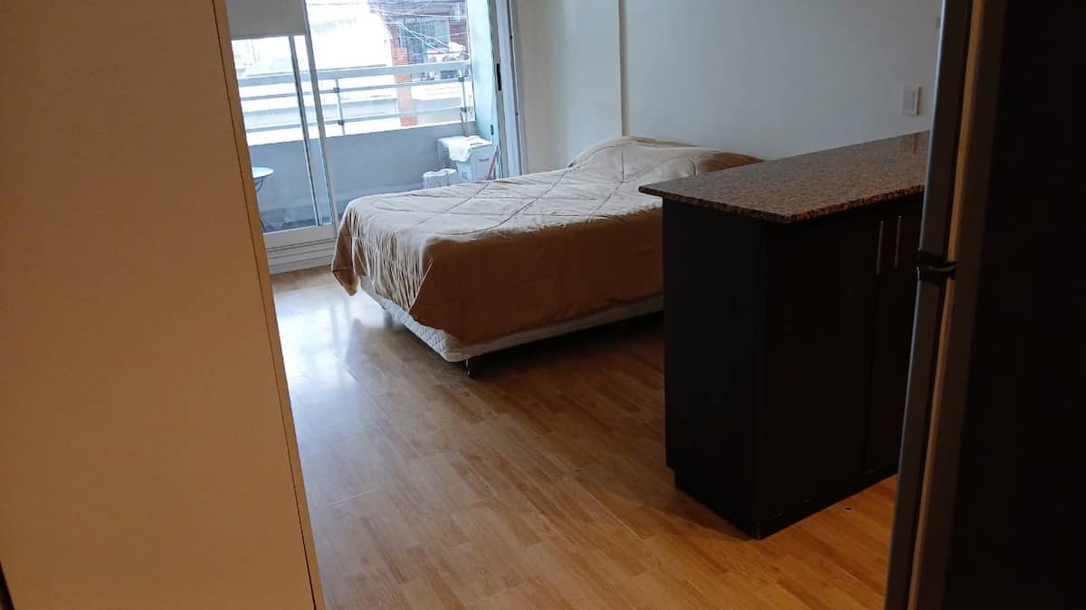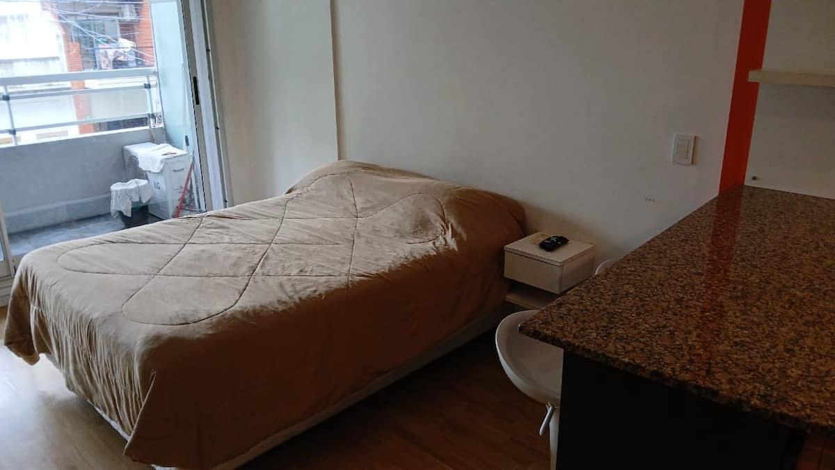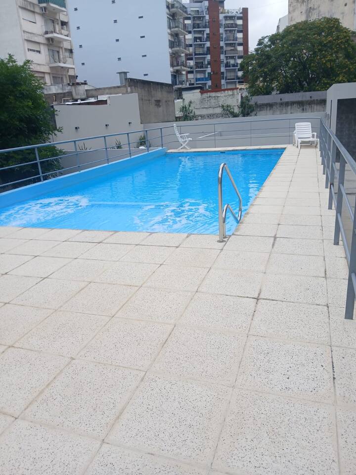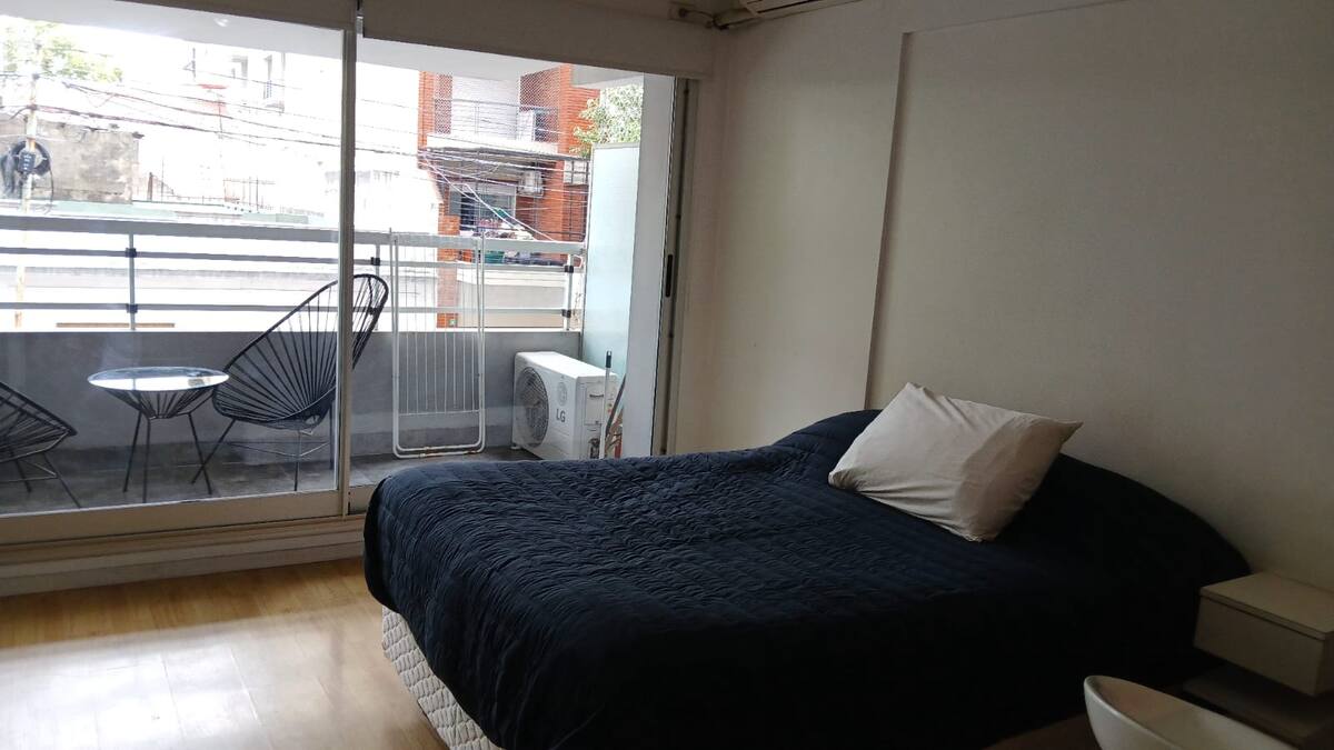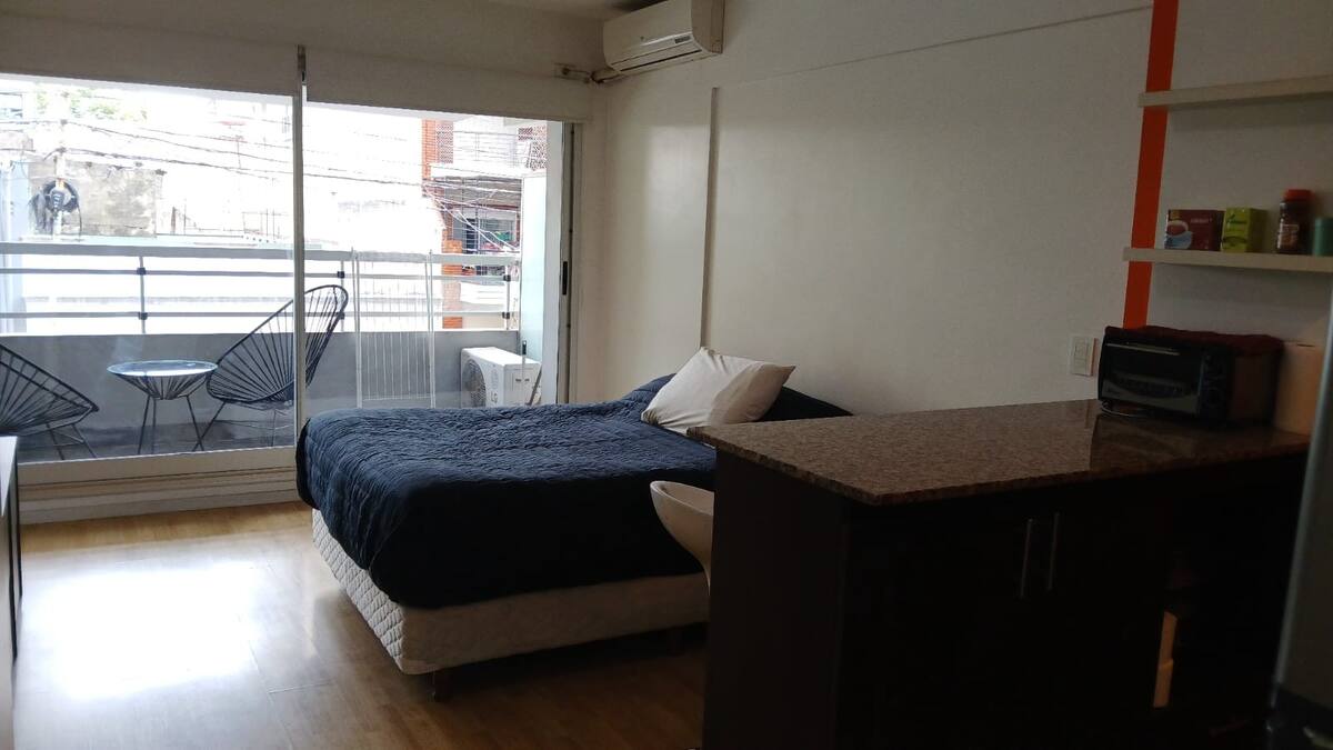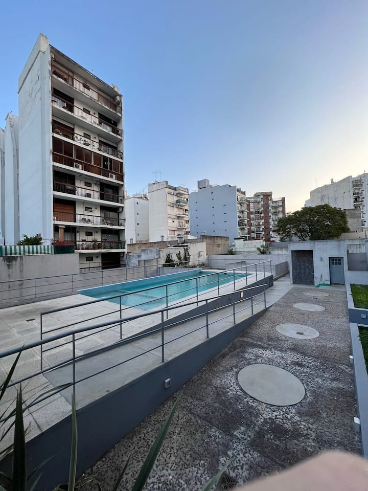 Studio apartment in Villa Crespo. Pool, gym and laundry are available by prior reservation through an online page. Laundry tokens are purchased at a nearby store, and paid parking is available in front of the Garage Caballito building.