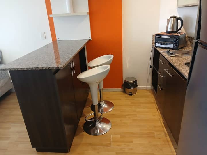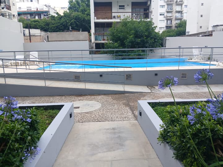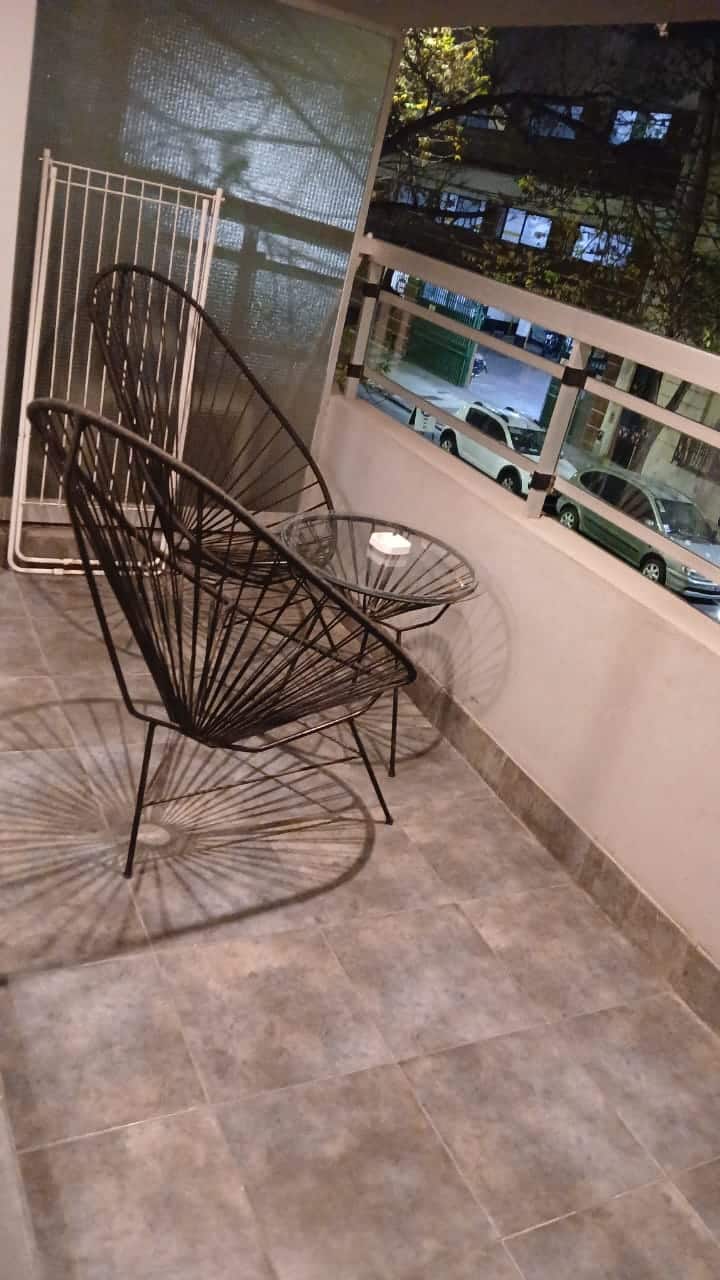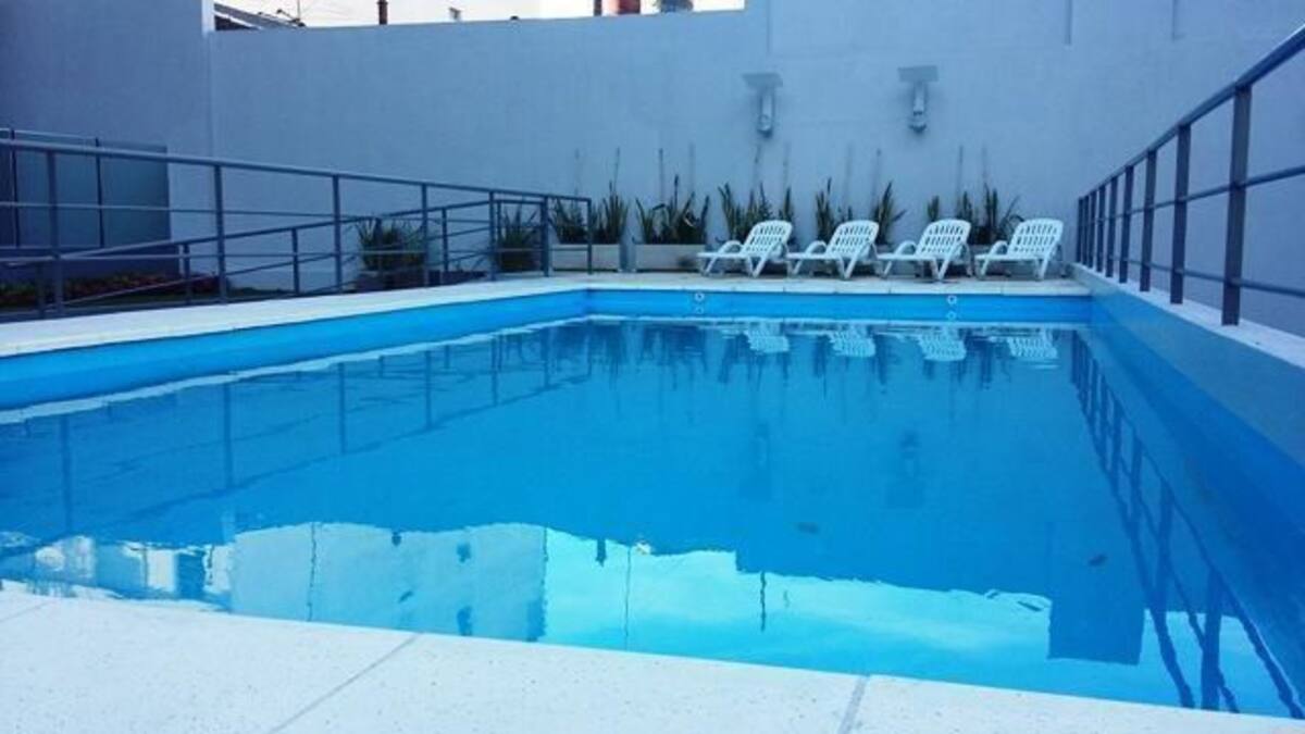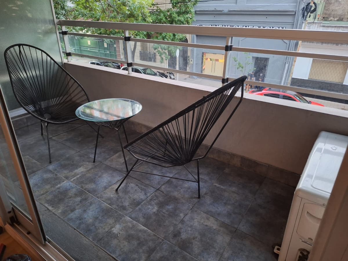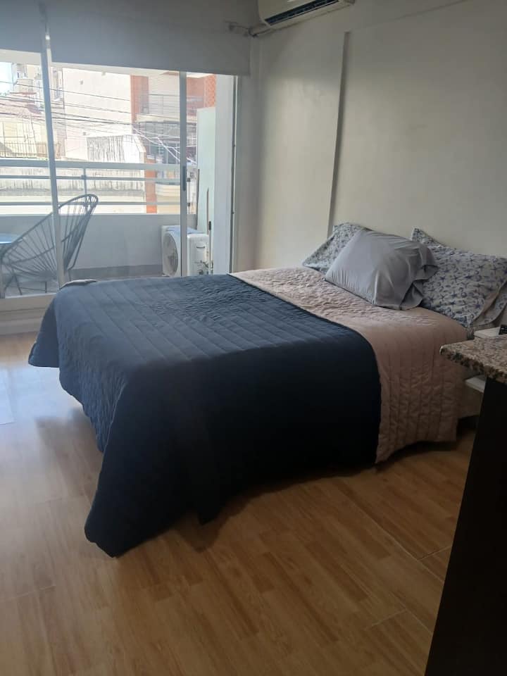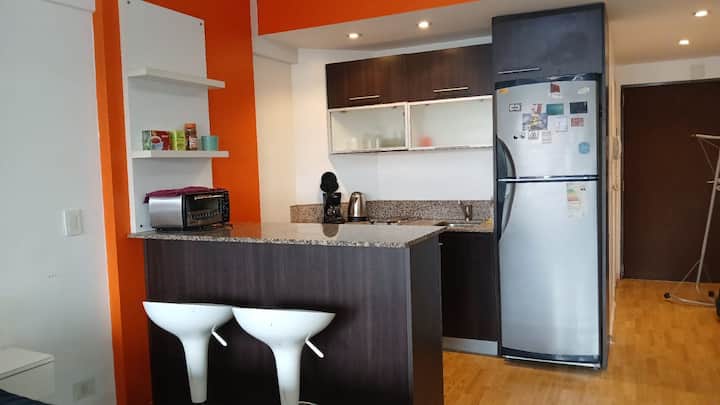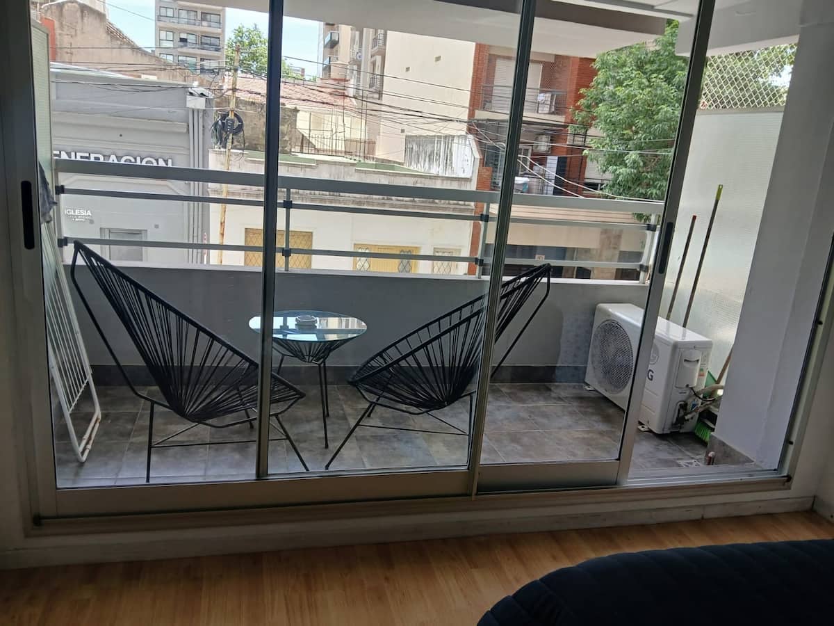 Studio apartment in Villa Crespo. Pool, gym and laundry are available by prior reservation through an online page. Laundry tokens are purchased at a nearby store, and paid parking is available in front of the Garage Caballito building.